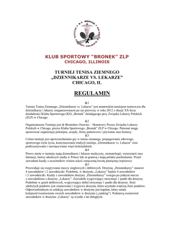 KLUB SPORTOWY “BRONEK” ZLP CHICAGO, ILLINOIS TURNIEJ TENISA ZIEMNEGO „DZIENNIKARZE VS. LEKARZE” CHICAGO, IL REGULAMIN &1 Turniej Tenisa Ziemnego „Dziennikarze vs. Lekarze” jest amatorskim turniejem tenisowym dla dziennikarzy i lekarzy zorganizowanym po raz pierwszy w roku 2012 z okazji XX-lecia działalności Klubu Sportowego (KS) „Bronek” działającego przy Związku Lekarzy Polskich (ZLP) w Chicago. &2 Organizatorem Turnieju jest dr Bronisław Orawiec – Honorowy Prezes Związku Lekarzy Polskich w Chicago, prezes Klubu Sportowego „Bronek” ZLP w Chicago. Patronat mogą sprawować organizacje polonijne, urzędy, firmy państwowe i prywatne oraz biznesy. &3 Celem turnieju jest upowszechnianie gry w tenisa ziemnego, propagowanie zdrowego, sportowego stylu życia, kontynuowanie tradycji turnieju „Dziennikarze vs. Lekarze” oraz podtrzymywanie i nawiązywanie więzi koleżeńskich. &4 Prawo startu w turnieju mają dziennikarze i lekarze medycyny, stomatologii, weterynarii oraz farmacji, którzy ukończyli studia w Polsce lub za granicą i mają polskie pochodzenie. Przed zawodami każdy z uczestników winien uiścić oznaczoną kwotę pieniężną (wpisowe). &5 Przewiduje się rozgrywanie meczy singlowych i deblowych. Drużynę „Dziennikarzy” stanowi 4 zawodników i 2 zawodniczki. Podobnie, w drużynie „Lekarzy” będzie 4 zawodników i 2 zawodniczki. Każdy z zawodników drużyny „Dziennikarzy” rozegra po jednym meczu z zawodnikiem z drużyny „Lekarzy”. Zawodnik wygrywający otrzymuje 1 punkt dla drużyny. Podobnie w grach deblowych, wygrywający debel otrzymuje 1 punkt dla drużyny. Ilość zdobytych punktów jest zsumowana i wygrywa drużyna, która uzyskała większą ilość punktów. Odpowiedzialnym za selekcję zawodników w drużynie jest kapitan, który ustala kolejność/rozstawienie swoich zawodników w drużynie („ranking”). Podstawą rozstawień zawodników w drużynie „Lekarzy” są wyniki z lat ubiegłych. &6 Zawody są rozgrywane zgodnie z regulaminem Amerykańskiego Związku Tenisowego (United States Tennis Association, USTA). Turniej rozgrywany jest do dwóch wygranych setów. Przy stanie 6:6 w secie obowiązuje dogrywka („tie break”). Mecze sędziowane są przez osoby grające. W przypadkach problemowych na korcie ostateczną decyzję podejmuje organizator turnieju. &7 Okres oczekiwania na przeciwnika wynosi 15 minut od godziny rozpoczęcia gry. Po tym czasie może nastąpić dyskwalifikacja zawodnika (skrecz). Rozgrzewka trwa 10 minut. W przypadku trzeciego seta obowi¹ązuje 10 minutowa przerwa. &8 Miejscem turnieju są korty tenisowe Lions Park, Prospect Heights. Miejsce turnieju albo poszczególnych meczów może ulec zmianie. Dowiedzenie się o miejscu gry należy do obowiązku uczestnika turnieju. &9 Termin turnieju jest podawany do wiadomości w specjalnym komunikacie oraz w środkach masowego przekazu. Termin zawodów może ulegać zmianom. Dowiedzenie się o terminie rozpoczęcia oraz zakończenia turnieju należy do obowiązku uczestnika turnieju. &10 Prawo wniesienia protestu ma kapitan drużyny. Pisemne protesty należy przesyłać pod adres organizatora zawodów: Bronisław Orawiec, Klub Sportowy „Bronek” Związku Lekarzy Polskich w Chicago, 5428 N. Milwaukee Ave., Chicago, Illinois 60630. Protest zostanie rozpatrzony jeżeli: a) zostanie złożony w czasie rozgrywek, a przed ogłoszeniem końcowych wyników, b) wpłacona zostanie kaucja w wysokości 30 dolarów (w przypadku odrzucenia protestu kaucja nie podlega zwrotowi). &11 Każdy uczestnik podpisuje oświadczenie, że startuje na własną odpowiedzialność i w razie kontuzji lub wypadku nie będzie rościć żadnych pretensji do organizatorów, patronów, sponsorów, miejsca turnieju itp. &12 Organizator przewiduje puchary dla obydwu drużyn. Puchary otrzymują kapitanowie drużyn. W roku 2016 kapitanem drużyny „Dziennikarzy” jest red. Piotr Dąbrowski, natomiast kapitanem drużyny „Lekarzy” jest dr. Bronisław Orawiec. &13 Organizator zastrzega sobie prawo interpretacji i ewentualnej zmiany niniejszego regulaminu. Opracował dr Bronisław Orawiec Chicago, 25 lipca 2016 r. Zatwierdzone przez kapitanów drużyn: Red. Piotra Dąbrowskiego i dr. Bronisława Orawca