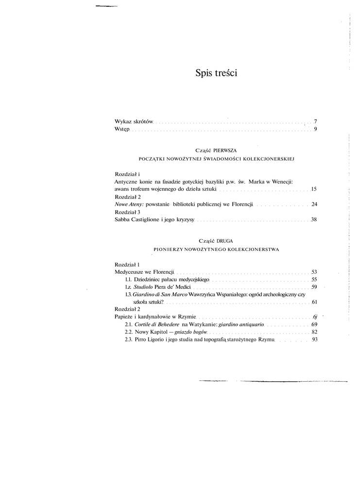 Spis treści Wykaz skrótów Wstęp 7 9 Cząść PIERWSZA POCZĄTKI NOWOŻYTNEJ ŚWIADOMOŚCI KOLEKCJONERSKIEJ Rozdział i Antyczne konie na fasadzie gotyckiej bazyliki p.w. św. Marka w Wenecji: awans trofeum wojennego do dzieła sztuki Rozdział 2 Nowe Ateny: powstanie biblioteki publicznej we Florencji Rozdział 3 Sabba Castiglione i jego kryzysy 15 24 38 Cząść DRUGA PIONIERZY NOWOŻYTNEGO KOLEKCJONERSTWA Rozdział 1 Medyceusze we Florencji 1.1. Dziedziniec pałacu medycejskiego 1.z. Studiolo Piera de' Medici 1.3. Giardino di San Marco Wawrzyńca Wspaniałego: ogród archeologiczny czy szkoła sztuki? Rozdział 2 Papieże i kardynałowie w Rzymie 2.1. Cortile di Behedere na Watykanie: giardino antiąuario 2.2. Nowy Kapitol — gniazdo bogów 2.3. Pirro Ligorio i jego studia nad topografią starożytnego Rzymu 53 55 59 61 6j 69 82 93 Rozdział 3 Muzeum medycejskie epoki pryncypatu: od statuario pubblico do galleria pubblica 3.1. Statuario pubblico na Piazza delia Signoria we Florencji 3.2. Studiolo Franciszka I w Palazzo Vecchio 3.3. Galeria Medycejska w Ufficjach: model nowożytnej ekspozycji artystycznej? Rozdział 4 Rozwój kolekcjonerstwa na terenie Italii Północnej ... 4.1. Grotta Izabeli d'Este na zamku w Mantui 4.2. Weneckie fundacje rodziny Grimanich; Sala delie teste w Palazzo Ducale i Statuario pubblico w antykamarze Biblioteki św. Marka 4.3. Paolo Giovio i jego Musaeum w Como Rozdział 5 Triumf kolekcjonerstwa w Europie 5.1. Fontainebleau - la seconda Roma: wyraz politycznych aspiracji Walezjuszów 5.2. Antiquarium Wittelsbąchów w Monachium: galeria imperatorów rzymskich 5.3. Habsburgowie - ich dokonania 98 IOI 116 129 140 14° 152 159 177 177 186 196 Cząść TRZECIA K O L E K C J O N E R S T W O W EPOCE HISTORIOGRAFII SZTUKI Rozdział 1 Giorgio Vasari i jego rola w realizacji muzeum publicznego we Florencji . . . Rozdział 2 Scola publica w Palazzo Farnese — zabiegi środowiska rzymskiego o utworzenie centralnego muzeum sztuki? Rozdział 3 Sztuka wczesnochrześcijańska na Jubileuszu roku 1600 Rozdział 4 Zjawisko kopii i historiografia sztuki Rozdział 5 Podróże do Italii - XVI wiek Zakończenie Bibliografia Wykaz ilustracji II museo e le collezioni artistiche nellepoca moderna. Secoli XV eXVI. Parte I Indeks nazwisk 211 228 245 260 281 291 299 323 329 333 PPN: 260811025 Titel: Muzeum i zbiory artystyczne epoki nowoçzytnej ; Zygmunt Wa´zbi´nski. - . - Wyd. Uniwersytetu Miko±aja Kopernika Toru´n 2006 ISBN: 83-231-1942-2 Bibliographischer Datensatz im SWB-Verbund