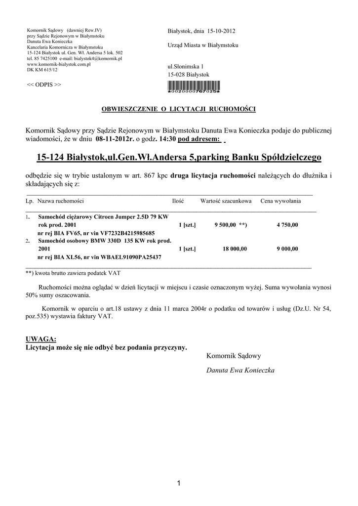 Komornik Sądowy (dawniej Rew.IV) przy Sądzie Rejonowym w Białymstoku Danuta Ewa Konieczka Kancelaria Komornicza w Białymstoku 15-124 Białystok ul. Gen. Wł. Andersa 5 lok. 502 tel. 85 7425100 e-mail: [email protected] www.komornik-bialystok.com.pl DK KM 615/12 Białystok, dnia 15-10-2012 << ODPIS >> *0020000767025* Urząd Miasta w Białymstoku ul.Słonimska 1 15-028 Białystok OBWIESZCZENIE O LICYTACJI RUCHOMOŚCI Komornik Sądowy przy Sądzie Rejonowym w Białymstoku Danuta Ewa Konieczka podaje do publicznej wiadomości, że w dniu 08-11-2012r. o godz. 14:30 pod adresem: 15-124 Białystok,ul.Gen.Wł.Andersa 5,parking Banku Spółdzielczego odbędzie się w trybie ustalonym w art. 867 kpc druga licytacja ruchomości należących do dłużnika i składających się z: _______________________________________________________________________________________________________________________ Lp. Nazwa ruchomości Ilość Wartość szacunkowa Cena wywołania _________________________________________________________________________________________________________________________ 1. 2. Samochód ciężarowy Citroen Jumper 2.5D 79 KW rok prod. 2001 nr rej BIA FV65, nr vin VF7232B4215985685 Samochód osobowy BMW 330D 135 KW rok prod. 2001 nr rej BIA XL56, nr vin WBAEL91090PA25437 1 [szt.] 9 500,00 **) 4 750,00 1 [szt.] 18 000,00 9 000,00 _______________________________________________________________________________________________________________________ **) kwota brutto zawiera podatek VAT Ruchomości można oglądać w dzień licytacji w miejscu i czasie oznaczonym wyżej. Suma wywołania wynosi 50% sumy oszacowania. Komornik w oparciu o art.18 ustawy z dnia 11 marca 2004r o podatku od towarów i usług (Dz.U. Nr 54, poz.535) wystawia faktury VAT. UWAGA: Licytacja może się nie odbyć bez podania przyczyny. Komornik Sądowy Danuta Ewa Konieczka 1