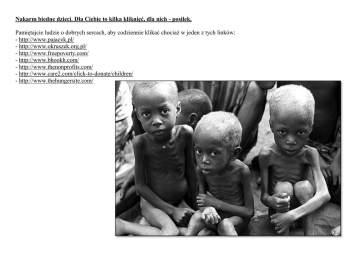 Nakarm biedne dzieci. Dla Ciebie to kilka kliknięć, dla nich - posiłek. Pamiętajcie ludzie o dobrych sercach, aby codziennie klikać chociaż w jeden z tych linków: - http://www.pajacyk.pl/ - http://www.okruszek.org.pl/ - http://www.freepoverty.com/ - http://www.bhookh.com/ - http://www.thenonprofits.com/ - http://www.care2.com/click-to-donate/children/ - http://www.thehungersite.com/
