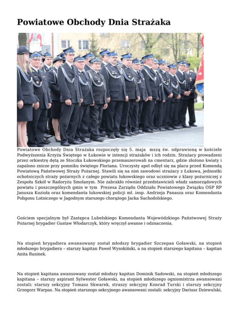 Powiatowe Obchody Dnia Strażaka Powiatowe Obchody Dnia Strażaka rozpoczęły się 5. maja mszą św. odprawioną w kościele Podwyższenia Krzyża Świętego w Łukowie w intencji strażaków i ich rodzin. Strażacy prowadzeni przez orkiestrę dętą ze Stoczka Łukowskiego przemaszerowali na cmentarz, gdzie złożono kwiaty i zapalono znicze przy pomniku świętego Floriana. Uroczysty apel odbył się na placu przed Komendą Powiatową Państwowej Straży Pożarnej. Stawili się na nim zawodowi strażacy z Łukowa, jednostki ochotniczych straży pożarnych z całego powiatu łukowskiego oraz uczniowie z klasy pożarniczej z Zespołu Szkół w Radoryżu Smolanym. Nie zabrakło również przedstawicieli władz samorządowych powiatu i poszczególnych gmin w tym Prezesa Zarządu Oddziału Powiatowego Związku OSP RP Janusza Kozioła oraz komendanta łukowskiej policji mł. insp. Andrzeja Panasza oraz Komendanta Poligonu Lotniczego w Jagodnym starszego chorążego Jacka Suchodolskiego. Gościem specjalnym był Zastępca Lubelskiego Komendanta Wojewódzkiego Państwowej Straży Pożarnej brygadier Gustaw Włodarczyk, który wręczył awanse i odznaczenia. Na stopień brygadiera awansowany został młodszy brygadier Szczepan Goławski, na stopień młodszego brygadiera – starszy kapitan Paweł Wysokiński, a na stopień starszego kapitana – kapitan Anita Rusinek. Na stopień kapitana awansowany został młodszy kapitan Dominik Sadowski, na stopień młodszego kapitana – starszy aspirant Sylwester Goławski, na stopień młodszego ogniomistrza awansowani zostali: starszy sekcyjny Tomasz Skwarek, straszy sekcyjny Konrad Turski i starszy sekcyjny Grzegorz Warpas. Na stopień starszego sekcyjnego awansowani zostali: sekcyjny Dariusz Dziewulski, sekcyjny Piotr Jasiński, sekcyjny Michał Łukasik, sekcyjny Grzegorz Szczęśniak, sekcyjny Paweł Tarasiuk, sekcyjny Mariusz Zalewski i sekcyjny Łukasz Zemło. Minister Spraw Wewnętrznych przyznał jedną srebrna oraz trzy brązowe Odznaki zasłużony dla ochrony przeciwpożarowej. Srebrną odznakę otrzymał brygadier Krzysztof Jankowski. Brązowe – młodszy brygadier Paweł Wysokiński, aspirant sztabowy Artur Chutny oraz starszy ogniomistrz Andrzej Kania. Minister Obrony Narodowej przyznał złoty, srebrny i dwa brązowe Medale za zasługi dla obronności kraju. Złoty medal otrzymał brygadier Szczepan Goławski, srebrny – starszy brygadier Andrzej Rusinek, a brązowe – brygadier Krzysztof Jankowski oraz kapitan Bogdan Dębowski. Związek Ochotniczych Straży Pożarnych przyznał trzy Złote Znaki Związku, oraz złoty i brązowy Medal za zasługi dla pożarnictwa. Złote Znaki Związku otrzymali: druhna Barbara Rosa, druh Stanisław Balak oraz druh Marek Grochowski. Natomiast medale trafiły do dwóch przedstawicieli Nadleśnictwa Łuków. Złoty medal otrzymał emerytowany nadleśniczy Nadleśnictwa Łuków Zbigniew Kozioł, a brązowy – obecny nadleśniczy Grzegorz Uss. Zapraszamy do obejrzenia GALERII