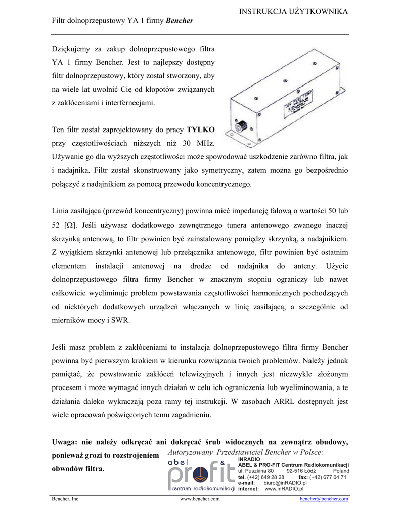 INSTRUKCJA UŻYTKOWNIKA Filtr dolnoprzepustowy YA 1 firmy Bencher Dziękujemy za zakup dolnoprzepustowego filtra YA 1 firmy Bencher. Jest to najlepszy dostępny filtr dolnoprzepustowy, który został stworzony, aby na wiele lat uwolnić Cię od kłopotów związanych z zakłóceniami i interfernecjami. Ten filtr został zaprojektowany do pracy TYLKO przy częstotliwościach niższych niż 30 MHz. Używanie go dla wyższych częstotliwości może spowodować uszkodzenie zarówno filtra, jak i nadajnika. Filtr został skonstruowany jako symetryczny, zatem można go bezpośrednio połączyć z nadajnikiem za pomocą przewodu koncentrycznego. Linia zasilająca (przewód koncentryczny) powinna mieć impedancję falową o wartości 50 lub 52 [Ω]. Jeśli używasz dodatkowego zewnętrznego tunera antenowego zwanego inaczej skrzynką antenową, to filtr powinien być zainstalowany pomiędzy skrzynką, a nadajnikiem. Z wyjątkiem skrzynki antenowej lub przełącznika antenowego, filtr powinien być ostatnim elementem instalacji antenowej na drodze od nadajnika do anteny. Użycie dolnoprzepustowego filtra firmy Bencher w znacznym stopniu ograniczy lub nawet całkowicie wyeliminuje problem powstawania częstotliwości harmonicznych pochodzących od niektórych dodatkowych urządzeń włączanych w linię zasilającą, a szczególnie od mierników mocy i SWR. Jeśli masz problem z zakłóceniami to instalacja dolnoprzepustowego filtra firmy Bencher powinna być pierwszym krokiem w kierunku rozwiązania twoich problemów. Należy jednak pamiętać, że powstawanie zakłóceń telewizyjnych i innych jest niezwykle złożonym procesem i może wymagać innych działań w celu ich ograniczenia lub wyeliminowania, a te działania daleko wykraczają poza ramy tej instrukcji. W zasobach ARRL dostępnych jest wiele opracowań poświęconych temu zagadnieniu. Uwaga: nie należy odkręcać ani dokręcać śrub widocznych na zewnątrz obudowy, ponieważ grozi to rozstrojeniem Autoryzowany Przedstawiciel Bencher w Polsce: INRADIO ABEL & PRO-FIT Centrum Radiokomunikacji ul. Puszkina 80 92-516 £ódŸ Poland tel. (+42) 649 28 28 fax: (+42) 677 04 71 [email protected] e-mail: internet: www.inRADIO.pl obwodów filtra. Bencher, Inc www.bencher.com [email protected]
