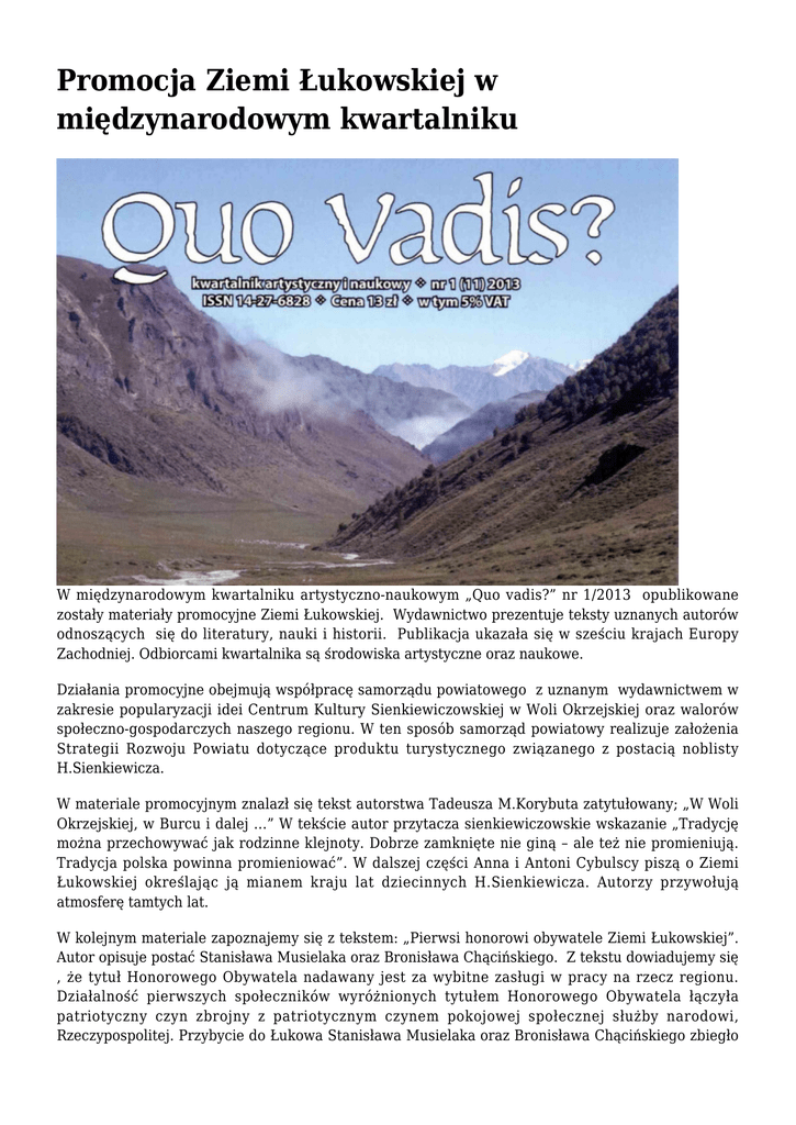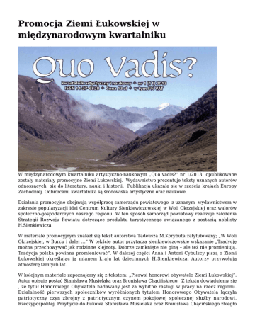 Promocja Ziemi Łukowskiej w międzynarodowym kwartalniku W międzynarodowym kwartalniku artystyczno-naukowym „Quo vadis?” nr 1/2013 opublikowane zostały materiały promocyjne Ziemi Łukowskiej. Wydawnictwo prezentuje teksty uznanych autorów odnoszących się do literatury, nauki i historii. Publikacja ukazała się w sześciu krajach Europy Zachodniej. Odbiorcami kwartalnika są środowiska artystyczne oraz naukowe. Działania promocyjne obejmują współpracę samorządu powiatowego z uznanym wydawnictwem w zakresie popularyzacji idei Centrum Kultury Sienkiewiczowskiej w Woli Okrzejskiej oraz walorów społeczno-gospodarczych naszego regionu. W ten sposób samorząd powiatowy realizuje założenia Strategii Rozwoju Powiatu dotyczące produktu turystycznego związanego z postacią noblisty H.Sienkiewicza. W materiale promocyjnym znalazł się tekst autorstwa Tadeusza M.Korybuta zatytułowany; „W Woli Okrzejskiej, w Burcu i dalej …” W tekście autor przytacza sienkiewiczowskie wskazanie „Tradycję można przechowywać jak rodzinne klejnoty. Dobrze zamknięte nie giną – ale też nie promieniują. Tradycja polska powinna promieniować”. W dalszej części Anna i Antoni Cybulscy piszą o Ziemi Łukowskiej określając ją mianem kraju lat dziecinnych H.Sienkiewicza. Autorzy przywołują atmosferę tamtych lat. W kolejnym materiale zapoznajemy się z tekstem: „Pierwsi honorowi obywatele Ziemi Łukowskiej”. Autor opisuje postać Stanisława Musielaka oraz Bronisława Chącińskiego. Z tekstu dowiadujemy się , że tytuł Honorowego Obywatela nadawany jest za wybitne zasługi w pracy na rzecz regionu. Działalność pierwszych społeczników wyróżnionych tytułem Honorowego Obywatela łączyła patriotyczny czyn zbrojny z patriotycznym czynem pokojowej społecznej służby narodowi, Rzeczypospolitej. Przybycie do Łukowa Stanisława Musielaka oraz Bronisława Chącińskiego zbiegło się z ożywieniem patriotycznym miejscowego społeczeństwa. Zapoczątkowane w latach 1905-1907 rozruchy przybrały postać działań bardziej przemyślanych, przy wykorzystaniu oficjalnych możliwości zrzeszania się w społecznym ruchu oświatowym, sportowym i religijnym. Ważnym wydarzeniem w 1908 roku w samym Łukowie było powołanie Biblioteki Miejskiej. Do wydarzenia tego nawiązuje tekst „Łukowskie pamiątki sienkiewiczowskie”. Kolejnym tekstem promocyjnym jest materiał zatytułowany „XX Zlot Szkół Sienkiewiczowskich” nawiązujący do tradycji tego cyklicznego wydarzenia, którego inicjatorem jest dyrektor Muzeum H.Sienkiewicza w Woli Okrzejskiej – Antoni Cybulski. Z materiału dowiadujemy się także o początkach, które miały charakter pionierski bez doświadczenia, tradycji i środków finansowych. Wnuk pisarza Juliusz Sienkiewicz opowiada o postaci swego dziada. W dalszej części aktor Mieczysław Kalenik mówi o swoich doświadczeniach związanych wieloletnią tradycją zlotów. Podkreślając wyjątkowy charakter oraz rolę Muzeum Henryka Sienkiewicza w Woli Okrzejskiej jako jednej z trzech instytucji w Polsce, wydawca opublikował baner promocyjny. Zachęcamy do zapoznania się z publikacją /PDF/