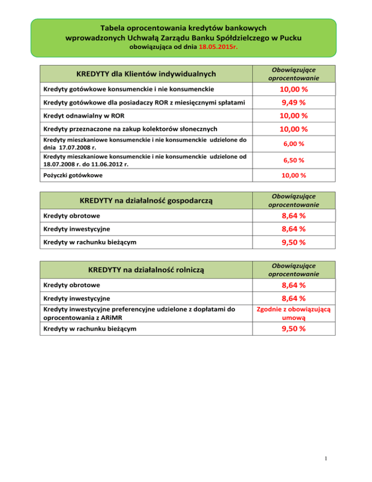 Tabela oprocentowania kredytów bankowych wprowadzonych Uchwałą Zarządu Banku Spółdzielczego w Pucku obowiązująca od dnia 18.05.2015r. KREDYTY dla Klientów indywidualnych Obowiązujące oprocentowanie Kredyty gotówkowe konsumenckie i nie konsumenckie 10,00 % Kredyty gotówkowe dla posiadaczy ROR z miesięcznymi spłatami 9,49 % Kredyt odnawialny w ROR 10,00 % Kredyty przeznaczone na zakup kolektorów słonecznych 10,00 % Kredyty mieszkaniowe konsumenckie i nie konsumenckie udzielone do dnia 17.07.2008 r. Kredyty mieszkaniowe konsumenckie i nie konsumenckie udzielone od 18.07.2008 r. do 11.06.2012 r. Pożyczki gotówkowe KREDYTY na działalność gospodarczą 6,00 % 6,50 % 10,00 % Obowiązujące oprocentowanie Kredyty obrotowe 8,64 % Kredyty inwestycyjne 8,64 % Kredyty w rachunku bieżącym 9,50 % KREDYTY na działalność rolniczą Obowiązujące oprocentowanie Kredyty obrotowe 8,64 % Kredyty inwestycyjne 8,64 % Kredyty inwestycyjne preferencyjne udzielone z dopłatami do oprocentowania z ARiMR Kredyty w rachunku bieżącym Zgodnie z obowiązującą umową 9,50 % 1 Tabela oprocentowania kredytów bankowych w Banku Spółdzielczy w Pucku ustalonych w oparciu o stawkę WIBOR 3M + stała marża Banku obowiązująca od dnia 01.01.2017r. do dnia 31.03.2017r. Wyliczenie oprocentowania – 1,73% plus marża stała Kredyty mieszkaniowe zabezpieczone hipotecznie Obowiązujące oprocentowanie 1,5% 3,23% 3,73% Kredyty gotówkowe zabezpieczone hipotecznie Obowiązujące oprocentowanie 6% 2,5% Obowiązujące oprocentowanie 4% Obowiązujące oprocentowanie Kredyty obrotowe / płatnicze Obowiązujące oprocentowanie Kredyty hipoteczny dla klientów instytucjonalnych Obowiązujące oprocentowanie Kredyty na nieruchomości pozostałe Obowiązujące oprocentowanie 2% 3,73% 3,5% 5,23% 2,5% 4,23% 2% 3,73% 3% 4,73% 3,5% 5,23% 4% 5,73% 8% 9,73% 4,5% 6,23% 5% 5,73% 6,73% Kredyty inwestycyjne 4,23% 3,5% 4,23% 5,23% Pożyczki hipoteczne zabezpieczone hipotecznie 2,5% 7% 7,73% 8,73% Kredyty konsolidacyjne zabezpieczone hipotecznie Obowiązujące oprocentowanie 2% 5,5% 7,23% 6% 7,73% 2,5% 4,23% 4% 5,73% 3% 4,73% 3% 4,73% 4,5% 6,23% 4% 5,73% 3,5% 5,23% 4% 5,73% 5% 6,73% 4,5% 6,23% 5% 6,73% 3% 4,73% 2 WSPÓLNOTY MIESZKANIOWE Okres kredytowania do 5 lat Marża 3% Kwota kredytu 3,5% 4% Do 50.000,00 zł --- --- 5,73% Od 50.000,00 zł Do 100.000,00 zł --- 5,23% --- 4,73% --- --- Powyżej 100.000,00 zł WSPÓLNOTY MIESZKANIOWE Okres kredytowania od 5 lat Marża Kwota kredytu 3,5% 4% 4,5% Do 50.000,00 zł --- --- 6,23% Od 50.000,00 zł Do 100.000,00 zł --- 5,73% --- 5,23% --- --- Powyżej 100.000,00 zł 3