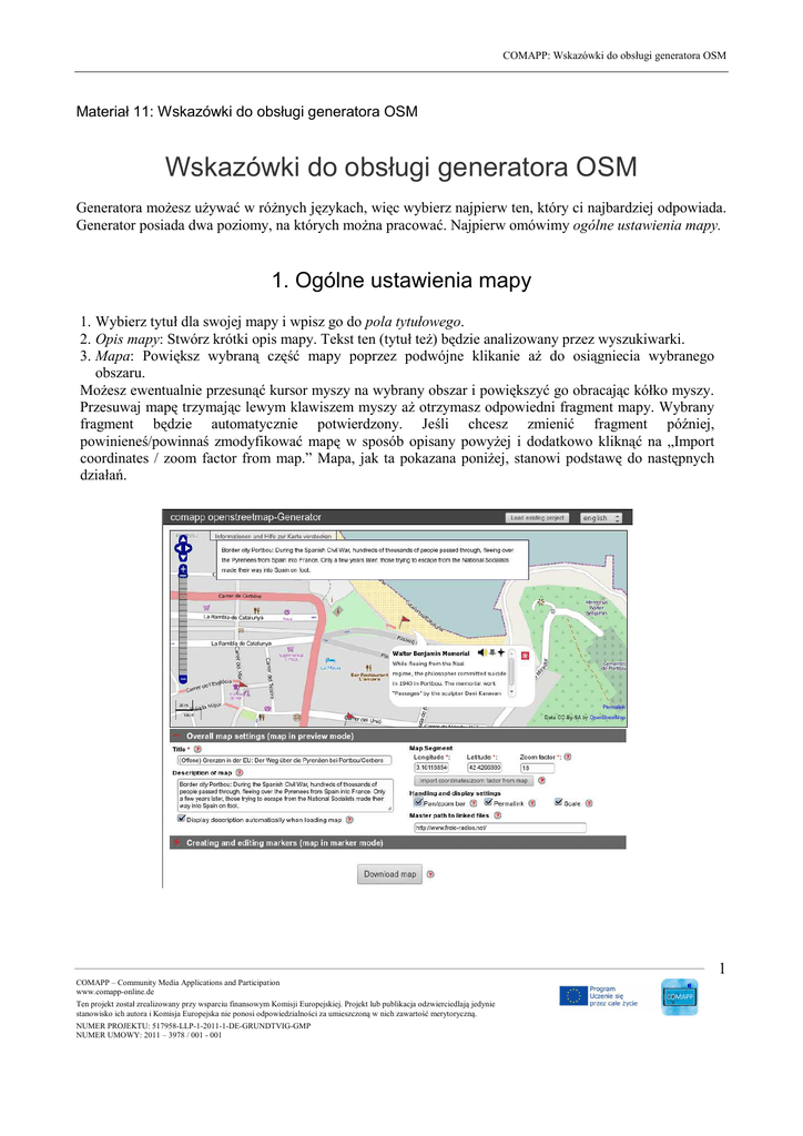 COMAPP: Wskazówki do obsługi generatora OSM Materiał 11: Wskazówki do obsługi generatora OSM Wskazówki do obsługi generatora OSM Generatora możesz używać w różnych językach, więc wybierz najpierw ten, który ci najbardziej odpowiada. Generator posiada dwa poziomy, na których można pracować. Najpierw omówimy ogólne ustawienia mapy. 1. Ogólne ustawienia mapy 1. Wybierz tytuł dla swojej mapy i wpisz go do pola tytułowego. 2. Opis mapy: Stwórz krótki opis mapy. Tekst ten (tytuł też) będzie analizowany przez wyszukiwarki. 3. Mapa: Powiększ wybraną część mapy poprzez podwójne klikanie aż do osiągniecia wybranego obszaru. Możesz ewentualnie przesunąć kursor myszy na wybrany obszar i powiększyć go obracając kółko myszy. Przesuwaj mapę trzymając lewym klawiszem myszy aż otrzymasz odpowiedni fragment mapy. Wybrany fragment będzie automatycznie potwierdzony. Jeśli chcesz zmienić fragment później, powinieneś/powinnaś zmodyfikować mapę w sposób opisany powyżej i dodatkowo kliknąć na „Import coordinates / zoom factor from map.” Mapa, jak ta pokazana poniżej, stanowi podstawę do następnych działań. 1 COMAPP – Community Media Applications and Participation www.comapp-online.de Ten projekt został zrealizowany przy wsparciu finansowym Komisji Europejskiej. Projekt lub publikacja odzwierciedlają jedynie stanowisko ich autora i Komisja Europejska nie ponosi odpowiedzialności za umieszczoną w nich zawartość merytoryczną. NUMER PROJEKTU: 517958-LLP-1-2011-1-DE-GRUNDTVIG-GMP NUMER UMOWY: 2011 – 3978 / 001 - 001 COMAPP: Wskazówki do obsługi generatora OSM 4. Obsługując ustawienia można włączyć dodatkowe narzędzia – jeśli chciałbyś ich używać. 5. W polu „Master path to linked files” możesz wpisać adres serwera, na którym dostępne są twoje pliki audio i zdjęcia. Tworząc (audio) linki trzeba będzie tylko dodać rozszerzenie – (folder i) nazwę pliku, do którego ma być link. To sprawia, że łatwiej jest przenieść twój projekt z jednego serwera na drugi w dowolnym momencie - będziesz musiał/a jedynie zmienić adres serwera tutaj, a nie osobno w każdym pliku. 2. Tworzenie znaczników i zapisywanie wygenerowanej mapy Główną funkcją OSM-generatora COMAPP jest umożliwienie – na wybranym fragmencie mapy – dodawania znaczników, łączenia ich z elementami multimedialnymi i następnie pobrania wygenerowanej mapy. Znaczniki zawsze mają nazwę. Jeśli wprowadzisz internetowy Link, nazwa, którą przypisałeś/aś staje się linkiem (przyciskiem). Najwygodniejszym sposobem wskazywania współrzędnych geograficznych (długości i szerokości) znacznika jest kliknięcie na mapę. W polu „description of marker” (tł. opis znacznika), wpisz swój tekst: około 150 znaków zmieści się w oknie twojego znacznika (bez paska do przewijania po prawej stronie). Możesz, do pewnego stopnia, zawrzeć kod HTML. Aby stworzyć Link Audio, musisz umieścić dwie rzeczy: 1. link internetowy do pliku audio w formacie mp3 2. link internetowy do transmisji pliku w formacie m3u Plik m3u file musi zawierać, w formie prostego tekstu, link do pliku mp3 oraz polecenie („Enter”). Więcej informacji na następnej stronie. Adres internetowy, który wpisujesz dla swoich linków audio może być w formie kompletnego, ważnego adresu, albo jeśli wpisałeś ogólną nazwę w poleceniu „Master path to linked files,” może być to tylko rozszerzenie dla poszczególnych plików (patrz: poprzednia strona). Możesz teraz pobrać swoją mapę jako plik HTML i używać jej lokalnie lub na swojej stronie internetowej. Za pomocą przycisku „Load existing project” (tł. wgraj istniejący projekt) na samej górze generatora, możesz kontynuować pracę z projektem w każdym momencie. 2 COMAPP – Community Media Applications and Participation www.comapp-online.de Ten projekt został zrealizowany przy wsparciu finansowym Komisji Europejskiej. Projekt lub publikacja odzwierciedlają jedynie stanowisko ich autora i Komisja Europejska nie ponosi odpowiedzialności za umieszczoną w nich zawartość merytoryczną. NUMER PROJEKTU: 517958-LLP-1-2011-1-DE-GRUNDTVIG-GMP NUMER UMOWY: 2011 – 3978 / 001 - 001 COMAPP: Wskazówki do obsługi generatora OSM 3. Zamieszczanie elementów dźwiękowych Unikalną cechą OSM-generatora COMAPP jest możliwość podłączania treści multimedialnych do poszczególnych miejsc na mapie. Aby zapewnić największą możliwą kompatybilność, należy pamiętać o kliku elementach. Zamieszczając pliki audio, należy używać plików w formacie mp3. 1. Pliki mp3 Jako że materiał audio będzie pobierany przez Internet albo telefon komórkowy, należy pamiętać o tym, by wysyłać kompaktowe pliki. W przypadku nagrań głosu, wystarczą następujące wymagania techniczne: mono, częstotliwość próbkowania 44.1 kHz (lub mniejsza), bitrate 48 kBit/s. Kiedy stworzony zostaje link audio, generator pokazuje przycisk play jak tylko kliknięta zostanie flaga znacznika na mapie. Przycisk uruchamia odtwarzacz flashowy. 2. Pliki m3u W przypadku, gdy mapa jest umieszczona na urządzeniu, które nie ma zainstalowanego odtwarzacza flashowego, konwencjonalne przesyłanie danych jest włączane domyślnie. Aby je wyłączyć, należy wejść na link pliku audio m3u. Taki link audio składa się z prostego tekstowego pliku zawierającego kompletny, ważny adres internetowy pliku mp3. Istotnym jest, aby zakończyć tę linijkę tekstu poleceniem <Enter>. 3. Folder serwera Jeśli projekt zawiera kilka plików audio, gorąco poleca się, aby zamieścić wszystkie odpowiadające pliki mp3 i m3u w specjalnym folderze na serwerze. 4. Nazwy plików Aby zachować kompatybilność, nazwy plików nie mogą zawierać znaków specjalnych lub spacji. Idealnym rozwiązaniem jest używanie jedynie małych liter („ASCII”) i liczb. Krótkie nazwy plików są łatwiejsze i pozwalają uniknąć błędów przy wpisywaniu. 5. 