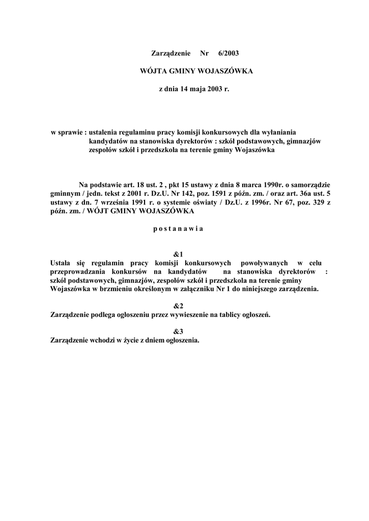 Zarządzenie Nr 6/2003 WÓJTA GMINY WOJASZÓWKA z dnia 14