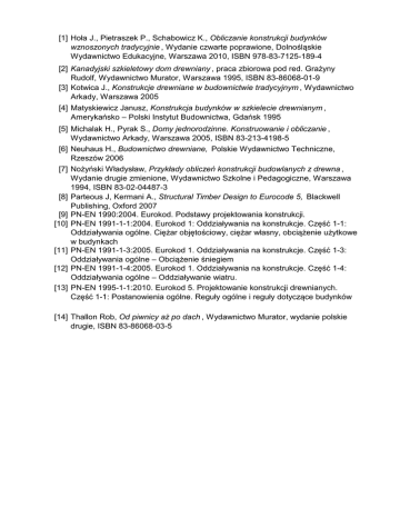 [1] Hoła J., Pietraszek P., Schabowicz K., Obliczanie konstrukcji budynków wznoszonych tradycyjnie , Wydanie czwarte poprawione, Dolnośląskie Wydawnictwo Edukacyjne, Warszawa 2010, ISBN 978-83-7125-189-4 [2] Kanadyjski szkieletowy dom drewniany , praca zbiorowa pod red. Grażyny Rudolf, Wydawnictwo Murator, Warszawa 1995, ISBN 83-86068-01-9 [3] Kotwica J., Konstrukcje drewniane w budownictwie tradycyjnym , Wydawnictwo Arkady, Warszawa 2005 [4] Matyskiewicz Janusz, Konstrukcja budynków w szkielecie drewnianym , Amerykańsko – Polski Instytut Budownictwa, Gdańsk 1995 [5] Michalak H., Pyrak S., Domy jednorodzinne. Konstruowanie i obliczanie , Wydawnictwo Arkady, Warszawa 2005, ISBN 83-213-4198-5 [6] Neuhaus H., Budownictwo drewniane, Polskie Wydawnictwo Techniczne, Rzeszów 2006 [7] Nożyński Władysław, Przykłady obliczeń konstrukcji budowlanych z drewna , Wydanie drugie zmienione, Wydawnictwo Szkolne i Pedagogiczne, Warszawa 1994, ISBN 83-02-04487-3 [8] Parteous J, Kermani A., Structural Timber Design to Eurocode 5, Blackwell Publishing, Oxford 2007 [9] PN-EN 1990:2004. Eurokod. Podstawy projektowania konstrukcji. [10] PN-EN 1991-1-1:2004. Eurokod 1: Oddziaływania na konstrukcje. Część 1-1: Oddziaływania ogólne. Ciężar objętościowy, ciężar własny, obciążenie użytkowe w budynkach [11] PN-EN 1991-1-3:2005. Eurokod 1. Oddziaływania na konstrukcje. Część 1-3: Oddziaływania ogólne – Obciążenie śniegiem [12] PN-EN 1991-1-4:2005. Eurokod 1. Oddziaływania na konstrukcje. Część 1-4: Oddziaływania ogólne – Oddziaływanie wiatru. [13] PN-EN 1995-1-1:2010. Eurokod 5. Projektowanie konstrukcji drewnianych. Część 1-1: Postanowienia ogólne. Reguły ogólne i reguły dotyczące budynków [14] Thallon Rob, Od piwnicy aż po dach , Wydawnictwo Murator, wydanie polskie drugie, ISBN 83-86068-03-5