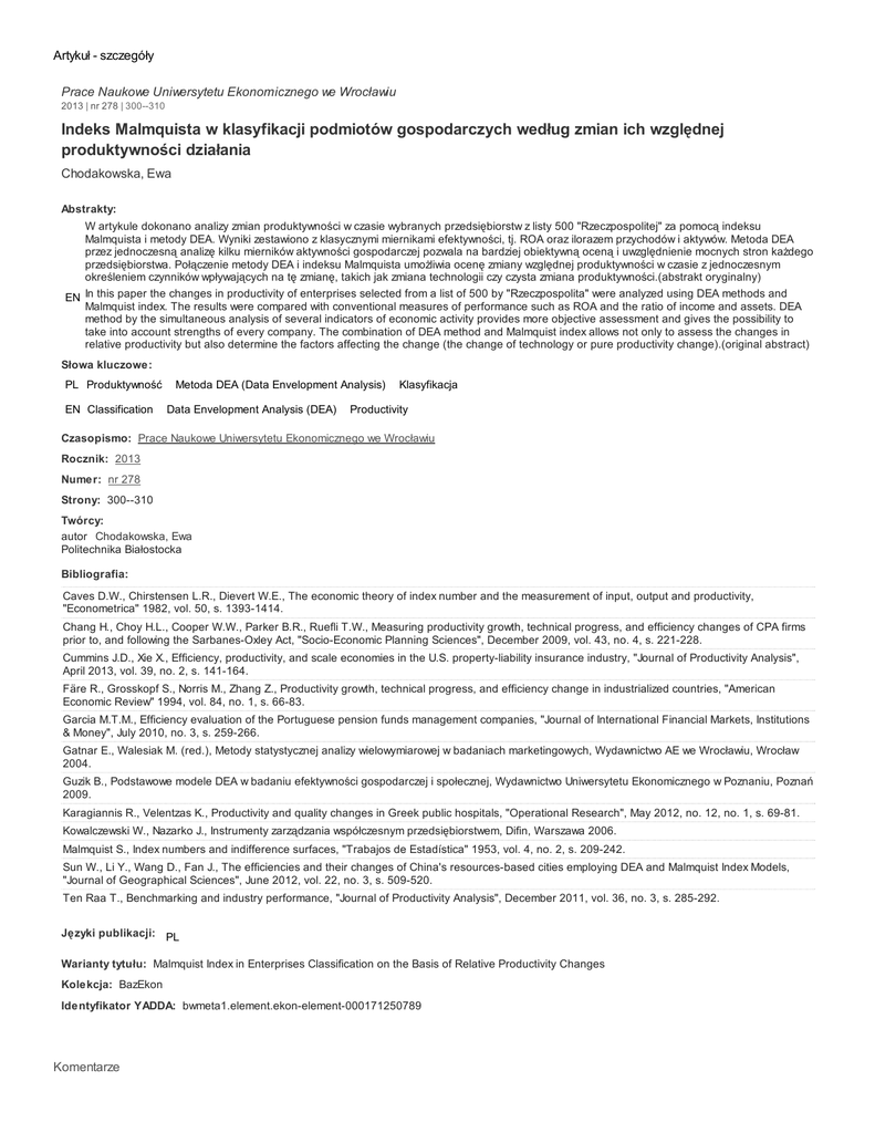 Artykuł - szczegóły Prace Naukowe Uniwersytetu Ekonomicznego we Wrocławiu 2013 | nr 278 | 300--310 Indeks Malmquista w klasyfikacji podmiotów gospodarczych według zmian ich względnej produktywności działania Chodakowska, Ewa Abstrakty: W artykule dokonano analizy zmian produktywności w czasie wybranych przedsiębiorstw z listy 500 "Rzeczpospolitej" za pomocą indeksu Malmquista i metody DEA. Wyniki zestawiono z klasycznymi miernikami efektywności, tj. ROA oraz ilorazem przychodów i aktywów. Metoda DEA przez jednoczesną analizę kilku mierników aktywności gospodarczej pozwala na bardziej obiektywną oceną i uwzględnienie mocnych stron każdego przedsiębiorstwa. Połączenie metody DEA i indeksu Malmquista umożliwia ocenę zmiany względnej produktywności w czasie z jednoczesnym określeniem czynników wpływających na tę zmianę, takich jak zmiana technologii czy czysta zmiana produktywności.(abstrakt oryginalny) EN In this paper the changes in productivity of enterprises selected from a list of 500 by "Rzeczpospolita" were analyzed using DEA methods and Malmquist index. The results were compared with conventional measures of performance such as ROA and the ratio of income and assets. DEA method by the simultaneous analysis of several indicators of economic activity provides more objective assessment and gives the possibility to take into account strengths of every company. The combination of DEA method and Malmquist index allows not only to assess the changes in relative productivity but also determine the factors affecting the change (the change of technology or pure productivity change).(original abstract) Słowa kluczowe: PL Produktywność EN Classification Metoda DEA (Data Envelopment Analysis) Data Envelopment Analysis (DEA) Klasyfikacja Productivity Czasopismo: Prace Naukowe Uniwersytetu Ekonomicznego we Wrocławiu Rocznik: 2013 Numer: nr 278 Strony: 300--310 Twórcy: autor Chodakowska, Ewa Politechnika Białostocka Bibliografia: Caves D.W., Chirstensen L.R., Dievert W.E., The economic theory of index number and the measurement of input, output and productivity, "Econometrica" 1982, vol. 50, s. 1393-1414. Chang H., Choy H.L., Cooper W.W., Parker B.R., Ruefli T.W., Measuring productivity growth, technical progress, and efficiency changes of CPA firms prior to, and following the Sarbanes-Oxley Act, "Socio-Economic Planning Sciences", December 2009, vol. 43, no. 4, s. 221-228. Cummins J.D., Xie X., Efficiency, productivity, and scale economies in the U.S. property-liability insurance industry, "Journal of Productivity Analysis", April 2013, vol. 39, no. 2, s. 141-164. Färe R., Grosskopf S., Norris M., Zhang Z., Productivity growth, technical progress, and efficiency change in industrialized countries, "American Economic Review" 1994, vol. 84, no. 1, s. 66-83. Garcia M.T.M., Efficiency evaluation of the Portuguese pension funds management companies, "Journal of International Financial Markets, Institutions & Money", July 2010, no. 3, s. 259-266. Gatnar E., Walesiak M. (red.), Metody statystycznej analizy wielowymiarowej w badaniach marketingowych, Wydawnictwo AE we Wrocławiu, Wrocław 2004. Guzik B., Podstawowe modele DEA w badaniu efektywności gospodarczej i społecznej, Wydawnictwo Uniwersytetu Ekonomicznego w Poznaniu, Poznań 2009. Karagiannis R., Velentzas K., Productivity and quality changes in Greek public hospitals, "Operational Research", May 2012, no. 12, no. 1, s. 69-81. Kowalczewski W., Nazarko J., Instrumenty zarządzania współczesnym przedsiębiorstwem, Difin, Warszawa 2006. Malmquist S., Index numbers and indifference surfaces, "Trabajos de Estadística" 1953, vol. 4, no. 2, s. 209-242. Sun W., Li Y., Wang D., Fan J., The efficiencies and their changes of China's resources-based cities employing DEA and Malmquist Index Models, "Journal of Geographical Sciences", June 2012, vol. 22, no. 3, s. 509-520. Ten Raa T., Benchmarking and industry performance, "Journal of Productivity Analysis", December 2011, vol. 36, no. 3, s. 285-292. Języki publikacji: PL Warianty tytułu: Malmquist Index in Enterprises Classification on the Basis of Relative Productivity Changes Kolekcja: BazEkon Identyfikator YADDA: bwmeta1.element.ekon-element-000171250789 Komentarze Musisz być zalogowany aby pisać komentarze. Zawartość bazy © 2010 BG UEK | System oparty na platformie YADDA yadda-front.vls, ver. 1.12.5-newlayout-SNAPSHOT, rev. 36522 | © IC M UW 2005-2013