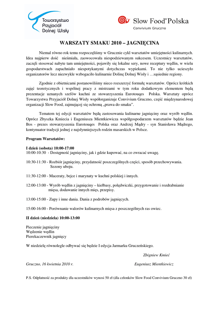 WARSZATY SMAKU 2010 – JAGNIĘCINA Niemal równo rok temu rozpoczęliśmy w Grucznie cykl warsztatów umiejętności kulinarnych. Idea najpierw dość nieśmiała, zaowocowała niespodziewanym sukcesem. Uczestnicy warsztatów, zaczęli stosować nabyte tam umiejętności, pojawiły się lokalne sery, nowe receptury wędlin, w wielu gospodarstwach zapachniało niespotykanymi dotychczas wypiekami. To nie tylko ucieszyło organizatorów lecz niezwykle wzbogaciło kulinarnie Dolinę Dolnej Wisły i …sąsiednie regiony. Zgodnie z obietnicami postanowiliśmy nieco rozszerzyć formułę warsztatów. Oprócz krótkich zajęć teoretycznych i wspólnej pracy z mistrzami w tym roku dodatkowym elementem będą prezentacje uznanych szefów kuchni ze stowarzyszenia Eurotouqes Polska. Warsztaty oprócz Towarzystwa Przyjaciół Dolnej Wisły współorganizuje Convivium Gruczno, część międzynarodowej organizacji Slow Food, zajmującej się ochroną „prawa do smaku”. Tematem tej edycji warsztatów będą zastosowania kulinarne jagnięciny oraz wyrób wędlin. Oprócz Zbyszka Kmiecia i Eugeniusza Mientkiewicza współgospodarzem warsztatów będzie Jean Bos - prezes stowarzyszenia Eurotouqes Polska oraz Andrzej Mądry - syn Stanisława Mądrego, kontynuator tradycji jednej z najsłynniejszych rodzin masarskich w Polsce. Program Warsztatów: I dzień (sobota) 10:00-17:00 10:00-10:30 - Dostępność jagnięciny, jak i gdzie kupować, na co zwracać uwagę. 10:30-11:30 - Rozbiór jagnięciny, przydatność poszczególnych części, sposób przechowywania. Sezony uboju. 11:30-12:00 - Maceraty, bejce i marynaty w kuchni polskiej i innych. 12:00-13:00 - Wyrób wędlin z jagnięciny – kiełbasy, polędwiczki, przygotowanie i rozdrabnianie mięsa, dodawanie innych mięs, przepisy. 13:00-15:00 - Zupy i inne dania. Dania z podrobów jagnięcych. 15:00-16:00 - Porównanie walorów kulinarnych mięsa z poszczególnych ras owiec. II dzień (niedziela) 10:00-13:00 Pieczenie jagnięciny Wędzenie wędlin Pierekaczewnik jagnięcy W niedzielę równolegle odbywać się będzie I edycja Jarmarku Gruczeńskiego. Zbigniew Kmieć Gruczno, 16 kwietnia 2010 r. Eugeniusz Mientkiewicz P.S. Odpłatność za produkty dla uczestników wynosi 50 zł (dla członków Slow Food Convivium Gruczno 30 zł)