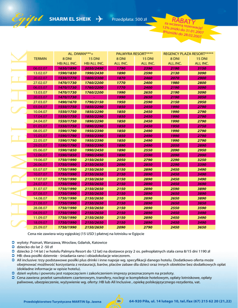 SHARM EL SHEIK Egipt TERMIN 06.02.07 13.02.07 20.02.07 27.02.07 06.03.07 13.03.07 20.03.07 27.03.07 03.04.07 10.04.07 17.04.07 24.04.07 01.05.07 08.05.07 15.05.07 22.05.07 29.05.07 05.06.07 12.06.07 19.06.07 26.06.07 03.07.07 10.07.07 17.07.07 24.07.07 31.07.07 07.08.07 14.08.07 21.08.07 28.08.07 04.09.07 11.09.07 18.09.07 25.09.07 SHARM EL SHEIK AL. DIWAN***+ 8 DNI 15 DNI HB/ALL INC. HB/ALL INC. 1650/1890 2050/2490 1590/1830 1990/2430 1530/1770 1800/2300 1470/1730 1760/2200 1470/1730 1760/2200 1470/1730 1760/2200 1470/1730 1490/1670 1790/2150 1550/1750 1850/2290 1550/1750 1850/2290 1550/1750 1850/2290 1550/1750 1890/2290 1550/1750 1890/2290 1590/1790 1950/2390 1590/1790 1950/2390 1590/1790 1950/2390 1590/1790 1950/2390 1590/1850 1990/2450 1590/1850 1990/2490 1750/1990 2150/2650 1750/1990 2150/2650 1750/1990 2150/2650 1750/1990 2150/2650 1750/1990 2150/2650 1750/1990 2150/2650 1750/1990 2150/2650 1750/1990 2150/2650 1750/1990 2150/2650 1750/1990 2150/2650 1750/1990 2150/2650 1750/1990 2150/2650 1750/1990 2150/2650 1750/1990 2150/2650 1750/1990 2150/2650 Przedpłata: 500 zł PALMYRA RESORT**** 8 DNI 15 DNI ALL INC. ALL INC. 1790 2390 1890 2590 1870 2460 1770 2400 1770 2400 1990 2650 1990 2650 1950 2590 1850 2450 1850 2450 1850 2450 1850 2450 1850 2450 1850 2490 1850 2490 1850 2490 1890 2490 1890 2550 1890 2590 2050 2790 2090 2850 2150 2890 2150 2890 2150 2890 2150 2890 2150 2890 2150 2890 2150 2890 2150 2890 2150 2890 2150 2890 2150 2890 2150 2890 2090 2790 RABATY za wczes n 12% zniż ą rezerwację! ki do 31.0 1.2007 8%zniżk i do 28.0 2.2007 REGENCY PLAZA RESORT***** 8 DNI 15 DNI ALL.INC. ALL INC. 2190 3150 2130 3090 2070 2900 1980 2800 2190 3090 2190 3090 2190 3050 2150 2950 1990 2790 1990 2790 1990 2790 1990 2790 1950 2750 1990 2790 1990 2790 1990 2790 2050 2890 2090 2950 2090 2990 2290 3250 2290 3390 2450 3490 2450 3490 2450 3490 2450 3690 2590 3890 2650 3890 2650 3890 2650 3850 2550 3590 2450 3490 2450 3490 2450 3490 2450 3650 Cena nie zawiera wizy egipskiej (15 USD ) płatnej na lotnisku w Egipcie wyloty: Poznań, Warszawa, Wrocław, Gdańsk, Katowice dziecko do lat 2 -50 zł dziecko 2-14 lat ( w hotelu Palmyra Resort do 12 lat) na dostawce przy 2 os. pełnopłatnych stała cena 8/15 dni 1190 zł HB: dwa posiłki dziennie - śniadania rano i obiadokolacje wieczorem. All inclusive: trzy podstawowe posiłki plus drinki i inne napoje wg. specyfikacji danego hotelu. Dodatkowo oferta może obejmować możliwość korzystania z restauracji, barów, placów zabaw dla dzieci oraz innych obiektów bez dodatkowych opłat (dokładne informacje w opisie hotelu). dzień wylotu i powrotu jest rozpoczęciem i zakończeniem imprezy przeznaczonym na przeloty. Cena zawiera: przelot samolotem czarterowym, transfery, noclegi w kompleksie hotelowym, opłaty lotniskowe, opłaty paliwowe, ubezpieczenie, wyżywienie wg. oferty: HB lub All Inclusive , opiekę polskojęzycznego rezydenta, vat. Przedsiębiorstwo Turystyczne MARTIN Sp. Jawna 86 64-920 Piła, ul. 14 lutego 10, tel./fax (67) 215 62 20 (21,22) Egipt All inclusive Hotel AL. DIWAN***+ / Sharm el Sheikh Polecamy dla rodzin z dziećmi. POŁOŻENIE: Sharm El Sheikh, hotel położony jest niedaleko przepięknej zatoki Morza Czerwonego – Shark’s Bay. Do prywatnej plaży, która oddalonajest 1,5 km od hotelu, dowozi turystów bezpłatny bus, kursujący wg rozkładu hotelowego. Kurort położony jest 5 min. jazdy od lotniska. HOTEL: Wybudowany w stylu arabskim, składa się z piętrowych pawilonów, które otacza przepiękny ogród. Hotel posiada 80 pokoi dwuosobowych,14 typu rodzinnego i 37apartamentów (balkony lub tarasy występują w dwóch ostatnich). Do dyspozycji gości: serwis hotelowy – 24h, 2 rodzaje sejfów w recepcji (bezpłatny – pieniądze są zamykane w kopertach, a następnie deponowane w hotelowym sejfieoraz płatny – sejf indywidualny, zamykany na klucz), kantor, pralnia, lekarz na telefon, basen, program animacyjny, 2 restauracje, 2 baseny, bar przy basenie, 3 bary. Na plaży: leżaki i parasole (bezpłatnie), materace dodatkowo płatne 5 EGP. POKOJE: W pokojach znajduje się klimatyzacja, telefon, TV SAT, mini bar (odpłatnie), łazienka z wanną lub prysznicem, bidet. SPORT: Bilard (odpłatnie) i piłka siatkowa. WYŻYWIENIE: HB–śniadania i obiadokolacje w formie bufetu. Hotel posiada formułę All Inclusive. W jej skład wchodzą śniadania, obiady, kolacje, kawa, herbata oraz lokalne napoje alkoholowe i bezalkoholowe. www.martintour.pl 87 [email protected] Egipt Hotel PALMYRA RESORT**** / Sharm el Sheikh Dobry standard w dobrej cenie. POŁOŻENIE: Sharm El Sheikh, hotel należy do grupy „The Three Corners”, usytuowany w zatoce Nabq, tylko 5 min. drogi od lotniska i ok. 30 min od jego starego centrum. Hotel jest oddalony ok. 800 m od prywatnej plaży (darmowy transfer z hotelu na plażę i z powrotem). HOTEL: Wymarzony hotel dla rodzin z dziećmi, dla których przewidziane są różnego rodzaju atrakcje, takie jak plac zabaw, basen, klub dla dzieci, które dają możliwość uatrakcyjnienia pobytu swoich pociech. Wakacje z dziećmi mogą stać się prawdziwą przyjemnością. To także prawdziwy raj dla nurków i osób kochających snorkelling. Do dospozycji gości: bar przy basenie, peanuts bar, beach bar, lobby bar, sejf, pralnia, sklepy, dyskoteka, animacja, bezpłatny transfer busem z hotelu na plażę i z powrotem, prywatna plaża. Leżaki, parasole, materace na plaży i przy basenie hotelowym są nieodpłatne. Raz dziennie darmowy transport do centrum Sharm El Sheikh (Naama Bay). Możliwość płatności kartami kredytowymi (Visa, American Express, Mastercard). POKOJE: W pokojach znajduje się klimatyzacja, telefon, radio, lodówka, TV SAT, łazienka z wanną lub prysznicem, balkon lub taras z widokiem na góry. SPORT: Tenis stołowy, piłka siatkowa, kort tenisowy, aerobik, snorkelling, centrum nurkowania, piłka wodna. WYŻYWIENIE: Hotel posiada formułę AllI nclusive. W jej skład wchodzą śniadania, obia
