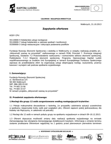 Wałbrzych, 21.10.2013 Zapytanie ofertowe KODY CPV: 55110000-4 Hotelarskie usługi noclegowe 55120000-7 Usługi hotelarskie w zakresie spotkań i konferencji 55300000-3 Usługi restauracyjne i dotyczące podawania posiłków Fundacja Rozwoju Ekonomii Społecznej z siedzibą w Wałbrzychu w związku realizacją projektu pn.: „Aktywność szansą na przyszłość” realizowanego w ramach POKL Priorytet 7. Promocja integracji społecznej, Działanie 7.2 Przeciwdziałanie wykluczeniu i wzmocnienie sektora ekonomii społecznej, Poddziałanie 7.2.2 Wsparcie ekonomii społecznej, Programu Operacyjnego Kapitał Ludzki współfinansowanego ze środków Unii Europejskiej w ramach Europejskiego Funduszu Społecznego zaprasza do przedkładania ofert na organizację usługi obejmującej noclegi, wyżywienie, przerwy kawowe i wynajem sali podczas spotkania wyjazdowego. I. Zamawiający: Fundacja Rozwoju Ekonomii Społecznej ul. Sienkiewicza 2/5 58-300 Wałbrzych NIP: 886-289-43-82 Tel. 74 665 33 66 fax. 74 665 33 67 W ramach projektu „Aktywność szansą na przyszłość” II. Przedmiot zapytania ofertowego: 1.Noclegi dla grupy 12 osób zorganizowane według następujących kryteriów: 1.1 Pokoje maksymalnie dwuosobowe z łazienką, (w przypadku zaistnienia sytuacji uczestnictwa w spotkaniu nieparzystej liczby osób pod względem płci, Oferent zapewni pokój jednoosobowy dla Kobiety lub Mężczyzny, w zależności od potrzeb). 1.2 Noclegi dla 12 osób w ramach pobytu grupy na spotkaniu wyjazdowym w dniach 09–10.12.2013. 1.3 Oferent dopuszcza możliwość zmiany daty realizacji spotkania wyjazdowego na wniosek Zamawiającego bez obciążania Zamawiającego dodatkowymi kosztami. Informacja o zmianie terminu zostanie przekazana Oferentowi najpóźniej na 2 godziny przed planowanym pierwotnie terminem rozpoczęcia spotkania wyjazdowego. W takim przypadku Oferent o nowym terminie spotkania poinformowany zostanie najpóźniej na 3 dni przed jego rozpoczęciem. 1.4 Oferent dopuszcza możliwość rezygnacji przez Zamawiającego, bez obciążania Zamawiającego kosztami związanymi z rezygnacją z zamówionych usług w terminie do 3 dni przed realizacją usług których terminy zostały określone w punkcie 1.2. 2. Wyżywienie + przerwy kawowe dla grupy 12 osób realizowane wg poniższych kryteriów: 2.1 Wyżywienie + przerwy kawowe świadczone będą zgodnie z terminem noclegów przedstawionym w punkcie II podpunkt 1.2 2.2 Wyżywienie podczas jednego spotkania wyjazdowego obejmuje dla każdej osoby: 2 obiady, 1 kolacja, 1 śniadanie. 2.3 Przerwy kawowe dla każdej osoby podczas jednego spotkania wyjazdowego świadczone w trybie ciągłym uzupełniane na bieżąco podczas całego pobytu. 2.4 Śniadanie ma zostać zorganizowane w postaci „szwedzkiego stołu” wraz z gorącymi napojami oraz sokiem, przy zastrzeżeniu konieczności podania posiłków szczególnych (wegetariańskich/wegańskich/koszernych/itp.). 2.5 Każdy obiad składać się ma z dwóch dań, deseru i soku oraz wody mineralnej. Posiłki będą takie same dla wszystkich uczestników przy zastrzeżeniu konieczności podania posiłków szczególnych (wegetariańskich/wegańskich/koszernych/itp.), o których wykonawca zostanie poinformowany w dniu realizacji usługi. 2.6 Kolacja składać się ma z dania ciepłego, zimnych przystawek, gorącego napoju (herbata), wody mineralnej oraz soku przy zastrzeżeniu konieczności podania posiłków szczególnych (wegetariańskich/wegańskich/koszernych/itp.), o których wykonawca zostanie poinformowany w dniu realizacji usługi. 2.7 Przerwa kawowa składać się ma z gorących napojów (kawa, herbata czarna, herbaty smakowe, mleko), wody mineralnej, soków oraz ciast, ciastek, oraz słonych przekąsek. 2.8 Harmonogram godzinowy posiłków i przerw kawowych podporządkowany będzie pod wymagania Zamawiającego. 2.9 Menu poszczególnych posiłków ustala Oferent z zastrzeżeniem punktów 2.1 do 2.8, przy akceptacji Zamawiającego. 3. Wynajem sali dla grupy 12 osób zgodnie z poniższymi kryteriami: 3.1 Sala wielkościowo umożliwiająca w sposób komfortowy przeprowadzenie spotkania wyjazdowego dla 12 osób, o powierzchni co najmniej 20 metrów kwadratowych. 3.2 Sala wyposażona w stoły, krzesła z możliwością ich przestawiania, sala musi posiadać okna umożliwiające wietrzenie Sali dostępne z poziomu podłogi, wyposażone w przesłony zapobiegające nadmiernemu nasłonecznieniu Sali. 3.3. Temperatura w Sali minimum 21 stopni, maksymalnie 26 stopni. 3.4 Sala wyposażona w następujący sprzęt: projektor, ekran projekcyjny, 3 tablice typu Flip chart, stały bezprzewodowy dostęp do Internetu, odtwarzacz DVD. 3.5 W sali istnieć będzie możliwość przywieszania do ścian lub przygotowanych powierzchni kartek typu flipchart na wysokości nie niższej niż 180 cm od powierzchni podłogi. 3.6 Na drzwiach wejściowych do budynku oraz wewnątrz budynku Oferenta, ze szczególnym uwzględnieniem drzwi sali, musi istnieć możliwość przywieszenia informacji o odbywającym się spotkaniu i o jego współfinansowaniu. 3.7 Sale przekazane będą do dyspozycji zamawiającego od godziny 8 dnia rozpoczynającego spotkanie do godziny 21 dnia kończącego spotkanie. 3.8 Oferent zapewni, bez dodatkowych kosztów, minimum 6 stanowisk komputerowych z możliwością drukowania, oraz stałym dostępem do Internetu. O ewentualnym braku konieczności zapewnienia dostępu do stanowisk komputerowych Zamawiający poinformuje Oferenta telefonicznie co najmniej 3 dni przed rozpoczęciem spotkania wyjazdowego. 3.9 Oferent udostępni równolegle, bez dodatkowych kosztów minimum 2 dodatkowe pomieszczenia, każde mieszczące co najmniej 4 osoby dla w/w grupy. 3.10 Sala i dodatkowe pomieszczenia muszą znajdować się w budynku, w którym realizowana będzie usługa hotelowa i gastronomiczna. Nie będzie konieczności przechodzenia z budynku do budynku (wychodzenia na zewnątrz budynku). 3.11 Sala i dodatkowe pomieszczeni