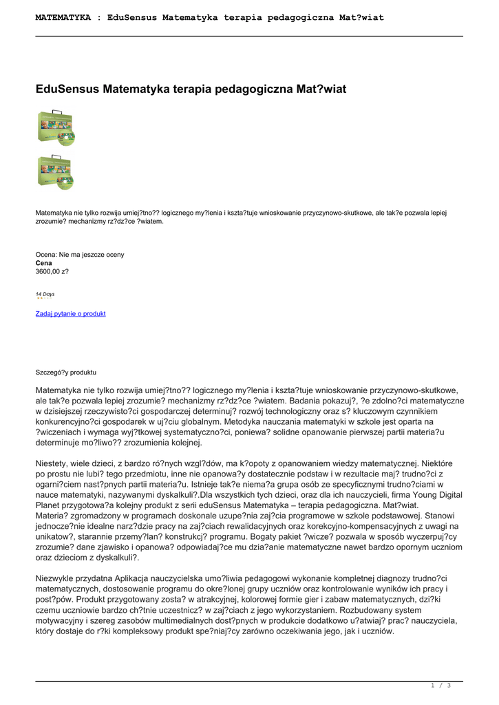 MATEMATYKA : EduSensus Matematyka terapia pedagogiczna Mat?wiat EduSensus Matematyka terapia pedagogiczna Mat?wiat Matematyka nie tylko rozwija umiej?tno?? logicznego my?lenia i kszta?tuje wnioskowanie przyczynowo-skutkowe, ale tak?e pozwala lepiej zrozumie? mechanizmy rz?dz?ce ?wiatem. Ocena: Nie ma jeszcze oceny Cena 3600,00 z? Zadaj pytanie o produkt Szczegó?y produktu Matematyka nie tylko rozwija umiej?tno?? logicznego my?lenia i kszta?tuje wnioskowanie przyczynowo-skutkowe, ale tak?e pozwala lepiej zrozumie? mechanizmy rz?dz?ce ?wiatem. Badania pokazuj?, ?e zdolno?ci matematyczne w dzisiejszej rzeczywisto?ci gospodarczej determinuj? rozwój technologiczny oraz s? kluczowym czynnikiem konkurencyjno?ci gospodarek w uj?ciu globalnym. Metodyka nauczania matematyki w szkole jest oparta na ?wiczeniach i wymaga wyj?tkowej systematyczno?ci, poniewa? solidne opanowanie pierwszej partii materia?u determinuje mo?liwo?? zrozumienia kolejnej. Niestety, wiele dzieci, z bardzo ró?nych wzgl?dów, ma k?opoty z opanowaniem wiedzy matematycznej. Niektóre po prostu nie lubi? tego przedmiotu, inne nie opanowa?y dostatecznie podstaw i w rezultacie maj? trudno?ci z ogarni?ciem nast?pnych partii materia?u. Istnieje tak?e niema?a grupa osób ze specyficznymi trudno?ciami w nauce matematyki, nazywanymi dyskalkuli?.Dla wszystkich tych dzieci, oraz dla ich nauczycieli, firma Young Digital Planet przygotowa?a kolejny produkt z serii eduSensus Matematyka – terapia pedagogiczna. Mat?wiat. Materia? zgromadzony w programach doskonale uzupe?nia zaj?cia programowe w szkole podstawowej. Stanowi jednocze?nie idealne narz?dzie pracy na zaj?ciach rewalidacyjnych oraz korekcyjno-kompensacyjnych z uwagi na unikatow?, starannie przemy?lan? konstrukcj? programu. Bogaty pakiet ?wicze? pozwala w sposób wyczerpuj?cy zrozumie? dane zjawisko i opanowa? odpowiadaj?ce mu dzia?anie matematyczne nawet bardzo opornym uczniom oraz dzieciom z dyskalkuli?. Niezwykle przydatna Aplikacja nauczycielska umo?liwia pedagogowi wykonanie kompletnej diagnozy trudno?ci matematycznych, dostosowanie programu do okre?lonej grupy uczniów oraz kontrolowanie wyników ich pracy i post?pów. Produkt przygotowany zosta? w atrakcyjnej, kolorowej formie gier i zabaw matematycznych, dzi?ki czemu uczniowie bardzo ch?tnie uczestnicz? w zaj?ciach z jego wykorzystaniem. Rozbudowany system motywacyjny i szereg zasobów multimedialnych dost?pnych w produkcie dodatkowo u?atwiaj? prac? nauczyciela, który dostaje do r?ki kompleksowy produkt spe?niaj?cy zarówno oczekiwania jego, jak i uczniów. 1 / 3 MATEMATYKA : EduSensus Matematyka terapia pedagogiczna Mat?wiat Wa?nym elementem produktu s? segregatory z bogatym zestawem wydrukowanych ?wicze?, koresponduj?cych z zakresem materia?u multimedialnego zawartym w programie. Programy z serii Matematyka – terapia pedagogiczna. Mat?wiat, to atrakcyjne i skuteczne narz?dzie pracy dla innowacyjnego pedagoga, które wspiera nauczanie matematyki w zakresie podstawowym. Dzi?ki nim mo?liwe jest obudzenie prawdziwej matematycznej pasji w ka?dym dziecku. Produkt ten, nale??cy do znanej serii eduSensus, sk?ada si? z pi?ciu programów, które powsta?y z my?l? o rozwijaniu zdolno?ci matematycznych w?ród dzieci w wieku od 6 do 11 lat: • Matematyka – terapia pedagogiczna. Mat?wiat cz??? 1 Europa Dzia?ania na liczbach 1–20 • Matematyka – terapia pedagogiczna. Mat?wiat cz??? 2 Afryka Dzia?ania na liczbach do 100 • Matematyka – terapia pedagogiczna. Mat?wiat cz??? 3 Azja Dzia?ania na liczbach do 1000 • Matematyka – terapia pedagogiczna. Mat?wiat cz??? 4 Ameryka Pó?nocna Dzia?ania na liczbach wielocyfrowych. U?amki dziesi?tne • Matematyka – terapia pedagogiczna. Mat?wiat cz??? 5 Australia Dzia?ania na liczbach wielocyfrowych. U?amki, procenty, czas, miary i wagi W zestawie znajduj? si? nast?puj?ce dodatki i pomoce tradycyjne: • Zestaw naklejek (5 wzorów) • Zestaw dyplomów (2 wzory) • P?yta DVD z teledyskami „Tabliczka mno?enia” - p?yta DVD z zestawem 10 ?piewanych przez zwierz?ta piosenek inspirowanych tabliczk? mno?enia. Korzystaj?c z tej?e p?yty, dzieci b?d? metod? skojarzeniow? zapami?tywa? te dzia?ania, które nastr?czaj? im najwi?cej trudno?ci. W??czenie dzia?a? matematycznych w logiczne, rymuj?ce si? teksty powoduje, ?e dziecko mo?e przypomnie? sobie potrzebn? cz??? tabliczki mno?enia, nuc?c dalszy ci?g piosenki lub przypominaj?c sobie okre?lony rym. Teksty ?atwo zapami?ta? ze wzgl?du na ich zabawny charakter oraz refreny. W ka?dej piosence wyst?puje inna posta? przewodnia, co równie? u?atwia pami?ciowe opanowanie dzia?a?. Dzi?ki temu nauka tabliczki mno?enia stanie si? ?wietn? zabaw?, a nie ?mudnym obowi?zkiem. MINIMALNE WYMAGANIA TECHNICZNE: • MS Windows XP/Vista/7 • Internet Explorer 6.0 lub wy?szy • zalecane: procesor klasy Pentium IV 2,4 GHz oraz 512 MB RAM • karta d?wi?kowa z pod??czonymi g?o?nikami lub s?uchawkami • karta graficzna (minimalna rozdzielczo?? 1024x768) z tysi?cami kolorów • port USB • mysz lub inne urz?dzenie wskazuj?ce • nap?d CD-ROM/DVD ROM Cena przesy?ki ustalana indywidualnie. Przed zamówieniem Ten adres pocztowy jest chroniony jest w??czenie w przegl?darce obs?ugi JavaScript. // przed spamowaniem. Aby go zobaczy?, konieczne Termin realizacji zamówienia od 24 h do 14 dni roboczych. Opinie 2 / 3 MATEMATYKA : EduSensus Matematyka terapia pedagogiczna Mat?wiat Nikt jeszcze nie ocenia? tego produktu. 3 / 3 Powered by TCPDF (www.tcpdf.org)