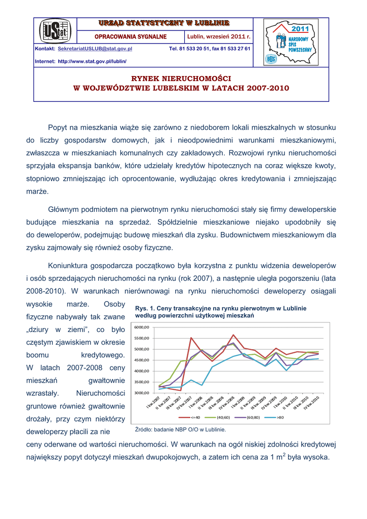 U UR RZZĄ ĄD D SST TA AT TY YSST TY YC CZZN NY YW W LLU UB BLLIIN NIIE E OPRACOWANIA SYGNALNE Kontakt: [email protected] Lublin, wrzesień 2011 r. Tel. 81 533 20 51, fax 81 533 27 61 Internet: http://www.stat.gov.pl/lublin/ RYNEK NIERUCHOMOŚCI W WOJEWÓDZTWIE LUBELSKIM W LATACH 2007-2010 Popyt na mieszkania wiąże się zarówno z niedoborem lokali mieszkalnych w stosunku do liczby gospodarstw domowych, jak i nieodpowiednimi warunkami mieszkaniowymi, zwłaszcza w mieszkaniach komunalnych czy zakładowych. Rozwojowi rynku nieruchomości sprzyjała ekspansja banków, które udzielały kredytów hipotecznych na coraz większe kwoty, stopniowo zmniejszając ich oprocentowanie, wydłużając okres kredytowania i zmniejszając marże. Głównym podmiotem na pierwotnym rynku nieruchomości stały się firmy deweloperskie budujące mieszkania na sprzedaż. Spółdzielnie mieszkaniowe niejako upodobniły się do deweloperów, podejmując budowę mieszkań dla zysku. Budownictwem mieszkaniowym dla zysku zajmowały się również osoby fizyczne. Koniunktura gospodarcza początkowo była korzystna z punktu widzenia deweloperów i osób sprzedających nieruchomości na rynku (rok 2007), a następnie uległa pogorszeniu (lata 2008-2010). W warunkach nierównowagi na rynku nieruchomości deweloperzy osiągali wysokie marże. Osoby fizyczne nabywały tak zwane Rys. 1. Ceny transakcyjne na rynku pierwotnym w Lublinie według powierzchni użytkowej mieszkań „dziury w ziemi”, co było 6000,00 częstym zjawiskiem w okresie 5500,00 5000,00 boomu kredytowego. 4500,00 W latach 2007-2008 ceny 4000,00 mieszkań gwałtownie 3500,00 wzrastały. Nieruchomości 3000,00 gruntowe również gwałtownie drożały, przy czym niektórzy deweloperzy płacili za nie <=40 (40;60) (60;80) >80 Źródło: badanie NBP O/O w Lublinie. ceny oderwane od wartości nieruchomości. W warunkach na ogół niskiej zdolności kredytowej największy popyt dotyczył mieszkań dwupokojowych, a zatem ich cena za 1 m 2 była wysoka. nieruchomości Rynek w województwie lubelskim i Lublinie miał charakter heterogeniczny, co wyrażało się dużym zróżnicowaniem cen w przestrzeni i ich zmiennością w czasie. W 2010 r. na mieszkania w Lublinie miały prawie 80% udział w ogólnej liczbie transakcji w zakresie lokali mieszkalnych w województwie lubelskim. W okresie boomu na rynku nieruchomości ceny lokali mieszkalnych w Lublinie osiągnęły zbyt wysoki poziom w stosunku do możliwości finansowych potencjalnych nabywców. Pogorszenie koniunktury gospodarczej w 2008 r. i zaostrzenie polityki kredytowej Rys. 2. Struktura transakcji na rynku pierwotnym Lublina według powierzchni użytkowej mieszkań banków spowodowały spadek popytu i cen nieruchomości rynkach mieszkaniowych pierwotnym i na wtórnym. W latach 2009-2010 wysokie ceny osiągały mieszkania wybudowane w ostatnich kilkunastu latach według energooszczędnych technologii, które charakteryzowały się dobrą lokalizacją i wysokim standardem wyposażenia. Źródło: badanie NBP O/O w Lublinie. Wraz ze wzrostem podaży rynek nieruchomości stał się bardziej „normalny”, co przełożyło się początkowo na stagnację, a następnie na spadek cen mieszkań. Nabywcy mieszkań przed podjęciem decyzji szczegółowo analizowali mocne i słabe strony lokalu mieszkalnego oraz zagrożenia występujące w jego otoczeniu. Coraz trudniej było sprzedać mieszkanie położone w mniej atrakcyjnych dzielnicach i budynkach z wielkiej płyty, zwłaszcza jeśli wymagało ono gruntownego remontu. Ograniczenie efektywnego Rys. 3. Średni czas sprzedaży mieszkania na rynku wtórnym w Lublinie popytu na nieruchomości mieszkalne stanowiło przyczynę 2008 jak i liczby do użytku w Polsce, oddanych mieszkań po spadku r., zarówno województwie lubelskim. W województwie wyjątkiem był powiat lubelski, w którym w 2009 r. liczba oddawanych do użytku domów jednorodzinnych zwiększyła się. Źródło: badanie NBP O/O w Lublinie.