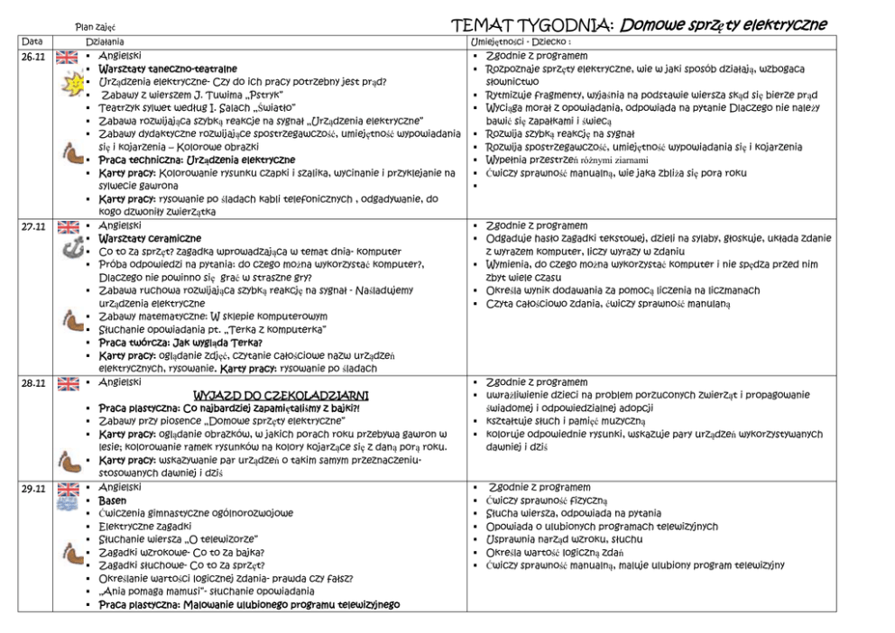 Plan zajęć Data Działania 26.11 27.11 28.11 29.11 TEMAT TYGODNIA: Domowe sprzęty elektryczne Umiejętności - Dziecko : Angielski Warsztaty taneczno-teatralne Urządzenia elektryczne- Czy do ich pracy potrzebny jest prąd? Zabawy z wierszem J. Tuwima „Pstryk” Teatrzyk sylwet według I. Salach „Światło” Zabawa rozwijająca szybką reakcje na sygnał „Urządzenia elektryczne” Zabawy dydaktyczne rozwijające spostrzegawczość, umiejętność wypowiadania się i kojarzenia – Kolorowe obrazki Praca techniczna: Urządzenia elektryczne Karty pracy: Kolorowanie rysunku czapki i szalika, wycinanie i przyklejanie na sylwecie gawrona Karty pracy: rysowanie po śladach kabli telefonicznych , odgadywanie, do kogo dzwoniły zwierzątka Angielski Warsztaty ceramiczne Co to za sprzęt? zagadka wprowadzająca w temat dnia- komputer Próba odpowiedzi na pytania: do czego można wykorzystać komputer?, Dlaczego nie powinno się grać w straszne gry? Zabawa ruchowa rozwijająca szybką reakcję na sygnał - Naśladujemy urządzenia elektryczne Zabawy matematyczne: W sklepie komputerowym Słuchanie opowiadania pt. „Terka z komputerka” Praca twórcza: Jak wygląda Terka? Karty pracy: oglądanie zdjęć, czytanie całościowe nazw urządzeń elektrycznych, rysowanie. Karty pracy: rysowanie po śladach Angielski WYJAZD DO CZEKOLADZIARNI Praca plastyczna: Co najbardziej zapamiętaliśmy z bajki?! Zabawy przy piosence „Domowe sprzęty elektryczne” Karty pracy: oglądanie obrazków, w jakich porach roku przebywa gawron w lesie; kolorowanie ramek rysunków na kolory kojarzące się z daną porą roku. Karty pracy: wskazywanie par urządzeń o takim samym przeznaczeniustosowanych dawniej i dziś Zgodnie z programem Rozpoznaje sprzęty elektryczne, wie w jaki sposób działają, wzbogaca słownictwo Rytmizuje fragmenty, wyjaśnia na podstawie wiersza skąd się bierze prąd Wyciąga morał z opowiadania, odpowiada na pytanie Dlaczego nie należy bawić się zapałkami i świecą Rozwija szybką reakcję na sygnał Rozwija spostrzegawczość, umiejętność wypowiadania się i kojarzenia Wypełnia przestrzeń różnymi ziarnami Ćwiczy sprawność manualną, wie jaka zbliża się pora roku Angielski Basen Ćwiczenia gimnastyczne ogólnorozwojowe Elektryczne zagadki Słuchanie wiersza „O telewizorze” Zagadki wzrokowe- Co to za bajka? Zagadki słuchowe- Co to za sprzęt? Określanie wartości logicznej zdania- prawda czy fałsz? „Ania pomaga mamusi”- słuchanie opowiadania Praca plastyczna: Malowanie ulubionego programu telewizyjnego Zgodnie z programem Odgaduje hasło zagadki tekstowej, dzieli na sylaby, głoskuje, układa zdanie z wyrazem komputer, liczy wyrazy w zdaniu Wymienia, do czego można wykorzystać komputer i nie spędza przed nim zbyt wiele czasu Określa wynik dodawania za pomocą liczenia na liczmanach Czyta całościowo zdania, ćwiczy sprawność manulaną Zgodnie z programem uwrażliwienie dzieci na problem porzuconych zwierząt i propagowanie świadomej i odpowiedzialnej adopcji kształtuje słuch i pamięć muzyczną koloruje odpowiednie rysunki, wskazuje pary urządzeń wykorzystywanych dawniej i dziś Zgodnie z programem Ćwiczy sprawność fizyczną Słucha wiersza, odpowiada na pytania Opowiada o ulubionych programach telewizyjnych Usprawnia narząd wzroku, słuchu Określa wartość logiczną zdań Ćwiczy sprawność manualną, maluje ulubiony program telewizyjny 30.11 Angielski ANDRZEJKOWE WRÓŻBY- zabawy w grupie Karty pracy: kolorowanie rysunków w tabeli zgodnie z oznaczeniami PROJEKT DOLNY SLASK: Ziębice- Muzeum Sprzętu Domowego Zgodnie z programem wzmacniania poczucie własnej wartości, zna zwyczaje i wróżby andrzejkowe integruje się w zabawie, cierpliwie oczekuje na swoją kolej w zabawie Poznaje nowe miejsce, ogląda zdjęcia sprzętów domowych, wykonuje telefon z kubków oraz sznurka