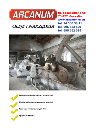 ul. Szczecińska 65 75-122 Koszalin www.arcanum-oil.pl OLEJE I NARZĘDZIA Profesjonalne doradztwo techniczne Możliwość przeprowadzenia szkoleń Produkty renomowanych firm Sprzedaż ratalna tel. 94 300 50 11 tel. 695 552 520 tel. 695 552 595 SPIS TREŚCI STR. Chemia przemysłowa 1 do 2 Oleje dla motoryzacji 3 Oleje przemysłowe 4 Oleje obróbkowe 5 Oleje dla rolnictwa 6 Oleje dla przemysłu spożywczego 7 Narzędzia warsztatowe 8 Elektronarzędzia 9 Akumulatory 9 Wycieraczki szyb 10 CHEMIA PRZEMYSŁOWA W ofercie firmy znajduje się profesjonalna chemia przemysłowa i samochodowa niemieckiej marki WEICON. Zaliczamy do niej: Środki odtłuszczające i myjące do metalu i tworzyw sztucznych Środki techniczne w aerozolu Smary silikonowe oraz na bazie teflonu Dostępne również środki niemieckiej firmy Granit 1. CHEMIA PRZEMYSŁOWA W ofercie pełna gama środków z przeznaczeniem dla motoryzacji i przemysłu amerykańskiej firmy GUNK Dostępne m.in..: Środki odtłuszczające i myjące Dodatki do różnego rodzaju produktów olejowych tj. uszczelniacze układów kierowniczych, uszczelniacze do chłodnic itp.. Penetratory Środki chemiczne w aerozolu 2 OLEJE DLA MOTORYZACJI W ofercie znajdują się sprawdzone produkty renomowanych koncernów europejskich i północno-amerykańskich: Oferta obejmuje środki smarne: PETRO CANADA EXXON MOBIL CASTROL STATOIL Oferta w/w produktów obejmuje zarówno oleje silnikowe jak i przekładniowe. Ponadto środki PETRO CANADA jako jeden z nielicznych producentów dostępnych na rynku w Polsce posiada charakterystyczny znak "donut" potwierdzający klasę API czyli Amerykańskiego Instytutu Naftowego. Oferta skierowana jest dla klientów indywidualnych, firm transportowych, firm handlowych oraz warsztatów. 3 Oleje przemysłowe Oferta obejmuje środki smarne z przeznaczeniem dla wielu gałęzi przemysłu. W ofercie znajdują się producenci następujących marek : Mobil, Statoil oraz Petro Canada. Wśród dostępnych olejów znajdują się: środki syntetyczne środki mineralne Rodzaje olejów: Oleje hydrauliczne dostępne w opakowaniach 20 oraz 208l (ISO VG od 2 do 150) Oleje do przekładni przemysłowych dostępne w opakowaniach 20 oraz 208l (ISO VG od 150 do 1000) Oleje turbinowe dostępne w opakowaniach 20 oraz 208l (ISO VG od 32 do 68) Oleje do prowadnic dostępne w opakowaniach 20 oraz 208l (ISO VG od 68 do 220) Smary dostępne w opakowaniach 400g, 18kg, 42 kg oraz 180kg (NLGI od 000 do 3) Oleje grzewcze dostępne w opakowaniach 20 oraz 208l Oleje transformatorowe Oleje sprężarkowe Oleje ochronne Oleje do urządzeń pneumatycznych (ISO VG od 32 do 68) Oleje do łańcuchów 4 Oleje obróbkowe W ofercie znajduje się bogata paleta produktów z przeznaczeniem dla przemysłu metalowego. Wśród znajdujących się w ofercie produktów dostępne są marki STATOIL oraz MOBIL. Ponadto oferta Statoil obejmuje środki z przeznaczeniem dla odlewni ciśnieniowych. Produkty z przeznaczeniem dla obróbki skrawaniem obejmują: Środki syntetyczne, półsyntetyczne oraz mineralne Zastosowanie: Frezowanie Toczenie Obróbka plastyczna Środki przeznaczone do honowania Najważnieszą rzeczą jest zapewnienie dobrej powierzchni obrabianej, dobrego odprowadzenia ciepła, dobrej ochrony narzędzia i detalu obrabianego, dobrej zmywalności oraz zapewnienia należytego bezpieczeństwa operatora. Te wszystkie cechy spełniają środki STATOIL, dlatego jesteśmy zdeterminowani w polecaniu środków tego producenta. 5 Oleje dla rolnictwa Rolnictwo jest branżą wymagającą specjalistycznych środków smarnych. Głównym celem jest zapewnienie najwyższej jakości olejów mogących sprostać wielu zadaniom. Stąd też producenci środków smarnych stworzyli wraz z firmami produkującymi maszyny rolnicze, oleje które mogą być zastosowane w wielu mechanizmach. Zaliczamy do nich: oleje silnikowo-hydrauliczno-przekładniowe (SUTO) oleje hydrauliczno-przekładniowe (UTTO) oleje silnikowe smary Wśród dostępnych marek znajdują się produkty STATOIL oraz GRANIT. 6 Oleje dla przemysłu spożywczego Oferta na środki smarne z dopuszczeniem dla przemysłu spożywczego obejmuje takich producentów jak: PETRO CANADA MOBIL STATOIL Wszystkie produkty posiadają dopuszczenia NSF H1 i mogą być stosowane w przemyśle spożywczym, gdzie występuje ryzyko incydentalnego styku produktów smarnych z żywnością. 7 Narzędzia warsztatowe Oferujemy Państwu narzędzia warsztatowe dla profesjonalistów jak również dla "majsterkowiczów". Oferta jaką chcemy Państwu przedstawić pozwala na zaopatrzenie Państwa firmy czy garażu w narzędzia pozwalające w bezproblemowy sposób usunąć każdą usterke w Państwa pojeździe. Wśród dostępnych narzędzi znajdują się: Narzędzia ręczne (HAZET, VIGOR, VARIANT) Narzędzia pneumatyczne tj. wysysarki, sprężarki, klucze pneumatyczne + akcesoria, Urządzenia dla serwisów ogumienia ISTNIEJE MOŻLIWOŚĆ ZAKUPÓW NA RATY!!! 8 Elektronarzędzia Posiadamy w swojej ofercie elektronarzędzia marki BOSCH. Akumulatory W swojej ofercie posiadamy akumulatory uznanej firmy ZAP. Dostępne zarówno akumulatory bezobsługowe jak również tradycyjne. Gwarancja na akumulatory obejmuje okres 2 lat. 9 Wycieraczki samochodowe Jesteśmy dystrybutorem wycieraczek VISEE. Oferta obejmuje wycieraczki zarówno do pojazdów osobowych jak również do pojazdów ciężarowych. ZAPRASZAMY DO ZAPOZNANIA SIĘ Z OFERTĄ I EWENTUALNEGO KONTAKTU W CELU PRZEDSTAWIENIA OFERTY BEZPOŚREDNIEJ 10