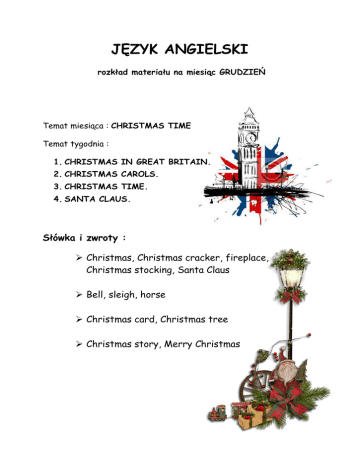 JĘZYK ANGIELSKI rozkład materiału na miesiąc GRUDZIEŃ Temat miesiąca : CHRISTMAS TIME Temat tygodnia : 1. CHRISTMAS IN GREAT BRITAIN. 2. CHRISTMAS CAROLS. 3. CHRISTMAS TIME. 4. SANTA CLAUS. Słówka i zwroty : Christmas, Christmas cracker, fireplace, Christmas stocking, Santa Claus Bell, sleigh, horse Christmas card, Christmas tree Christmas story, Merry Christmas PIOSENKI I WIERSZE : Jingle bells Jingle bells, jingle bells, Jingle all the way. Oh, what fun it is to ride, In a one horse open sleigh. Hey! Jingle bells, jingle bells, Jingle all the way. Oh, what fun it is to ride, In a one horse open sleigh. Dzwonki sań Pada śnieg, pada śnieg Dzwonią dzwonki sań Jak to miło gnać saniami w śnieżnobiałą dal. We wish you a Merry Christmas We wish you a Merry Christmas, we wish you a Merry Christmas, we wish you a Merry Christmas and a Happy New Year! Życzymy wam Wesołych Świąt Życzymy wam Wesołych Świąt, życzymy wam Wesołych Świąt, życzymy wam Wesołych Świąt i szczęśliwego Nowego Roku! Santa Claus We are waiting, we are waiting for our Santa Claus. He will bring us many presents and a lot of toys. Santa Claus, Santa Claus, he will bring us many presents and a lot of toys. We are waiting, we are waiting for our Santa Claus. He will bring us many fast cars and a lot of dolls. Santa Claus, Santa Claus, he will bring us many fast cars and a lot of dolls. Święty Mikołaj Czekamy, czekamy na naszego Świętego Mikołaja. On nam przyniesie dużo prezentów i mnóstwo zabawek. Święty Mikołaj, Święty Mikołaj, on nam przyniesie dużo prezentów i mnóstwo zabawek. Czekamy, czekamy na naszego Świętego Mikołaja. On nam przyniesie dużo wyścigówek i mnóstwo lalek. Święty Mikołaj, Święty Mikołaj, on nam przyniesie dużo wyścigówek i mnóstwo lalek. MERRY CHRISTMAS