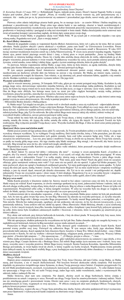 SYN O SWOJEJ MATCE O. Kornelian Dende Niech będzie pochwalony Jezus Chrystus! O. Kornelian Dende (12 maja 1985 r.): Robindranath Tagore, indyjski poeta, pisarz, filozof i laureat Nagrody Nobla w swojej książce pod tytułem „Dom i świat” napisał: „Wiem, że wszelka moc na świecie wzmoże się, jeśli sprzymierzymy się z szatanem. Ale – matka jest po to, by przeciwstawiać się szatanowi i przeszkadzać jego dziełu, nawet wtedy, gdy stoi całkiem sama”. Pierwszy człon zdania indyjskiego pisarza budzi grozę, bo za naszego życia – za czasów Hitlera i Stalina mogliśmy się przekonać o prawdziwości tych słów. Drugi człon tego zdania budzi w nas nadzieję, chociaż w latach sześćdziesiątych i siedemdziesiątych przeżyliśmy niezakończony jeszcze bunt kobiet feministek przeciwko macierzyństwu, który to bunt uderzył gwałtownie w instytucję rodziny i pociągnął za sobą rzeź niewiniątek w łonie matek. Matka chrześcijańska może uratować nasz świat od moralnej korupcji i powszechnej zagłady, do której dąży szatan przez swoje sługi. W dzisiejsze święto Matki, w pogadance ukażę wzór Matki Polki. W jej rysach jak w zwierciadle niejeden z nas ujrzy własną matkę. Pogadanka nosi tytuł: „Syn o swojej matce”. Ks. Karol (Bołoz) Antoniewicz Materiał do pogadanki czerpię ze wspomnień Karola (Bołoz) Antoniewicza, który żył z górą sto lat temu. Był on synem adwokata. Studia języków obcych i prawa ukończył z wynikiem „suma cum laude” na Uniwersytecie Lwowskim. Potem walczył w Powstaniu Listopadowym w korpusie generała J. Dwernickiego. Po powstaniu osiadł w Skwarzewie. W roku 1833 (tysiąc osiemset trzydziestym trzecim) ożenił się z Zofią Nikorowiczówną. W swym życiu przeżył niejedną tragedię. Najpierw śmierć ojca, potem śmierć pięciorga swoich dzieci i żony, o której pisze w swym pamiętniku: „Serce tej biednej Matki obumierało ze śmiercią każdego dziecka. Dusza Jej z każdą taka anielską duszą ulatywała do nieba, odprowadzała ją aż do progów wieczności, poczym tęsknota w świat wracała. Wypłakawszy wszystkie łzy serca, życie pomału ustawać poczęło. Iskra żywotna, wśród smutku, coraz słabiej i słabiej tlejąc, zgasła z życiem ostatniego dziecka, które do grobu złożyła”. To pierwsze, bolesne wspomnienie dobrej Matki, a jego żony, która na łożu śmierci, za zgodą małżonka, złożyła śluby zakonne jako Siostra Miłosierdzia, męża zaś upominała, by również poświęcił się Bogu. W tym samym pamiętniku Karol Antoniewicz naszkicował słowami portret swojej własnej matki. Okazją do naszkicowania jej duchowej sylwetki dało mu bolesne na zawsze z nią rozstanie. Bo Matka, po śmierci męża, synowej i wnuków, postanowiła wstąpić do klasztoru. Tam właśnie, w jej skromnej celi, przed wdzianiem habitu, spędziła z nią ostatnie chwile. Rozłąka wydobyła z serca najpierw wyznanie miłości. Oto jego treść. Wyznanie synowskiej miłości „Był to wieczór mroczny, jesienny, 24 listopada 1839 roku, gdym po raz ostatni pożegnał moją Matkę. Kochałem Ją całą potęgą mego serca, skrwawionego wprawdzie niejedną boleścią, ale nie zlodowaciałego żadną podłością. Kochałem ją nad życie, bo byłem Jej więcej winien niż to życie doczesne. Ona mi dała życie, co sięga w zaświaty: życie wiary, nadziei i miłości. Ona do Boga mnie zbliżyła, bez którego nasze życie na ziemi jest tylko ciągłym bezrządem, zaciętą walką, próżnym wysileniem, pracą bez pożytku, utarczką bez zwycięstwa, boleścią bez zasługi. Dziś moja Matka już w grobie spoczywa. Wkrótce ręka czasu zatrze napis na krzyżu Jej mogiły, a ręka śmierci zatrze moją pamięć wyrytą na sercu ukrzyżowanym. Ale wtedy ta pamięć przejdzie w żywot. – Miłosierdzie Boskie dziecko z Matką połączy. O, Matko moja! Tyś niegdyś na ten głos, co mimo woli w chwilach smutku z serca się wydobywał – odpowiadała słowem pociechy. Dziś odpowiadasz modlitwą Twoją u stóp tronu Bożego. Pierwej głos Twój odbijał się o uszy moje, dziś w głębi duszy dzwoni. A jeślim nie wydołał zarówno miłości Twojej opowiedzieć miłością, ach to dlatego jedynie, żem nie umiał taką miłością kochać Boga, jaką Tyś Go miłowała. Bo tylko miłość Boga może nauczyć takiej siły miłości, miłości wolnej od wszystkich brudów sobkostwa, zawsze gotowej poświęcić siebie samą. Twoja miłość ku mnie była tak jasną, świętą, czystą jak Twoja dusza, z której wypływała. Tyś przed śmiercią już była umarłą, umarłą dla świata, ale żyjącą dla nieba; umarłą dla siebie, ale żyjącą dla innych. W uczuciach Twoich nie było rozdwojenia. Bóg wyłącznie posiadał Twoją duszę i serce. Wszystko kochałeś dla Boga. Z dnia na dzień coraz jaśniej pojmuję i poznaję Ciebie. Opatrzność Boża czuwa nad dziełem matki Daleki jeszcze jestem od tego pokoju duszy jakiś Ty zażywała. Za Twoim przykładem usilnie o to dziś walczę. A czego nie wywalczę własnym wysiłkiem, Ty to wybłagasz Twoją modlitwą. Dziś każda chwilka, którą z Toba przeżyłem, jest dla mnie zbawiennym wspomnieniem. Zmarnowałem tych godzin niemało, bom czuł tylko szczęście będąc przy Tobie, ale z tego szczęścia nie umiał korzystać… Lecz nie, przy opiece i modlitwie Twojej, te chwile nie są stracone. Słowa Twoje były ziarnem, co padły na twardą glebę mego serca. Ale tego ziarnka ręką Matki zasianego, Bóg strzegł, i nie dozwolił, aby burze życia je rozwiały. Bóg ścisnął me serce do łez, aby wśród nich mogło zakiełkować”. Wspomnienie to przywiodło Karolowi na pamięć ciężkie walki młodości, które przeszedł zwycięsko dzięki modlitwom Matki i Bożej Opatrzności. „O, Boże! Jakżeś Ty zawsze był dobry i miłosierny dla mnie” – wyznaje w swym pamiętniku Karol. „Czyniłem co mogłem, aby Cię smucić, żeby