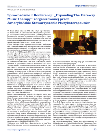 Implantoprotetyka 2009, tom X, nr 3 (36) Wioletta Bereziewicz - - - - - Sprawozdanie z Konferencji: „Expanding The Gateway Music Therapy” zorganizowanej przez Amerykańskie Stowarzyszenie Muzykoterapeutów W dniach 20-23 listopada 2008 roku odbyła się w Saint Louis Missouri USA X Jubileuszowa Konferencja Amerykańskiego Stowarzyszenia Muzykoterapeutów (AMTA) poświęcona problematyce szerzenia się dziedziny muzykoterapii na całym świecie. Konferencje organizowane przez AMTA od wielu lat cieszą się niezwykłym zainteresowaniem nie tylko wśród muzykoterapeutów z USA, ale też z innych państw. Celem konferencji było spotkanie specjalistów z wielu dziedzin i dyscyplin naukowych, zainteresowanych zagadnieniem zastosowania muzykoterapii w medycynie, muzyce, psychologii, psychiatrii oraz pedagogice specjalnej. W dniach 18-19-23 listopada 2008 roku w tym samym miejscu również odbywały się kursy i treningi sesji muzykoterapeutycznych. Natomiast pomiędzy poszczególnymi sesjami odbywały się pokazy instrumentów muzycznych współcześnie stosowanych w muzykoterapii oraz wystawa książek i publikacji. W konferencji wzięło udział 1300 osób z 29 różnych państw, członków i sympatyków American Association for Music Therapy (AAMT) oraz The National Association for Music Therapy (NAMT) i American Music Therapy Association (AMTA). Podczas konferencji wykłady w formie ustnych prezentacji odbywały się jednocześnie na 24 salach. Natomiast naukowa sesja plakatowa odbyła się podczas trzeciego dnia konferencji. Zaprezentowano na niej nowe osiągnięcia japońskiego ośrodka naukowego, które dotyczyły oddziaływania rytmu muzyki na zaburzenia poruszania się u pacjentów z korową ataksją. Natomiast amerykańskie ośrodki naukowe przedstawiły wiele ciekawych osiągnięć w terapii pracy z dziećmi w pediatrii NICU oraz w pedagogice specjalnej m.in. Centrum Muzykoterapii Nordoffa-Robinsa. Ważną grupą doniesień i prowadzonych projektów badawczych budzących wiele nadziei jest zastosowanie muzyki u pacjentów z chorobą nowotworową przez The University of Alabama. Dużym zainteresowaniem cieszyła się również sesja prowadzona przez prof. J.C. Gardinera pt. „Wpływ Neurologic Music Therapy na poszczególne struktury mózgu człowieka”. Prof. J. C. Gardiner zaprezentował oddziaływanie muzyki na relaksację mięśni szkieletowych i pobudzenie poszczególnych struktur anatomicznych mózgu otrzymując idealny stan do optymalnego uczenia się. Dowiedziono, że muzyka wpływa na każdego człowieka z powodu neurofizjologicznych struktur, które każda osoba wykorzystuje do odbierania i reagowania na dźwięk w formie muzyki. Ważnym doniesieniem było wyjaśnienie drogi bodźca dźwiękowego w postaci muzyki i przetwarzania go w korze mózgowej uwzględniając przy tym specjalizację półkul mózgowych (argumentując różne koncepcje i teorie działania muzykoterapii- posłużono się badaniami dodatkowymi tj.: EEG, EKG, EMG, MRI, PET). Wiele prac m.in. Prof. P. Kern z State University of New York New Paltz dotyczyło tematyki zastosowania muzyki w pracy w w w. i m p l a n t o p r o t e t y k a . e u Wykład prof. J.C. Gardinera z dziećmi autystycznymi odnosząc przy tym wiele różnorodnych sukcesów terapeutycznych. Fascynującym przeżyciem było uczestnictwo w warsztatach, podczas których praktykowano grę na przeróżnych instrumentach muzycznych. Wielkie wrażenie wywarło bez wątpienia wspólne improwizowanie podczas gry na bębnach „Drum Circle” prowadzone przez Artura Hulla, który potrafił niemal w kilka minut swym entuzjazmem i charyzmatycznym sposobem bycia zahipnotyzować setki osób, które bez przygotowania potrafiły wyrazić swoje emocje mając wrażenie jakby bycia w transie rytmu wspólnie percypowanego w sposób bardzo harmonijny tworząc nowe dzieło muzyczne. Prof. D. B.Taylor podczas pięciogodzinnego seminarium przedstawił biomedyczną teorię muzyki jako czynnika terapeutycznego w profesjonalnej praktyce oraz perspektyw badań nad bezpośrednim wpływem muzyki na ludzki układ nerwowy i doniesień dotyczących mechanizmu pracy mózgu jako ważne ogniwo pomiędzy efektem działania muzyki a reakcją zachowania się człowieka. Niezwykle ciekawą częścią prezentacji było poznanie funkcjonowania wysoko złożonego mózgu i głodu doświadczenia sensorycznego w formie stymulatora estetycznego jakim jest muzyka. Prof. D. B. Taylor posłużył się własnymi doświadczeniami poruszając bardzo ważny aspekt w funkcjonowaniu mózgu stosując różne techniki muzykoterapii (tj.: Behavioral Music Therapy, Nordoff-Robbins Music Therapy, Creative Music Therapy, Improvisational Music Therapy, Orff Schulwerk Music Therapy, Cognitive Music Therapy, Guided Imagery and Music, Neurologic Music Therapy, Dalcroze Approach to Music Therapy, Kindermusik and Music Therapy, Sociological Approach to Music Therapy, Psychodynamic Music Therapy) w różnych sytuacjach czy jednostkach chorobowych. W imieniu American Music Therapy Association zapraszam na XI Konferencję pt.: „Pacific Melodie: Catching Waves to the Future” 20-22 listopada 2009 r. – tym razem do San Diego w Californii. 53