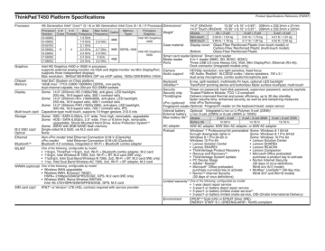 Product Specifications Reference (PSREF) ThinkPad T450 Platform Specifications Processor 4th Generation Intel® Core™ i3 / i5 or 5th Generation Intel Core i3 / i5 / i7 Processor Dimensions3 Processor # of # of Base Max Turbo Memory Processor Cache Number Cores Threads Frequency Frequency Types Graphics i3-4030U 1.9 GHz Intel HD Graphics 3MB 4400 i5-4300U 1.9 GHz 2.9 GHz i3-5010U 2.1 GHz i5-5200U 2 4 2.2 GHz 2.7 GHz 3MB DDR3L-1600 Intel HD Graphics i5-5300U 2.3 GHz 2.9 GHz 5500 i7-5500U 2.4 GHz 3 GHz 4MB i7-5600U 2.6 GHz 3.2 GHz 2 Weight 14.0" (WxDxH): 13.35" x 9.15" x 0.83"; 339mm x 232.5mm x 21mm 14.0" Touch (WxDxH): 13.35" x 9.15" x 0.91"; 339mm x 232.5mm x 23mm Models Non-touch Multi-touch No + 3-cell 3.58 lb / 1.63 kg 3.89 lb / 1.76 kg 3-cell + 3-cell 3.81 lb / 1.73 kg 4.11 lb / 1.87 kg 3-cell + 6-cell 4.21 lb / 1.91 kg 4.52 lb / 2.05 kg Display cover: Glass-Fiber Reinforced Plastic (non-touch model) or Carbon-Fiber Reinforced Plastic (multi-touch model); Bottom: Glass-Fiber Reinforced Plastic Smart card readerOptional: Smart card reader Media reader 4-in-1 reader (MMC, SD, SDHC, SDXC) Ports Three USB 3.0 (one Always On), VGA, Mini DisplayPort, Ethernet (RJ-45), Dock connector (integrated models only) Graphics Intel HD Graphics 4400 or 5500 in processor, supports external analog monitor via VGA and digital monitor via Mini DisplayPort; Camera HD720p resolution, low light sensitive, fixed focus supports three independent displays; Audio support HD Audio, Realtek® ALC3232 codec / stereo speakers, 1W x 2 / Max resolution: 3840x2160@60Hz (DP via mDP cable); 1920x1200@60Hz (VGA) dual array microphone, combo audio/microphone jack Chipset Intel SoC (System on Chip) platform Keyboard 6-row, spill-resistant, multimedia Fn keys, optional LED backlight Memory 16GB max7 / PC3-12800 1600MHz DDR3L, non-parity, UltraNav™ TrackPoint® pointing device and buttonless Mylar surface touchpad, multi-touch dual-channel capable, two 204-pin SO-DIMM sockets Security Power-on password, hard disk password, supervisor password, security keyhole Display Some: 14.0" (355mm) HD (1366x768), anti-glare, LED backlight, Security chip Trusted Platform Module, TCG 1.2-compliant 200 nits, 16:9 aspect ratio, 350:1 contrast ratio ThinkEngine Delivers improved thermal and power efficiency, up to 30 day standby, Some: 14.0" (355mm) HD+ (1600x900), anti-glare, LED backlight, faster resume time, enhanced security, as well as anti-tampering measures 250 nits, 16:9 aspect ratio, 400:1 contrast ratio Intel vPro Technology vPro (optional) Some: 14.0" (355mm) FHD (1920x1080), anti-glare, LED backlight, Fingerprint reader Optional: Fingerprint reader on the keyboard bezel, swipe sensor 300 nits, 16:9 aspect ratio, 700:1 contrast ratio, IPS Internal battery Optional: Integrated Li-Ion or Li-Polymer 3-cell (23Wh) Multi-touch (opt) Capacitive-type multi-touch, supports 10-finger gesture, 212.5 nits External battery Li-Ion 3-cell (23Wh) or 6-cell (48Wh or 72Wh) Storage Some: SSD / SATA 6.0Gb/s, 2.5" wide, 7mm high, removable, upgradable Max battery life10 Models 3-cell + 3-cell 3-cell + 6-cell 48Wh 3-cell + 6-cell 72Wh Some: HDD / SATA 6.0Gb/s, 2.5" wide, 7mm or 9.5mm high, removable, Battery life 10.08 hr 14.78 hr 19.78 hr upgradable, Shock Mounted Hard Drive, Active Protection System™ AC adapter 45W AC adapter, 65W Slim AC adapter, or 65W AC adapter Some: SSHD with 8GB NAND flash memory Single-sided M.2 SSD, via M.2 card slot M.2 SSD (opt) Preload Windows® 7 Professional 64 preinstalled Some: Windows 8.1 64-bit None Optical Some: Windows 8.1 Pro 64-bit through downgrade rights in Some: Windows 10 Pro 64 Windows 8.1 Pro 64-bit or Ethernet Non-vPro model: Intel Ethernet Connection I218-V (Clarkville) • Lenovo Solution Center Windows 10 Pro 64 vPro model: Intel Ethernet Connection I218-LM (Clarkville) • Lenovo SHAREit • Lenovo Solution Center Bluetooth™ Bluetooth 4.0 wireless, integrated in Wi-Fi + Bluetooth combo adapter • Lenovo REACHit • Lenovo SHAREit One of the following, configurable by model: WLAN4 • Lenovo Companion • ThinkVantage Product Recovery • 11b/g/n, ThinkPad 11b/g/n, 2x2, Wi-Fi + Bluetooth combo adapter, M.2 card • Microsoft Office preloaded; • Rescue and Recovery™ • 11b/g/n, Intel Wireless-N 7265, 2x2, Wi-Fi + BT, M.2 card (WE only) purchase a product key to activate • ThinkVantage System Update • 11a/b/g/n, Intel Dual Band Wireless-N 7265, 2x2, Wi-Fi + BT, M.2 card (WE only) • Norton Internet Security • PC Device Stage • 11ac, Intel Dual Band Wireless-AC 7265, 2x2, Wi-Fi + BT adapter, M.2 card ® ® (30 days of virus definitions, • Adobe Reader WWAN (optional) One of the following, configurable by model: Win8 w/o i5/i7 model) • Microsoft® Office preloaded; • Wireless WAN upgradable • McAfee® LiveSafe™ (30-day trial, purchase a product key to activate ® • Wireless WAN, Ericsson N5321, Win8 i5/i7 and Win10 model) • Norton™ Internet Security HSPA+ 21Mbps/GSM/GPRS/EDGE, GPS, M.2 card (WE only) (30 days of virus definitions) • Wireless WAN, Sierra Wireless EM7345, Limited warranty12 One of the following, configurable by model: Intel 4G LTE/HSPA/GSM/GPRS/EDGE, GPS, M.2 card • 1-year depot repair service SIM card (opt) AT&T® or Verizon® LTE (4G), contract required with service provider • 3-year/1-yr battery depot repair service • 3-year/1-yr battery limited onsite service24 • 3-year/1-yr battery limited onsite service, OID (Onsite International Delivery) Environment EPEAT™ Gold (US) or EPEAT Silver (WE); ENERGY STAR® 6.1; GREENGUARD®; RoHS-compliant Case material