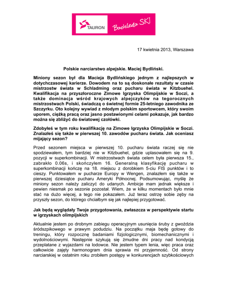 17 kwietnia 2013, Warszawa Polskie narciarstwo alpejskie. Maciej Bydliński. Miniony sezon był dla Macieja Bydlińskiego jednym z najlepszych w dotychczasowej karierze. Dowodem na to są doskonałe rezultaty w czasie mistrzostw świata w Schladming oraz pucharu świata w Kitzbuehel. Kwalifikacja na przyszłoroczne Zimowe Igrzyska Olimpijskie w Soczi, a także dominacja wśród krajowych alpejczyków na tegorocznych mistrzostwach Polski, świadczą o świetnej formie 25-letniego zawodnika ze Szczyrku. Oto kolejny wywiad z młodym polskim sportowcem, który swoim uporem, ciężką pracą oraz jasno postawionymi celami pokazuje, jak bardzo można się zbliżyć do światowej czołówki. Zdobyłeś w tym roku kwalifikację na Zimowe Igrzyska Olimpijskie w Soczi. Znalazłeś się także w pierwszej 10. zawodów pucharu świata. Jak oceniasz mijający sezon? Przed sezonem miejsca w pierwszej 10. pucharu świata raczej się nie spodziewałem, tym bardziej nie w Kitzbuehel, gdzie uplasowałem się na 9. pozycji w superkombinacji. W mistrzostwach świata celem była pierwsza 15., zabrakło 0.06s, i skończyłem 16. Generalną klasyfikację pucharu w superkombinacji kończę na 18. miejscu z dorobkiem 5-ciu FIS punktów i to cieszy. Punktowałem w pucharze Europy w Wengen, znalazłem się także w pierwszej dziesiątce pucharu Ameryki Północnej. Podsumowując, myślę że miniony sezon należy zaliczyć do udanych. Ambicje mam jednak większe i pewien niesmak po sezonie pozostał. Wiem, że w kilku momentach było mnie stać na dużo więcej, a tego nie pokazałem. Już teraz ostrzę sobie zęby na przyszły sezon, do którego chciałbym się jak najlepiej przygotować. Jak będą wyglądały Twoje przygotowania, zwłaszcza w perspektywie startu w igrzyskach olimpijskich Aktualnie jestem po drobnym zabiegu operacyjnym usunięcia śruby z gwoździa śródszpikowego w prawym podudziu. Na początku maja będę gotowy do treningu, który rozpocznę badaniami fizjologicznymi, biomechanicznymi i wydolnościowymi. Następnie szykują się żmudne dni pracy nad kondycją przeplatane z wyjazdami na lodowce. Nie jestem typem lenia, więc praca oraz całkowicie zajęty harmonogram dnia sprawia mi przyjemność. Od strony narciarskiej w ostatnim roku zrobiłem postępy w konkurencjach szybkościowych więc przed nadchodzącym sezonem więcej uwagi zwrócimy na slalom, w którym mam jeszcze niewykorzystane rezerwy. W przygotowaniach pomoże Ci także współpraca z programem TAURON Bachleda Ski. Przede wszystkim jest to dla mnie wielkie wyróżnienie być częścią ciekawego projektu, który stworzył Pan Andrzej Bachleda-Curuś. Dzięki temu być może skorzystam na wspólnym treningu z kadrą Francji. Z młodszymi zawodnikami programu TAURON Bachleda Ski chętnie podzielę się wiedzą i doświadczeniem. Wymienię również poglądy na temat techniki narciarskiej z Andrzejem BachledąCurusiem Juniorem, który nie tak dawno wzbudzał mój podziw swoimi osiągnięciami. Otrzymam także stypendium, którego nie otrzymuję ani z PKOL, ani z Polskiego Związku Narciarskiego. Czy wiesz może jak wyglądają treningi czołowych zawodników pucharu świata, czy znacznie różnią się od Twoich? Podczas zawodów pucharu świata często przebywamy razem z innymi zawodnikami na siłowni, czy salach fitness. Ich treningi na podtrzymanie formy niczym specjalnym nie różnią się od moich. Jednak w narciarskich przygotowaniach do sezonu sytuacja wygląda nieco inaczej. Zawodników z krajów alpejskich od lodowca dzieli kilka lub kilkadziesiąt kilometrów, dzięki czemu mogą sobie pozwolić na wypad na narty, gdy panuje ładna pogoda i idealne warunki. Po 3 - 4 dniach wracają do domów odpocząć i popracować nad kondycją. Kiedy my jedziemy w Alpy to minimum na 8 - 10 dni, tak aby chociaż połowę dni spędzić w dobrych warunkach pogodowych. Jeśli się uda choć tyle, to jest to już naprawdę dobry rezultat. Czesi oraz Słowacy pokazują jednak, że nawet mieszkając daleko od wysokich gór można rywalizować ze światową czołówka, więc nie pozostaje nam nic innego, jak wziąć się poważnie do roboty i nie zwracać uwagi na niedogodności. Jesteś obecnie uznawany za najlepszego polskiego alpejczyka. Startując w zawodach na najwyższym światowym poziomie jesteś zapewne w stanie ocenić poziom narciarstwa alpejskiego w Polsce? Często spotykam się z tego typu pytaniami, na które nie lubię odpowiadać. Do oceny aktualnego poziomu polskiego narciarstwa alpejskiego potrzeba takich zawodów jak np. mistrzostw świata, na których jako grupa wyselekcjonowanych, najlepszych polskich alpejczyków wypadliśmy słabo. Trzy miejsca w czołowej trzydziestce jak na nasz kraj to zdecydowanie za mało. Jeśli chodzi o polskie podwórko, to myślę, że jeśli zawodnik, który karierę profesjonalnego narciarza zakończył 7 lat temu (mowa o Michale Kałwie) i podczas trzech startów w tegorocznych mistrzostwach Polski seniorów zdobywa trzy medale wygrywając ze znacznie młodszymi kolegami, to znaczy, że coś jest nie tak. Patrząc na rozwój własnej kariery, jak myślisz, jakie są u nas główne przeszkody stojące na drodze młodego narciarza do osiągnięcia sukcesu? Moim zdaniem ważne jest, aby od wczesnego wieku trafić na dobrego trenera, który wprowadzi odpowiednie, pozytywne nawyki od strony technicznej oraz rozbuduje wszechstronnie cechy przyszłego zawodnika. Przyszły sezon przyniesie ze sobą Twój pierwszy start na zimowych igrzyskach olimpijskich. Jakie emocje się z tym wiążą? Nigdy wcześniej nie brałem udziału w zawodach o takiej randze, wiec ciężko o sprecyzowaną odpowiedź. Mam nadzieję, że podczas startów na igrzyskach zachowam spokój, tak jak w czasie każdych innych zawodów. Trzeba ten start przyjąć jako zabawę i czerpać z niego dużo radości, nie zapominając jednak o pełnej koncentracji i odpowiednim przygotowaniu! Igrzyska olimpijskie, to wielkie święto, o kt
