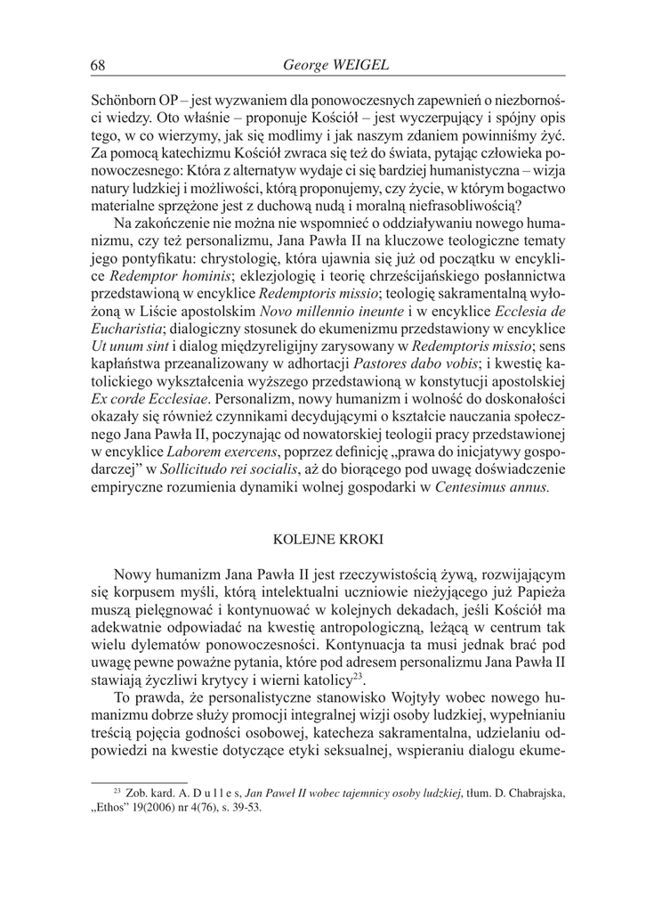 George WEIGEL 68 Schönborn OP – jest wyzwaniem dla ponowoczesnych zapewnień o niezborności wiedzy. Oto właśnie – proponuje Kościół – jest wyczerpujący i spójny opis tego, w co wierzymy, jak się modlimy i jak naszym zdaniem powinniśmy żyć. Za pomocą katechizmu Kościół zwraca się też do świata, pytając człowieka ponowoczesnego: Która z alternatyw wydaje ci się bardziej humanistyczna – wizja natury ludzkiej i możliwości, którą proponujemy, czy życie, w którym bogactwo materialne sprzężone jest z duchową nudą i moralną niefrasobliwością? Na zakończenie nie można nie wspomnieć o oddziaływaniu nowego humanizmu, czy też personalizmu, Jana Pawła II na kluczowe teologiczne tematy jego pontyfikatu: chrystologię, która ujawnia się już od początku w encyklice Redemptor hominis; eklezjologię i teorię chrześcijańskiego posłannictwa przedstawioną w encyklice Redemptoris missio; teologię sakramentalną wyłożoną w Liście apostolskim Novo millennio ineunte i w encyklice Ecclesia de Eucharistia; dialogiczny stosunek do ekumenizmu przedstawiony w encyklice Ut unum sint i dialog międzyreligijny zarysowany w Redemptoris missio; sens kapłaństwa przeanalizowany w adhortacji Pastores dabo vobis; i kwestię katolickiego wykształcenia wyższego przedstawioną w konstytucji apostolskiej Ex corde Ecclesiae. Personalizm, nowy humanizm i wolność do doskonałości okazały się również czynnikami decydującymi o kształcie nauczania społecznego Jana Pawła II, poczynając od nowatorskiej teologii pracy przedstawionej w encyklice Laborem exercens, poprzez definicję „prawa do inicjatywy gospodarczej” w Sollicitudo rei socialis, aż do biorącego pod uwagę doświadczenie empiryczne rozumienia dynamiki wolnej gospodarki w Centesimus annus. KOLEJNE KROKI Nowy humanizm Jana Pawła II jest rzeczywistością żywą, rozwijającym się korpusem myśli, którą intelektualni uczniowie nieżyjącego już Papieża muszą pielęgnować i kontynuować w kolejnych dekadach, jeśli Kościół ma adekwatnie odpowiadać na kwestię antropologiczną, leżącą w centrum tak wielu dylematów ponowoczesności. Kontynuacja ta musi jednak brać pod uwagę pewne poważne pytania, które pod adresem personalizmu Jana Pawła II stawiają życzliwi krytycy i wierni katolicy23. To prawda, że personalistyczne stanowisko Wojtyły wobec nowego humanizmu dobrze służy promocji integralnej wizji osoby ludzkiej, wypełnianiu treścią pojęcia godności osobowej, katecheza sakramentalna, udzielaniu odpowiedzi na kwestie dotyczące etyki seksualnej, wspieraniu dialogu ekume23 Zob. kard. A. D u l l e s, Jan Paweł II wobec tajemnicy osoby ludzkiej, tłum. D. Chabrajska, „Ethos” 19(2006) nr 4(76), s. 39-53. Ocalić „Gaudium et spes” 69 nicznego i międzyreligijnego, a nawet wyjaśnianiu doktryn takich, jak Trójca Święta, ale czy możemy powiedzieć, że równie dobrze „służy” ono wszędzie tam, gdzie chodzi o kwestie władzy państwowej? Co na przykład ma do powiedzenia nowy humanizm, gdy konflikty międzynarodowe stają się po prostu niemożliwe do rozwiązania, a dalsze negocjacje okazują się bezskuteczne, jak i niebezpieczne? Czy nowy humanizm Jana Pawła II prowadzi w praktyce do pacyfizmu, który utrzymuje milczące poparcie Kościoła dla tradycji wojny sprawiedliwej, de facto stawiając Kościół w opozycji do wszelkiego wykorzystywania siły zbrojnej? Czy oparty na szacunku dla ludzkiej godności i wyrastający z personalizmu sprzeciw wobec kary śmierci jest ostatnim słowem, które należy wypowiedzieć na ten trudny temat? Teologowie sympatyzujący z personalizmem Jana Pawła II wyrażają również obawy, o metodologiczne skutki tego stanowiska w teologii moralnej. Doświadczenie duszpasterskie wskazuje, że personalistyczna interpretacja zasadniczego nauczania wyrażonego w Humanae vitae odnosi dużo większy sukces niż tomistyczna teleologia, w którą swoje nauczanie wpisywał Paweł VI; czy jednak stanowisko to z czasem nie będzie budziło w Kościele tendencji do osłabiania świadomości ontologicznych wymiarów prawa moralnego? Podnoszone są również kwestie chrystologiczne i eschatologiczne: Czy nacisk, jaki nieżyjący dziś Papież kładł w swoim nauczaniu na osobę Chrystusa, którego posługa w doskonały sposób wyraża logikę daru, może prowadzić do swoistego zapomnienia przez Kościół o suwerennej władzy Pana Zmartwychwstałego, który jest nie tylko Sługą świata, ale również jego Sędzią? Bądź też związana z tym kwestia: Czy personalistyczna interpretacja oczyszczenia dokonującego się w czyśćcu, na którą Papież kładł nacisk, oznacza minimalizowanie czyśćca jako kary – wymiaru tak pięknie wyrażonego na przykład w elementach liturgii pogrzebowej i w „Czyśćcu” Dantego? Zmaganie się z tymi pytaniami przyczyni się nie do osłabienia, lecz do wzmocnienia tezy, że nowy humanizm Jana Pawła II, ujawniający się w jego personalizmie zarówno filozoficznym, jak i teologicznym, stanowi wyjątkowo cenne bogactwo pozwalające udzielić odpowiedzi na kwestię antropologiczną, która, jak sądzili Ojcowie soborowi, ma centralne znaczenie dla analizy kondycji ludzkiej we współczesnym świecie. Humanizm ten jest równie cennym bogactwem dla świata ponowoczesnego, którego bliskości na horyzoncie – jak się wydaje – w Gaudium et spes nie dostrzeżono. Rozwijanie i doskonalenie filozoficznej i teologicznej antropologii Jana Pawła II jest wobec tego kluczem pozwalającym ocalić duszpasterską konstytucję o Kościele w świecie współczesnym przed jej uwięzieniem w lochach lat sześćdziesiątych, gdzie umieszczają ją niektórzy jej krytycy. Tłum. z języka angielskiego Dorota Chabrajska