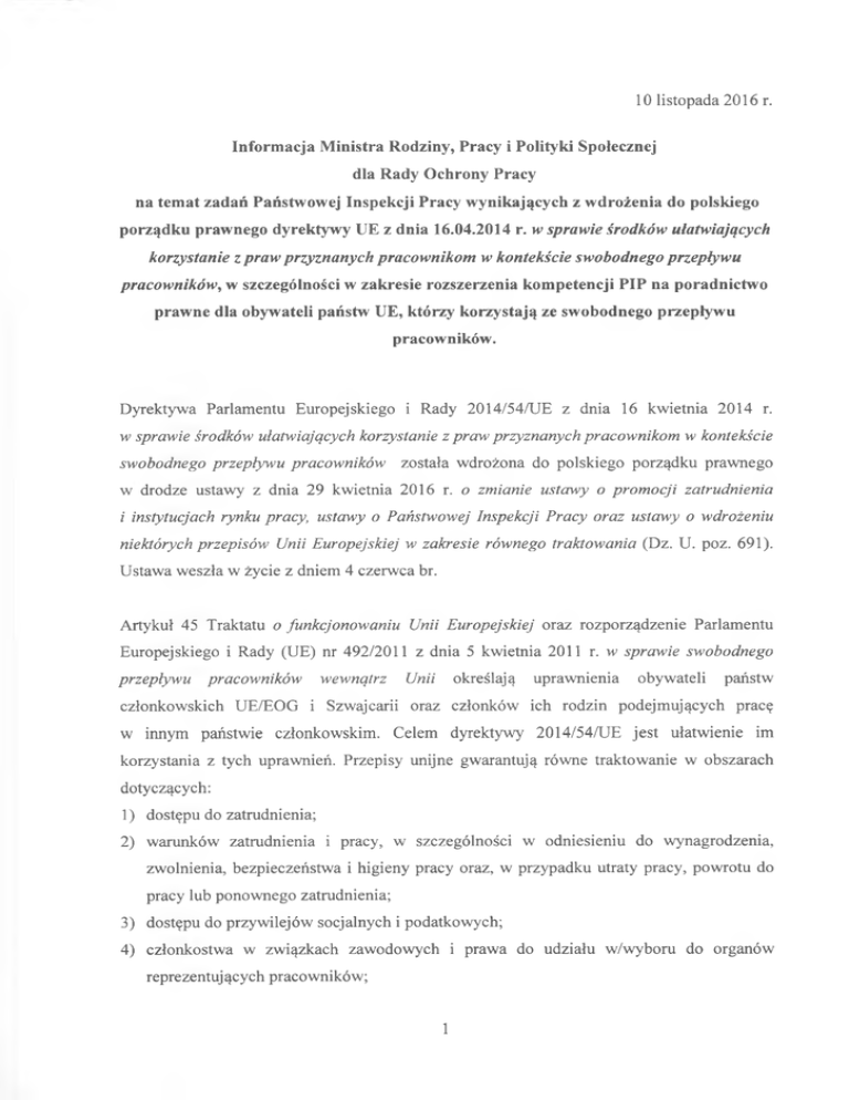 10 listopada 2016 r. Informacja Ministra Rodziny, Pracy i Polityki Społecznej dla Rady Ochrony Pracy na temat zadań Państwowej Inspekcji Pracy wynikających z wdrożenia do polskiego porządku prawnego dyrektywy UE z dnia 16.04.2014 r. w sprawie środków ułatwiających korzystanie z praw przyznanych pracownikom w kontekście swobodnego przepływu pracowników, w szczególności w zakresie rozszerzenia kompetencji PIP na poradnictwo prawne dla obywateli państw UE, którzy korzystają ze swobodnego przepływu pracowników. Dyrektywa Parlamentu Europejskiego i Rady 2014/54/UE z dnia 16 kwietnia 2014 r. w sprawie środków ułatwiających korzystanie z praw przyznanych pracownikom w kontekście swobodnego przepływu pracowników została wdrożona do polskiego porządku prawnego w drodze ustawy z dnia 29 kwietnia 2016 r. o zmianie ustawy o promocji zatrudnienia i instytucjach rynku pracy, ustawy o Państwowej Inspekcji Pracy oraz ustawy o wdrożeniu niektórych przepisów Unii Europejskiej w zakresie równego traktowania (Dz. U. poz. 691). Ustawa weszła w życie z dniem 4 czerwca br. Artykuł 45 Traktatu o funkcjonowaniu Unii Europejskiej oraz rozporządzenie Parlamentu Europejskiego i Rady (UE) nr 492/2011 z dnia 5 kwietnia 2011 r. w sprawie swobodnego przepływu pracowników wewnątrz Unii określają uprawnienia obywateli państw członkowskich UE/EOG i Szwajcarii oraz członków ich rodzin podejmujących pracę w innym państwie członkowskim. Celem dyrektywy 2014/54/UE jest ułatwienie im korzystania z tych uprawnień. Przepisy unijne gwarantują równe traktowanie w obszarach dotyczących: 1) dostępu do zatrudnienia; 2) warunków zatrudnienia i pracy, w szczególności w odniesieniu do wynagrodzenia, zwolnienia, bezpieczeństwa i higieny pracy oraz, w przypadku utraty pracy, powrotu do pracy lub ponownego zatrudnienia; 3) dostępu do przywilejów socjalnych i podatkowych; 4) członkostwa w związkach zawodowych i prawa do udziału w/wyboru do organów reprezentujących pracowników; 1 5) dostępu do szkoleń; 6) dostępu do zasobów mieszkaniowych; 7) dostępu do kształcenia, nauki zawodu oraz szkolenia zawodowego dla dzieci pracowników unijnych; 8) pomocy udzielanej przez urzędy pracy. Ustawa wyznacza Państwową Inspekcję Pracy jako instytucję odpowiedzialną w Polsce za udzielanie porad - w ww. zakresie - obywatelom państw UE i państw EFTA stron umowy o EOG, którzy korzystają z prawa do swobodnego przepływu pracowników, w celu wspierania równego traktowania. Państwowa Inspekcja Pracy została wskazana do tego zadania ze względu na dotychczasowe kompetencje i doświadczenia w zakresie udzielania porad pracownikom, w tym zagranicznym, co było jednocześnie rozwiązaniem najbardziej korzystnym z ekonomicznego punktu widzenia (utworzenie osobnej instytucji byłoby zbyt kosztowne biorąc pod uwagę liczbę pracujących w Polsce obywateli UE/EFTA). Istotne były także aspekty praktyczne z punktu widzenia potencjalnie korzystających z poradnictwa, czyli dostępność okręgowych inspektoratów pracy oraz fakt, że cały zakres poradnictwa wymagany przez dyrektywę jest udzielany w jednym miejscu. > Państwowa Inspekcja Pracy ma prawo - w uzasadnionych przypadkach - występować do organów administracji publicznej, w tym naczelników urzędów skarbowych i dyrektorów izb skarbowych, a także Zakładu Ubezpieczeń Społecznych oraz innych właściwych podmiotów z wnioskiem o udzielenie informacji niezbędnych do udzielenia tych porad. Podmioty te mają obowiązek udzielenia informacji Państwowej Inspekcji Pracy w ciągu 15 dni (chyba, że konieczne jest uprzednie przeprowadzenie postępowania wyjaśniającego lub kontroli). Główny Inspektor Pracy opracował szczegółowe zasady realizacji poradnictwa prawnego dla obywateli państw UE/ EFTA przez poszczególne komórki Państwowej Inspekcji Pracy. Dla kompleksowego przedstawienia problematyki warto dodać, że ww. ustawa dodaje do katalogu zadań ministra właściwego ds. pracy zadania monitorowania, analizy i wspierania równego traktowania osób korzystających z prawa do swobodnego przepływu pracowników, oraz członków ich rodzin w zakresie, o którym mowa w art. 1-10 rozporządzenia 492/2011. Minister Rodziny, Pracy i Polityki Społecznej zobowiązany jest do monitorowania działań mających na celu przeciwdziałanie nieuzasadnionym ograniczeniom i przeszkodom w zakresie prawa do swobodnego przepływu pracowników oraz ich dyskryminacji, zapewnienia informacji, zlecania niezależnych badań i sondaży, publikowanie niezależnych raportów i rekomendacji. Ustawa wyznacza także ministrowi właściwemu ds. pracy pełnienie funkcji Krajowego Punktu Kontaktowego dla odpowiadających mu punktów kontaktowych w innych państwach członkowskich. Zadanie to w ramach ministerstwa realizuje Departament Rynku Pracy. Zlecenie pierwszego badania - z wykorzystaniem środków Funduszu Pracy - przewidziane jest na 2017 r. Kolejne badania mają być zlecane co 3 lata, a po 10 latach od wejścia w życie ustawy przewidziane jest duże badanie ewaluacyjne. Trwają obecnie końcowe prace nad aktualizacją broszury EURES i strony internetowej EURES o prawa mobilnych obywateli UE/EFTA z zakresu swobodnego przepływu pracowników (w języku polskim oraz angielskim, broszura także w języku niemieckim). Według informacji przekazanych przez PIP w okresie od dnia 4 czerwca 2016 r. (tj. daty wejścia w życie ustawy z dnia 29 kwietnia 2016 r.) do dnia 7 października 2016 r.: a. do Głównego Inspektoratu Pracy nie były kierowane zapytania przez obywateli państw członkowskich UE/EFTA, którzy korzystają z prawa do swobodnego przepływu pracowników, ani też przez członków ich rodzin, odnośnie do problematyki wskazanej w art. 10 ust. 1 pkt 14a ustawy o PIP; b. Okręgowe Inspektoraty Pracy (w tym OIP Bydgoszcz, OIP Warszawa i OIP Opole) otrzymały łącznie 14 zapytań wr zakresie ww. problematyki. Dotyczyły one: - dostę