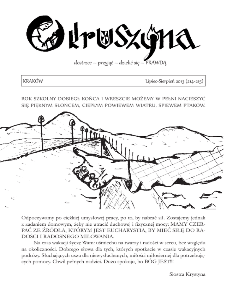 dostrzec – przyjąć – dzielić się – PRAWDĄ KRAKÓW Lipiec-Sierpień 2013 (214-215) Rok szkolny dobiegł końca i wreszcie możemy w pełni nacieszyć się pięknym słońcem, ciepłym powiewem wiatru, śpiewem ptaków. Odpoczywamy po ciężkiej umysłowej pracy, po to, by nabrać sił. Zostajemy jednak z zadaniem domowym, żeby nie utracić duchowej i fizycznej mocy: MAMY CZERPAĆ ZE ŹRÓDŁA, KTÓRYM JEST EUCHARYSTIA, BY MIEĆ SIŁĘ DO RADOŚCI I RADOSNEGO MIŁOWANIA. Na czas wakacji życzę Wam: uśmiechu na twarzy i radości w sercu, bez względu na okoliczności. Dobrego słowa dla tych, których spotkacie w czasie wakacyjnych podróży. Słuchających uszu dla niewysłuchanych, miłości miłosiernej dla potrzebujących pomocy. Chwil pełnych nadziei. Dużo spokoju, bo BÓG JEST!!! Siostra Krystyna 2 Okruszyna Okruszyna Zmiłuj się nade mną, Boże, w swojej łaskawości, w ogromie swego miłosierdzia wymaż moją nieprawość. Ps 51, 3 KRÓL DAWID. Pierwszy raz spotykamy go na kartach Pisma Świętego w Pierwszej Księdze Samuela i od tego miejsca ciągle autorzy do niego wracają. A my wiemy, że przecież potomkiem Dawida jest sam Pan Jezus. Bóg odrzucił Saula jako króla za brak wierności Jego poleceniom. W związku z tym prorok Samuel otrzymał misję namaszczenia nowego króla. Miał on pochodzić z Betlejem, z domu Jessego. Prorok, widząc dobrze zbudowanych i pięknych synów Jessego, pomyślał, że na pewno wśród nich znajduje się przyszły wódz Izraela. Ale Bóg udziela nam pierwszej lekcji. Patrzy na serce, a nie na to, co zewnętrzne i miłe dla oka. Dawid pod żadnym względem nie pasował po ludzku na króla, a jednak nim został. Autor tak scharakteryzował Dawida: był on rudy, miał piękne oczy i pociągający wygląd (1Sm 16,12). Kompletnie nie umiał posługiwać się mieczem ani chodzić w zbroi. A jednak to on pokonał Goliata, przed którym drżeli pozostali. Dawid na życzenie Saula zamieszkał w jego domu, bo pięknie grał na cytrze. I choć z czasem Saul zaczął Dawidowi zazdrościć i go nienawidzić, ten w nigdy w życiu nie podniósł ręki na Pomazańca Pańskiego. Dawid może nas nauczyć prawdziwej przyjaźni. Sposób, w jaki opisana jest przyjaźń Dawida i syna Saula, Jonatana, może poruszać. Cenili sobie tę relację bardziej niż życie, sukcesy jednego z nich były zarazem sukcesami drugiego. Jednak wybrałam postać króla Dawida na te wakacyjne rozważania z innego powodu. Dawid pozostaje dla mnie osobiście wzorem prawdziwej pokuty za swoje grzechy i przyjęcia bez skargi wszystkich konsekwencji, jakie one niosą ze sobą. Dawid uwiódł żonę swego najlepszego żołnierza Uriasza. Batszeba poczęła dziecko, a Dawid zaczął kombinować. Nie chciał się przyznać. Sprowadził Uriasza, ale ten, zwyczajem żołnierza będącego na wojnie, nie wstąpił do swej żony. Upił go, a mimo to Uriasz do żony nie wstąpił. Dawid więc napisał list do dowódcy Joaba, obmyślając plan tak, żeby mąż Batszeby zginął. I tak się stało. Uriasz zawiózł wyrok na swoje życie. Ale postępek króla nie spodobał się Bogu. Przysłał mu proroka Natana. Ten opowiedział Dawidowi historię bogacza, który wziął i zabił jedyną owcę ubogiego człowieka. Król Dawid oburzył się postępkiem owego bogacza, a prorok Natan powiedział mu: Ty jesteś tym człowiekiem… (2Sm 12,1nn). I od tego momentu zaczęła się pokuta Dawida. Żałował, pościł, błagał Boga, żeby nie odbierał mu dziecka Batszeby, ale Pan postanowił inaczej. Dawid wszystko przyjął. Kochał Boga. Popełnił grzech z ludzkiej słabości, ale sposób jego 3 pokuty był wielki. Nie kłócił się z Bogiem, nie zwątpił, nie odszedł, ale zrozumiał, że trzeba przyjąć wszystkie konsekwencje grzechu. Choć przez długi czas musiał uciekać przed własnymi synami, choć go przeklinano i obwiniano, Dawid pozostał wierny Bogu. Płakał po śmierci syna Absaloma, który przecież spowodował mu tyle bólu i cierpienia. Płakał, żałował i myślał tylko o Bogu. Chciał zbudować Mu dom. A co my z tego możemy zaczerpnąć? Łatwo jest popełnić grzech, ale o wiele trudniej jest się do niego przyznać i pokutować. A jeszcze trudniej uwierzyć, że Bóg mi przebaczył. Jeżeli jednak wyznałem wszystko szczerze, to tak się dzieje. Czasem jednak trudno uwierzyć nam w Boże przebaczenie, bo sami nie potrafimy przebaczyć sobie. A Dawid pokazuje inną drogę. Polecam lekturę Ksiąg Samuela na czas wakacyjnego wypoczynku. I uwierzmy w Boże miłosierdzie! Siostra Angela , , Duchowosc , Dominikanska Błogosławiony Reginald z Orleanu Jakie czynniki mają wpływ na to, jacy jesteśmy? Bez wątpienia bardzo dużą rolę odgrywa w tym względzie to, co oglądamy. W każdej chwili jesteśmy wprost bombardowani ogromną ilością informacji i obrazów. Udział w kształtowaniu naszego sposobu myślenia ma to, co słyszymy – muzyka, audycje radiowe czy przypadkowo usłyszane fragmenty rozmów. Myślę jednak, że największy wpływ na naszą formację mają spotkania z innymi ludźmi. Przysłowie „z jakim przestajesz, takim się stajesz” niesie w sobie wiele mądrości. To nasze otoczenie ma wpływ na to, jakie prezentujemy poglądy czy w jaki sposób się zachowujemy. Bywają spotkania, które odmieniają całe nasze życie – ktoś swoim przykładem sprawi, że zainteresujemy się czymś i stanie się to naszą pasją, ktoś inny poprzez zdecydowane wyrażenie swojego poglądu sprawi, że przyjmiemy daną myśl za swoją i będziemy zgodnie z nią postępować. Takie spotkania miały miejsce także w życiu świętych. Jednym z naszych braci, którego życie zmieniło się po spotkaniu z drugim człowiekiem, był bł. Reginald z Orleanu. 4 Okruszyna O dzieciństwie i młodości Reginalda nie wiemy dużo. Urodził się prawdopodobnie ok. 1183 r. w Saint-Gilles na południu Francji. Kolejna sprawdzona informacja, jaką posiadamy o naszym bohaterze 