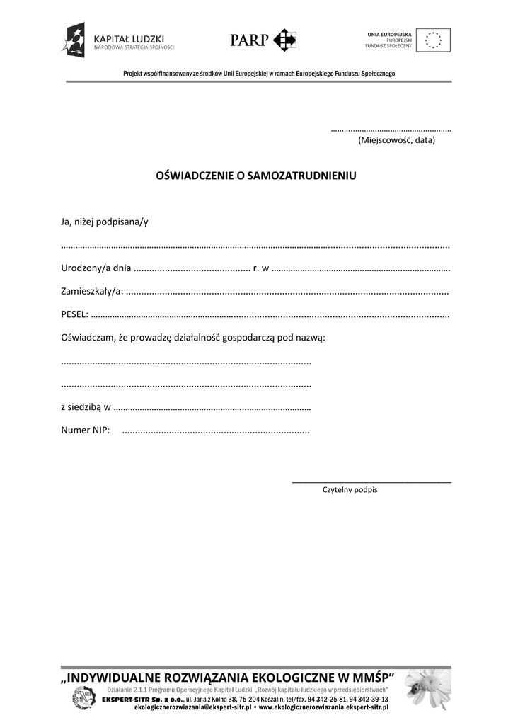 ………..……….…………………….……… (Miejscowość, data) OŚWIADCZENIE O SAMOZATRUDNIENIU Ja, niżej podpisana/y ………………………………………………………………………………………….………............................................... Urodzony/a dnia ............................................. r. w ………………………………………………..………………. Zamieszkały/a: ............................................................................................................................ PESEL: ……………………………………………………................................................................................... Oświadczam, że prowadzę działalność gospodarczą pod nazwą: ................................................................................................ ................................................................................................ z siedzibą w ………………………………………………..……………………… Numer NIP: ........................................................................ _______________________________ Czytelny podpis