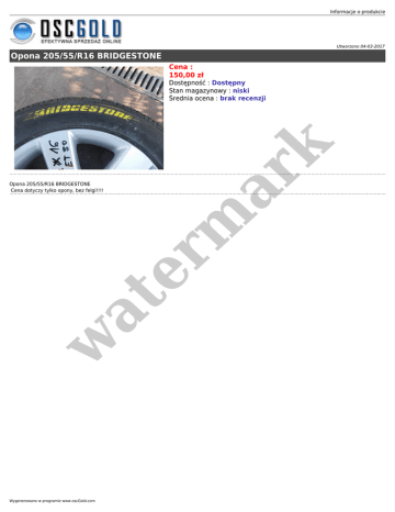 Informacje o produkcie Utworzono 04-03-2017 Opona 205/55/R16 BRIDGESTONE Cena : 150,00 zł w at Opona 205/55/R16 BRIDGESTONE Cena dotyczy tylko opony, bez felgi!!!! er m ar k Dostępność : Dostępny Stan magazynowy : niski Średnia ocena : brak recenzji Wygenerowano w programie www.oscGold.com