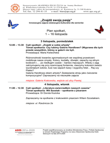 Sto war z ys z e ni e AK ADE MI A P EŁ NI ŻY CI A i m. J o an n y B o e h nert ul . W ł ad ys ła wa Ło k ie t k a 5 7 a/3 9 , 3 1 -2 7 9 K ra kó w Miej sce zaj ęć i ad r es d o ko r esp o nd e ncj i: ul. R ze źn icz a 2 a, 3 1 -5 4 0 K ra kó w Tel./fax. 12 294 -81-35 e-mail: [email protected] www.apz.org.pl r „Znajdź swoją pasję” Innowacyjne zajęcia edukacyjno-kulturalne dla seniorów Plan spotkań, 1 – 16 listopada 3 listopada, poniedziałek 12.00 – 13.30 Cykl spotkań: „Znajdź w sobie artystę” Temat spotkania: Czy lubimy Galerie Handlowe? (Wyprawa dla tych przede wszystkim, którzy w galerii nie byli. Prowadząca: Maria Kwiecińska Różnorodność towarów zgromadzonych we wspólnej przestrzeni mobilizuje nasze zmysły. Kolory, kształty, dźwięki, zapachy są silnym bodźcem i…. po niedługim czasie – bardzo męczącym. Wtedy z ulgą zatrzymujemy się przy szemrzącej fontannie, cieszymy kolorami świeżo wyciśniętych soków, kusi nas sapach kawy i wygodny fotel… Raj czy Piekło? Galeria Handlowa okiem artysty? Zestawianie stroju jako ćwiczenie kompozycyjne? Zapraszamy na niezwykłe zajęcia miejsce: Galeria Krakowska, wejście od ulicy Pawiej. 4 listopada, wtorek 11.00 – 12.30 Cykl spotkań: „Literatura zwierciadłem naszych czasów” Temat spotkania: Wit Szostak – spotkanie z pisarzem Prowadząca: Dr Dorota Kozicka Zapraszamy na spotkanie z krakowskim pisarzem Witem Szostakiem. miejsce: ul. Rzeźnicza 2a Projekt współfinansowany ze środków Ministerstwa Pracy i Polityki Społecznej w ramach Rządowego Programu na rzecz Aktywności Społecznej Osób Starszych na lata 2014-2020 5 listopada, środa 9.00 – 10.30 Cykl spotkań: „Życie jest teatrem” Temat spotkania: Rewizje romantyczne. Prowadząca: Daria Gosek O współczesnych odczytaniach literatury i kultury romantycznej w teatrze (wykład z fragmentami spektakli). miejsce: ul. Rzeźnicza 2a 11.00 – 12.30 Cykl spotkań: „Umysł – mózg – ciało” Temat spotkania: „Pamięć znana i nie znana” Prowadząca: Barbara Kaszkur-Niechwiej Co tak naprawdę siedzi w naszej pamięci, jak przywołujemy wspomnienia a jak naszą wiedzę i umiejętności. Co zawdzięczamy zapominaniu i czy to my posiadamy pamięć, czy może to pamięć posiada nas. miejsce: ul. Rzeźnicza 2a 6 listopada, czwartek 12.00 – 13.30 Cykl spotkań: „Podróże z poezją w czasie i przestrzeni” Temat spotkania: „Spotkanie z myślą” Prowadzący: prof. Artur Grabowski Zapraszamy do rozmowy o poezji. Punktem wyjścia będą utwory – W. H. Audena i Emily Dickinson miejsce: ul. Rzeźnicza 2a 14.00 – 15.30 Cykl spotkań: „Aktywny umysł – zdrowsze ciało” Temat spotkania: Moja pasja, moja radość. Jakie działania sprawiają nam radość? Czy warto mieć hobby? Co jest przyczyną drobnych codziennych radości? Jak rozwijać pasję? miejsce: ul. Rzeźnicza 2a Projekt współfinansowany ze środków Ministerstwa Pracy i Polityki Społecznej w ramach Rządowego Programu na rzecz Aktywności Społecznej Osób Starszych na lata 2014-2020 7 listopada, piątek Cykl spotkań: „A co na to Sokrates?” Temat spotkania: „Etyka wartości” Prowadząca: dr Małgorzata Baranowska 9.30-11.00 Jakie jest nasze doświadczenie wartości? Jakie jest ich źródło? Czy jest jakiś wzorzec porządku wartości? Jeśli tak, to dlaczego go często nie rozpoznajemy? O naszym zagubieniu w "królestwie" wartości pisali, z różnych perspektyw, Nietzsche, Scheler, Tischner; i to nieraz bardzo krytycznie miejsce: ul. Rzeźnicza 2a 13.00 – 14.30 Cykl spotkań: „Kraków jakiego nie znamy” Temat spotkania: „Z północy na południe, czyli Kraków w pigułce” Prowadząca: Elżbieta Lang Zapraszamy na spacer Drogą Królewską. Będzie to opowieść o lokacji miasta, murach obronnych, miejskich budowlach, gwarnym rynku i życiu królewsko- mieszczańskiego Krakowa. Spotykamy się pod Barbakanem o godzinie 13.00: 12 listopada, środa 11.00 – 12.30 Cykl spotkań: „Życie jest teatrem” Temat spotkania: „Czy teatr ma płeć?” Prowadząca: Daria Gosek Zapraszamy na wykład/dyskusję "Her-storie (jej historie) w teatrze. Czy teatr ma płeć?" Przed spektaklem „Wanda” Sylwii Chutnik i Patrycji Dołowy w reżyserii Pawła Passinieniego. miejsce: ul. Rzeźnicza 2a Projekt współfinansowany ze środków Ministerstwa Pracy i Polityki Społecznej w ramach Rządowego Programu na rzecz Aktywności Społecznej Osób Starszych na lata 2014-2020 14 listopada, piątek 9.00 – 10.30 Cykl spotkań: „Pamięci przemów” Temat spotkania: "W księgach zapisane" Wiele osób pamięta jak w dzieciństwie rodzice lub dziadkowie czytali im przed snem książki. Inni w młodości, po nocach, pod pierzyną, chowając się przed dorosłymi zaganiającymi do spania, śledzili losy bohaterów swoich ulubionych powieści. W trakcie zajęć porozmawiamy o ważnych dla nas książkach, o tym dlaczego je pamiętamy, czego nas uczyły, dlaczego nas interesowały. Które z nich polecilibyśmy dziś młodszym pokoleniom? Do których w dalszym ciągu wracamy? miejsce: ul. Rzeźnicza 2a 13.00 – 14.30 Cykl spotkań: „Kraków – krótki przewodnik historii sztuki” Temat spotkania: „Nowe miasto – nowy styl, czyli modernizm w Nowej Hucie” Prowadząca: Elżbieta Lang, gość specjalny Paweł Jagło O Nowej Hucie opowiedziano wiele historii, dlatego też powstało wiele mitów. Na wycieczce z pl. Centralnego w kierunku Arki Pana zmierzymy się z "miastem bez Boga", komunistyczną przeszłością, próbą stworzenia "nowego człowieka" w nowoczesnym mieście. Zobaczymy to na przykładzie architektury modernizmu powojennego w zestawieniu z osławionym socrealizmem oraz w opowieściach o życiu nowohucian. Zbiórka- 13.00 - u wylotu Alei Róż przy Placu Centralnym (najlepszy dojazd tramwajami: 4, 10, 22) Udział we wszystkich zajęciach jest bezpłatny. Na każde ze spotkań, a także na konsultacje indywidualne obowiązują os