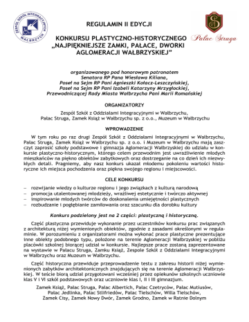 REGULAMIN II EDYCJI KONKURSU PLASTYCZNO-HISTORYCZNEGO „NAJPIĘKNIEJSZE ZAMKI, PAŁACE, DWORKI AGLOMERACJI WAŁBRZYSKIEJ” organizowanego pod honorowym patronatem Senatora RP Pana Wiesława Kiliana, Poseł na Sejm RP Pani Agnieszki Kołacz-Leszczyńskiej, Poseł na Sejm RP Pani Izabeli Katarzyny Mrzygłockiej, Przewodniczącej Rady Miasta Wałbrzycha Pani Marii Romańskiej ORGANIZATORZY Zespół Szkół z Oddziałami Integracyjnymi w Wałbrzychu, Pałac Struga, Zamek Książ w Wałbrzychu sp. z o.o., Muzeum w Wałbrzychu WPROWADZENIE W tym roku po raz drugi Zespół Szkół z Oddziałami Integracyjnymi w Wałbrzychu, Pałac Struga, Zamek Książ w Wałbrzychu sp. z o.o. i Muzeum w Wałbrzychu mają zaszczyt zaprosić szkoły podstawowe i gimnazja Aglomeracji Wałbrzyskiej do udziału w konkursie plastyczno-historycznym, którego celem przewodnim jest uwrażliwienie młodych mieszkańców na piękno obiektów zabytkowych oraz dostrzeganie na co dzień ich niezwykłych detali. Pragniemy, aby nasz konkurs ukazał młodemu pokoleniu wartości historyczne ich miejsca pochodzenia oraz piękna swojego regionu i miejscowości. CELE KONKURSU rozwijanie wiedzy o kulturze regionu i jego związkach z kulturą narodową promocja utalentowanej młodzieży, wrażliwej estetycznie i twórczo aktywnej inspirowanie młodych twórców do doskonalenia umiejętności plastycznych rozbudzanie i pogłębianie zamiłowania oraz szacunku dla dorobku kultury Konkurs podzielony jest na 2 części: plastyczną i historyczną. Część plastyczna przewiduje wykonanie przez uczestników konkursu prac związanych z architekturą niżej wymienionych obiektów, zgodnie z zasadami określonymi w regulaminie. W porozumieniu z organizatorami można wykonać prace plastyczne prezentujące inne obiekty podobnego typu, położone na terenie Aglomeracji Wałbrzyskiej w pobliżu placówki szkolnej biorącej udział w konkursie. Najlepsze prace zostaną zaprezentowane na wystawie w Pałacu Struga, Zamku Książ, Zespole Szkół z Oddziałami Integracyjnymi w Wałbrzychu oraz Muzeum w Wałbrzychu. Część historyczna przewiduje przeprowadzenie testu z zakresu historii niżej wymienionych zabytków architektonicznych znajdujących się na terenie Aglomeracji Wałbrzyskiej. W teście biorą udział przygotowani wcześniej przez opiekunów szkolnych uczniowie klas V i VI szkół podstawowych oraz uczniowie klas I, II i III gimnazjum. Zamek Książ, Pałac Struga, Pałac Albertich, Pałac Czetryców, Pałac Mutiusów, Pałac Jedlinka, Pałac Stlifriedów, Pałac Tielschów, Willa Tielschów, Zamek Cisy, Zamek Nowy Dwór, Zamek Grodno, Zamek w Ratnie Dolnym ZASADY UCZESTNICTWA Technika wykonania prac: rysunek, malarstwo, collage, grafika warsztatowa, batik. Każdy uczestnik konkursu plastycznego może wykonać jedną pracę w formacie A3 (297 mm x 420 mm). Na odwrocie pracy należy umocować w trwały sposób kartę zgłoszeniową. Prac prosimy nie zwijać w rulon, nie oprawiać, nie zginać. Warunkiem udziału w części historycznej jest przesłanie przez opiekuna szkolnego zgłoszenia zawierającego dane szkoły (nazwa, adres i numer placówki) oraz listy uczestników (imię, nazwisko, wiek uczestnika). CZAS TRWANIA KONKURSU - TERMINY Prace plastyczne z wypełnionymi kartami zgłoszenia należy dostarczyć osobiście lub pocztą do sekretariatu szkoły do dnia 26 marca 2015 r. (data stempla pocztowego). Ogłoszenie wyników konkursu plastycznego na stronach internetowych Zespołu Szkół z Oddziałami Integracyjnymi (www.zsi.edu.pl) nastąpi w terminie do 10 kwietnia 2015 r. Termin przesyłania zgłoszeń do udziału w części historycznej: 12 marca 2015 r. W dniu 16 kwietnia 2015 r. o godz. 10:00 w Pałacu Struga zostanie przeprowadzony test z zakresu wiedzy historycznej, a po jego rozstrzygnięciu odbędzie się uroczyste podsumowanie całego konkursu połączone z wernisażem wystawy plastycznej oraz wręczeniem nagród i wyróżnień laureatom obu części konkursu. POSTANOWIENIA OGÓLNE Organizator zastrzega sobie prawo wykonania dokumentacji w formie biuletynów, katalogów oraz publikacji nadesłanych prac w mediach telewizyjnych, internetowych, prasowych i innych bez uiszczania autorom honorariów. Prace nagrodzone przechodzą na własność organizatora i nie będą odsyłane. Pozostałe prace można odebrać po zakończeniu wystaw. Udział w konkursie jest równoznaczny z akceptacją Regulaminu oraz wyrażeniem zgody na przetwarzanie danych osobowych uczestnika przez Organizatorów w zakresie niezbędnym do przeprowadzenia konkursu oraz dalszego wykorzystania prac. Organizator zastrzega sobie prawo zmiany niniejszego regulaminu. Udział w konkursie jest bezpłatny. Szczegółowe informacje o Konkursie można uzyskać za pośrednictwem poczty elektronicznej: [email protected]. II EDYCJA KONKURSU PLASTYCZNO-HISTORYCZNEGO „Najpiękniejsze zamki, pałace, dworki Aglomeracji Wałbrzyskiej” CZĘŚĆ PLASTYCZNA Imię i nazwisko uczestnika: Wiek uczestnika: Klasa: Prezentowany obiekt: Nazwa i adres szkoły: Adres e-mail szkoły: Imię i nazwisko nauczyciela / Podpis Pieczęć szkoły II EDYCJA KONKURSU PLASTYCZNO-HISTORYCZNEGO „Najpiękniejsze zamki, pałace, dworki Aglomeracji Wałbrzyskiej” CZĘŚĆ HISTORYCZNA Lp. Imię i nazwisko uczestnika Wiek 1. 2. 3. Nazwa i adres szkoły: Adres e-mail szkoły: Imię i nazwisko nauczyciela / Podpis Pieczęć szkoły Klasa