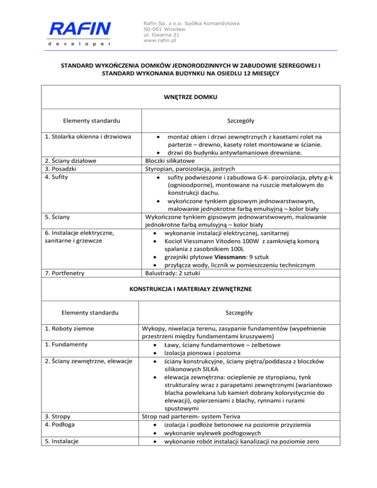 Rafin Sp. z o.o. Spółka Komandytowa 50-001 Wrocław ul. Gwarna 21 www.rafin.pl STANDARD WYKOŃCZENIA DOMKÓW JEDNORODZINNYCH W ZABUDOWIE SZEREGOWEJ I STANDARD WYKONANIA BUDYNKU NA OSIEDLU 12 MIESIĘCY WNĘTRZE DOMKU Elementy standardu Szczegóły 1. Stolarka okienna i drzwiowa 2. Ściany działowe 3. Posadzki 4. Sufity 5. Ściany 6. Instalacje elektryczne, sanitarne i grzewcze 7. Portfenetry montaż okien i drzwi zewnętrznych z kasetami rolet na parterze – drewno, kasety rolet montowane w ścianie. drzwi do budynku antywłamaniowe drewniane. Bloczki silikatowe Styropian, paroizolacja, jastrych sufity podwieszone i zabudowa G-K- paroizolacja, płyty g-k (ognioodporne), montowane na ruszcie metalowym do konstrukcji dachu. wykończone tynkiem gipsowym jednowarstwowym, malowanie jednokrotne farbą emulsyjną – kolor biały Wykończone tynkiem gipsowym jednowarstwowym, malowanie jednokrotne farbą emulsyjną – kolor biały wykonanie instalacji elektrycznej, sanitarnej Kocioł Viessmann Vitodens 100W z zamkniętą komorą spalania z zasobnikiem 100L grzejniki płytowe Viessmann: 9 sztuk przyłącza wody, licznik w pomieszczeniu technicznym Balustrady: 2 sztuki KONSTRUKCJA I MATERIAŁY ZEWNĘTRZNE Elementy standardu 1. Roboty ziemne 1. Fundamenty 2. Ściany zewnętrzne, elewacje 3. Stropy 4. Podłoga 5. Instalacje Szczegóły Wykopy, niwelacja terenu, zasypanie fundamentów (wypełnienie przestrzeni między fundamentami kruszywem) Ławy, ściany fundamentowe – żelbetowe Izolacja pionowa i pozioma ściany konstrukcyjne, ściany piętra/poddasza z bloczków silikonowych SILKA elewacja zewnętrzna: ocieplenie ze styropianu, tynk strukturalny wraz z parapetami zewnętrznymi (wariantowo blacha powlekana lub kamień dobrany kolorystycznie do elewacji), opierzeniami z blachy, rynnami i rurami spustowymi Strop nad parterem- system Teriva izolacja i podłoże betonowe na poziomie przyziemia wykonanie wylewek podłogowych wykonanie robót instalacji kanalizacji na poziomie zero Rafin Sp. z o.o. Spółka Komandytowa 50-001 Wrocław ul. Gwarna 21 www.rafin.pl 6. Kominy 7. Dach 8. Brama 9. Zagospodarowanie terenu wykonanie instalacji wodociągowej przyłącza gazu do skrzynki z zaworem odcinającym na ogrodzeniu wykonanie instalacji gazowej przyłącza energii elektrycznej do złącza ZK w ogrodzeniu wykonanie instalacji elektrycznej oraz instalacji siłowej zbiornik żelbetowy – szambo z pokrywą kanalizacyjną i izolacją zewnętrzną (opcjonalnie kanalizacja sanitarna) kanalizacja sanitarna do prowadzona do szamba, wykonanie instalacji sanitarnej, kanalizacja deszczowa – odprowadzenie wody opadowej z dachu (opcjonalnie kanalizacja sanitarna) wykonanie instalacji c.o. instalacja teletechniczna kominy wentylacyjne Ew. systemu SILKA komin spalinowy pieca gazowego bez wkładu kominowego, komin do kominka kompletny więźba dachowa – drewniana, impregnowana przeciwogniowo, owado- i grzybobójczo pokrycie dachu dachówką betonową barwioną wraz z obróbkami blacharskimi z blachy powlekanej pod kolor elewacji oraz osadzeniem okien połaciowych Velux lub Fakro ocieplenie dachu wełną mineralną grubości 18 cm (zamknięte folią, wykończone płytami g-k) Brama garażowa segmentowa dojazd i chodnik z kostki brukowej betonowej (do granicy ogrodzenia) wylewka betonowa od strony ogródka pod płytki tarasu ziemnego powierzchni ok. 12-15 m2