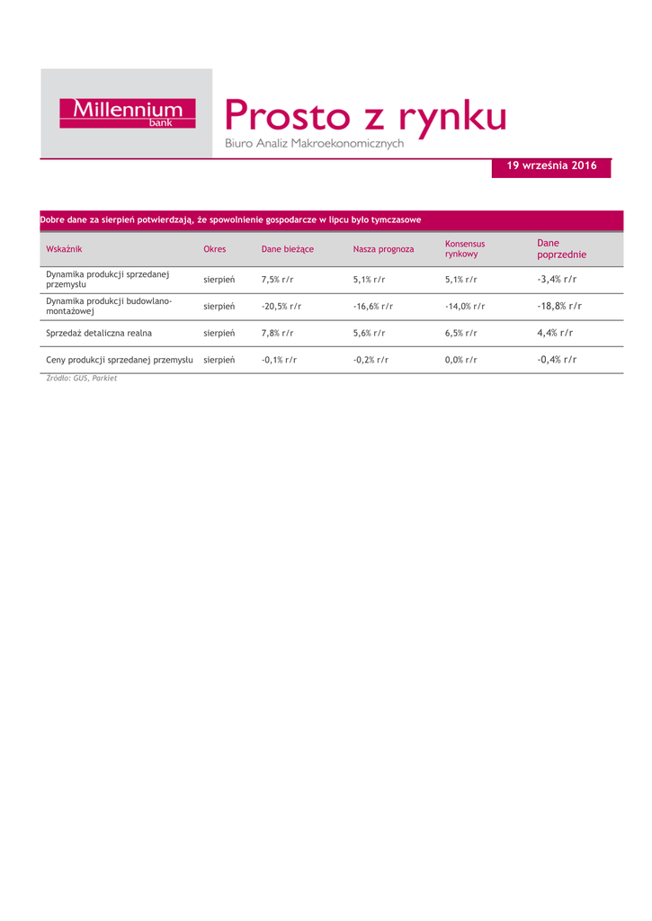 19 września 2016 Dobre dane za sierpień potwierdzają, że spowolnienie gospodarcze w lipcu było tymczasowe Wskaźnik Okres Dane bieżące Nasza prognoza Konsensus rynkowy Dane poprzednie Dynamika produkcji sprzedanej przemysłu sierpień 7,5% r/r 5,1% r/r 5,1% r/r -3,4% r/r Dynamika produkcji budowlanomontażowej sierpień -20,5% r/r -16,6% r/r -14,0% r/r -18,8% r/r Sprzedaż detaliczna realna sierpień 7,8% r/r 5,6% r/r 6,5% r/r 4,4% r/r Ceny produkcji sprzedanej przemysłu sierpień -0,1% r/r -0,2% r/r 0,0% r/r -0,4% r/r Źródło: GUS, Parkiet Nasz komentarz Dane za sierpień potwierdziły, ze spowolnienie obserwowane w gospodarce w lipcu było tymczasowe i prawdopodobnie wynikało z efektu kalendarzowego (mniej dni roboczych) oraz z przerw wakacyjnych w dużych zakładach. Produkcja sprzedana przemysłu wzrosła w sierpniu o 7,5% r/r po spadku o 3,4% r/r w lipcu i była lepsza od oczekiwań. Dane były wspierane przez efekt kalendarzowy, jednak po wyeliminowaniu wpływu czynników o charakterze sezonowym odnotowano wzrost produkcji o 5,1% r/r, wobec 1,6% w lipcu. Ożywienie miało szeroki charakter, a wzrost dotyczył 26 z 34 działów przemysłu. Najsilniejsze wzrosty odnotowano w produkcji wyrobów tekstylnych (o 31,0%), pozostałego sprzętu transportowego, pojazdów samochodowych, przyczep i naczep, maszyn i urządzeń, a także mebli, co sugeruje, ze ożywienie było wspierane przez solidny popyt zewnętrzny. Wskazywała na to poprawa w zakresie nowych zamówień eksportowych oraz odczyt indeksu PMI. Popyt krajowy też wygląda dobrze, na co wskazują dane o sprzedaży detalicznej. W ujęciu realnym wzrosła ona o 7,8% r/r po rozczarowującym wzroście o 4,4% r/r w lipcu. W ujęciu nominalnym odnotowano wzrost o 5,6% r/r. W miesięcznych danych o sprzedaży po raz pierwszy widać oznaki ożywienia popytu po uruchomieniu programu Rodzina 500+, w poprzednich miesiącach środki te były prawdopodobnie wydawane na usługi i sprzedaż w małych sklepach wykluczonych z miesięcznej dynamiki sprzedaży detalicznej. W sierpniu wzrost sprzedaży odnotowano we wszystkich kategoriach przedsiębiorstw handlowych. Najsilniej, o 18,8%, wzrosła sprzedaż w kategorii tekstylia, odzież i obuwie, o 17,6% r/r zwiększyła się sprzedaż samochodów, o 15,9% rosła sprzedaż kosmetyków i farmaceutyków, natomiast dynamika sprzedaży w podmiotach prowadzących pozostałą sprzedaż detaliczną w niewyspecjalizowanych sklepach wyniosła 8,8% r/r. Kategoria ta obejmuje m.in. dyskonty, a przyspieszenie mogło wynikać ze wzrostem zakupów przed rozpoczęciem roku szkolnego. Dane potwierdzają, że bardzo dobra sytuacja gospodarstw domowych, związana z niskim bezrobociem, rosnącymi płacami i świadczeniami socjalnymi jest wsparciem dla konsumpcji. Bardzo słabo wyglądają dane o produkcji budowlano-montażowej, która spadła o 20,5% r/r, mocniej od oczekiwań. Był to najgorszy odczyt w dziewięciomiesięcznym okresie nieprzerwanych spadków, co potwierdza zapaść w sektorze i sugeruje bardzo niską aktywność inwestycyjną. Inwestycje zostały zatrzymane po zakończeniu starej perspektywy finansowej UE w oczekiwaniu na nową, dane nie pokazują oczekiwanego odbicia w tej materii. Ceny produkcji sprzedanej przemysłu spadły w sierpniu o 0,1% r/r i jesteśmy coraz bliżej końca deflacji po stronie producenta, która utrzymuje się już od 46 miesięcy. Dane potwierdzają obraz gospodarki znany z pierwszego półrocza. Głównym motorem wzrostu pozostaje konsumpcja, wspierana przez rynek pracy i programy socjalne. Polską gospodarkę wspiera solidny popyt zagraniczny. Pogłębia się natomiast zapaść inwestycji. Dane są więc neutralne z punktu widzenia RPP.