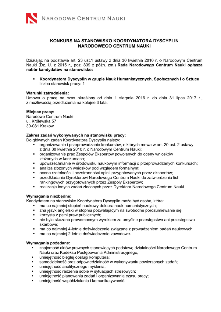 KONKURS NA STANOWISKO KOORDYNATORA DYSCYPLIN NARODOWEGO CENTRUM NAUKI Działając na podstawie art. 23 ust.1 ustawy z dnia 30 kwietnia 2010 r. o Narodowym Centrum Nauki (Dz. U. z 2015 r., poz. 839 z późn. zm.) Rada Narodowego Centrum Nauki ogłasza nabór kandydatów na stanowisko: Koordynatora Dyscyplin w grupie Nauk Humanistycznych, Społecznych i o Sztuce liczba stanowisk pracy: 1 Warunki zatrudnienia: Umowa o pracę na czas określony od dnia 1 sierpnia 2016 r. do dnia 31 lipca 2017 r., z możliwością przedłużenia na kolejne 3 lata. Miejsce pracy: Narodowe Centrum Nauki ul. Królewska 57 30-081 Kraków Zakres zadań wykonywanych na stanowisku pracy: Do głównych zadań Koordynatora Dyscyplin należy: organizowanie i przeprowadzanie konkursów, o których mowa w art. 20 ust. 2 ustawy z dnia 30 kwietnia 2010 r. o Narodowym Centrum Nauki; organizowanie prac Zespołów Ekspertów powołanych do oceny wniosków złożonych w konkursach; upowszechnianie w środowisku naukowym informacji o przeprowadzanych konkursach; analiza złożonych wniosków pod względem formalnym; ocena rzetelności i bezstronności opinii przygotowanych przez ekspertów; przedkładanie Dyrektorowi Narodowego Centrum Nauki do zatwierdzenia list rankingowych przygotowanych przez Zespoły Ekspertów; realizacja innych zadań zleconych przez Dyrektora Narodowego Centrum Nauki. Wymagania niezbędne: Kandydatem na stanowisko Koordynatora Dyscyplin może być osoba, która: ma co najmniej stopień naukowy doktora nauk humanistycznych; zna język angielski w stopniu pozwalającym na swobodne porozumiewanie się; korzysta z pełni praw publicznych; nie była skazana prawomocnym wyrokiem za umyślne przestępstwo ani przestępstwo skarbowe; ma co najmniej 4-letnie doświadczenie związane z prowadzeniem badań naukowych; ma co najmniej 2-letnie doświadczenie zawodowe. Wymagania pożądane: znajomość aktów prawnych stanowiących podstawę działalności Narodowego Centrum Nauki oraz Kodeksu Postępowania Administracyjnego; umiejętność biegłej obsługi komputera; samodzielność oraz odpowiedzialność w wykonywaniu powierzonych zadań; umiejętność analitycznego myślenia; umiejętność radzenia sobie w sytuacjach stresowych; umiejętność planowania zadań i organizowania czasu pracy; umiejętność współdziałania i komunikatywność. Zgłoszenie kandydata na stanowisko Koordynatora Dyscyplin powinno zawierać: CV; list motywacyjny; wykaz osiągnięć naukowych. Wykaz dokumentów, które należy dołączyć do zgłoszenia: kopie dokumentów potwierdzających wykształcenie, w tym posiadanie stopnia naukowego lub tytułu naukowego; kopie dokumentów potwierdzających posiadane kwalifikacje; kopie dokumentów potwierdzających przebieg pracy zawodowej; kopie dokumentów potwierdzających udział w projektach badawczych; oświadczenie o niekaralności za umyślne przestępstwo ani przestępstwo skarbowe; oświadczenie o korzystaniu z pełni praw publicznych; oświadczenie o wyrażeniu zgody na przetwarzanie danych osobowych w ramach konkursu zgodnie z ustawą z dnia 29 sierpnia 1997 roku o ochronie danych osobowych (t.j. Dz. U. z 2014 r., poz.1182); kopia dowodu osobistego lub innego dokumentu potwierdzającego tożsamość. Termin składania dokumentów: Zgłoszenia z dopiskiem „Koordynator Dyscyplin – Konkurs”, należy przesłać do 22 czerwca 2016 r. (decyduje data stempla pocztowego, a w przypadku wysłania za pośrednictwem kuriera, data wpływu do NCN), na adres: Narodowe Centrum Nauki ul. Królewska 57 30-081 Kraków lub złożyć osobiście w siedzibie Narodowego Centrum Nauki. Informacje o konkursie, w tym: regulamin konkursu na stanowisko Koordynatora Dyscyplin; akty prawne dotyczące działalności Narodowego Centrum Nauki; materiały informacyjne związane z funkcjonowaniem Narodowego Centrum Nauki dostępne są na stronie internetowej www.ncn.gov.pl/BIP Inne informacje: Zgłoszenia niekompletne, niespełniające wymogów formalnych oraz przekazane po terminie nie będą rozpatrywane. Zastrzegamy sobie prawo kontaktu tylko z wybranymi kandydatami. Dokumenty aplikacyjne nie będą zwracane i po zakończeniu postępowania konkursowego ulegną zniszczeniu. Termin rozmów kwalifikacyjnych z kandydatami zakwalifikowanymi do drugiego etapu konkursu został wyznaczony na dzień 6 lipca 2016 r. Wyniki konkursu zostaną opublikowane na stronie internetowej Narodowego Centrum Nauki www.ncn.gov.pl/BIP do 31 lipca 2016 r. oraz umieszczone w miejscu powszechnie dostępnym w siedzibie Centrum. Dodatkowe informacje na temat konkursu można uzyskać pod nr tel.: (12) 341-91-91.