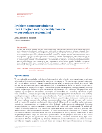 Barometr Regionalny Tom 13 nr 4 Problem samozatrudnienia — rola i miejsce mikroprzedsiębiorstw w gospodarce regionalnej Anna Jasińska-Biliczak Politechnika Opolska Streszczenie Artykuł ma na celu podjęcie kwestii samozatrudnienia jako specyficznej formy działalności gospodarczej wykonywanej wyłącznie osobiście przez właściciela przedsiębiorstwa oraz jej uwarunkowań. Omówione zostaną kwestie tej formy działalności gospodarczej jako źródła innowacji, motoru zmian ekonomicznych i społecznych oraz miejsca zatrudnienia. Wskazane zostanie miejsce samozatrudnienia w sektorze małych i średnich przedsiębiorstw oraz gospodarce regionu. Do osiągnięcia tego celu posłużono się metodą przeglądu literatury z zakresu gospodarki lokalnej oraz małej i średniej przedsiębiorczości jak i podejmującej problem samozatrudnienia. Dokonano także przeglądu obowiązującego prawodawstwa, dokumentów organów Unii Europejskiej jak i dokumentów świadczących o wadze problemu, takich jak interpelacje poselskie (desk research). W celu zobrazowania podjętego problemu wykonana została analiza danych dotyczących samozatrudnienia w województwie opolskim (data analisys). Słowa kluczowe: samozatrudnienie, własna działalność gospodarcza, małe i średnie przedsiębiorstwa (MŚP), gospodarka regionalna Wprowadzenie W obecnej dobie gospodarka globalna definiowana jest jako jednolity rynek powiązany wzajemnymi relacjami i stosunkami podmiotów na nim występujących. Nie można przy tym nie doceniać roli i wagi sektora małych i średnich przedsiębiorstw dla kreowania gospodarek krajowych. Sektor ten nie zostanie zastąpiony sektorem dużych przedsiębiorstw, które to przede wszystkim są aktorami rynków międzynarodowych. Nowoczesne gospodarki wspierają i kreują postawy przedsiębiorcze przynoszące efekty nie tylko dla rozwoju regionalnego ale i lokalnego. Inicjatywy te przyczyniają się nie tylko do zwiększania dobrobytu społeczeństwa ale i stanowią odpowiedź na problem bezrobocia. Jednym z najbardziej charakterystycznych przejawów kreatywności oraz postawy przedsiębiorczej jest podejmowanie samozatrudnienia. Państwa członkowskie Unii Europejskiej podejmowały wysiłki, aby opracować jednolitą definicję umożliwiającą dokonanie rozróżnienia między pracownikami najemnymi a osobami samozatrudnionymi na podstawie szeregu z góry ustalonych kryteriów. Ze względu na złożoność różnorodnych faktycznych przypadków państwa te mają w praktyce często problemy z wyłonieniem takiej definicji i podjęciem co do niej decyzji. Status samozatrudnienia jest różnie rozumiany w poszczególnych państwach członkowskich. W niektórych krajach (Holandia) pojęciem tym określa się osobę pracującą na własny rachunek, głównie jako podwykonawca dla innego przedsiębiorstwa. W innych państwach członkowskich (Francja) pojęcie samozatrudnienia zarezerwowane jest dla przedsiębiorców, którzy nie są zatrudnieni w swoim przedsiębiorstwie; mogą oni zatrudniać pracowników lub nie (Singer i inni 2015, s. 39). Samozatrudnienie nie jest tu ograniczone do podwykonawstwa, ponieważ klientami mogą być także konsumenci. Kwestia różniących się definicji zatrudnienia i samozatrudnienia ma duże znaczenie nie tylko ze względu na prawo pracy, ale także na przepisy dotyczące ubezpieczenia społecznego © 2015 by Wyższa Szkoła Zarządzania i Administracji w Zamościu All Rights Reserved 76 Anna Jasińska-Biliczak i podatków. 1 Z uwagi na podejmowanie kwestii samozatrudnienia zarówno przez instytucje na poziomie krajowym jak i międzynarodowym stwierdzić można, że jest to problem istotny z punktu widzenia gospodarczego, ale także ważny jako zjawisko społeczne. 1. Przedsiębiorca samozatrudniony — szczególna forma prowadzenia działalności gospodarczej Samozatrudnienie związane jest z takim rodzajem działalności, której przedstawiciele ponoszą odpowiedzialność za decyzje operacyjne. Zjawisko to w obszarze OECD ma tendencję wzrastającą głównie z powodu rosnącego outsourcingu oraz spłaszczania struktur kierowniczych i wielkości dużych przedsiębiorstw (Singer i inni 2015, s. 27). Przyjąć należy, że w najszerszym znaczeniu zjawisko samozatrudnienia obejmuje praktykę współpracy między podmiotami gospodarczymi, w ramach której jednym z partnerów jest osoba fizyczna prowadząca firmę jednoosobową i osobiście wykonująca zadania (usługi) wyłącznie na rzecz drugiego partnera zawartej umowy o współpracy. Obecnie nie ma jednoznacznej, obowiązującej na terytorium Unii Europejskiej definicji, która umożliwiałaby wyraźne rozróżnienie między osobami samozatrudnionymi działającymi w dobrej wierze i faktycznie pracującymi na własny rachunek a osobami samozatrudnionymi fikcyjnie (w sposób wymuszony). Każdy właściwy organ i każda instytucja stosuje własne ramy prawne lub regulacyjne, które mogą się różnić w zależności od ich zakresu kompetencji oraz obszaru polityki, w jakim działają. 2 Zgodnie z polską ustawą o podatku dochodowym od osób fizycznych samozatrudnienie polega na tym, że osoba prowadząca własną, jednoosobową firmę spełnia jednocześnie wszystkie poniższe warunki: •odpowiada wobec osób trzecich za rezultat pracy, czyli nie tylko wobec zleceniodawcy, ale także tego, kto korzysta z efektu jej pracy; •samodzielnie wykonuje zlecone czynności, a zleceniodawca nie nadzoruje bezpośrednio tego procesu; •nie jest ograniczona ani miejscem ani czasem wykonywania czynności, czyli zleceniodawca nie może zobowiązać zleceniobiorcy/wykonawcy do pracy w jego firmie; •zlecone prace wiążą się z ryzykiem finansowym wykonawcy. Przyjąć należy, że w najszerszym znaczeniu zjawisko to obejmuje praktykę współpracy między podmiotami gospodarczymi, w ramach której jednym z partnerów jest osoba fizyczna prowadząca firmę jednoosobową i osobiście wykonująca zadania (usłu