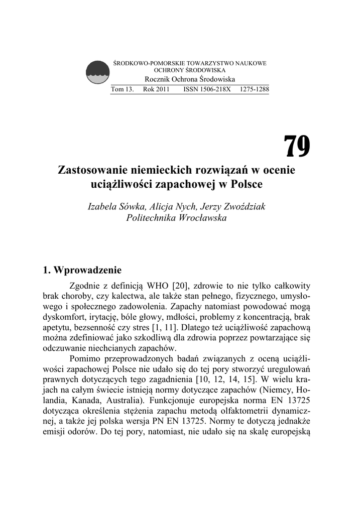 ŚRODKOWO-POMORSKIE TOWARZYSTWO NAUKOWE OCHRONY ŚRODOWISKA Rocznik Ochrona Środowiska Tom 13. Rok 2011 ISSN 1506-218X 1275-1288 79 Zastosowanie niemieckich rozwiązań w ocenie uciążliwości zapachowej w Polsce Izabela Sówka, Alicja Nych, Jerzy Zwoździak Politechnika Wrocławska 1. Wprowadzenie Zgodnie z definicją WHO [20], zdrowie to nie tylko całkowity brak choroby, czy kalectwa, ale także stan pełnego, fizycznego, umysłowego i społecznego zadowolenia. Zapachy natomiast powodować mogą dyskomfort, irytację, bóle głowy, mdłości, problemy z koncentracją, brak apetytu, bezsenność czy stres [1, 11]. Dlatego też uciążliwość zapachową można zdefiniować jako szkodliwą dla zdrowia poprzez powtarzające się odczuwanie niechcianych zapachów. Pomimo przeprowadzonych badań związanych z oceną uciążliwości zapachowej Polsce nie udało się do tej pory stworzyć uregulowań prawnych dotyczących tego zagadnienia [10, 12, 14, 15]. W wielu krajach na całym świecie istnieją normy dotyczące zapachów (Niemcy, Holandia, Kanada, Australia). Funkcjonuje europejska norma EN 13725 dotycząca określenia stężenia zapachu metodą olfaktometrii dynamicznej, a także jej polska wersja PN EN 13725. Normy te dotyczą jednakże emisji odorów. Do tej pory, natomiast, nie udało się na skalę europejską 1276 Izabela Sówka, Alicja Nych, Jerzy Zwoździak wprowadzić podobnych standardów odnośnie badan imisji zapachu i jakości powietrza atmosferycznego. 2. Niemieckie podstawy prawne przy ocenie uciążliwości zapachowej Podstawą prawną w odniesieniu do jakości powietrza jest w Niemczech Ustawa o Ochronie Powietrza Atmosferycznego (niemiecki BImSchG – Bundes-Immissionsschutzgesetz). Zgodnie z nim (§ 3 (1)) pogorszenie stanu środowiska spowodowane jest zanieczyszczeniami, które, ze względu na rodzaj, wielkość i czas trwania, mogą powodować zagrożenie, poważne szkody lub uciążliwość dla społeczeństwa. Tylko w ramach tej ustawy można rozpatrywać uciążliwość zapachową jako zanieczyszczenie środowiska. Każde uzyskanie pozwolenia na prowadzenie działalności lub kontrola funkcjonujących już zakładów ma na celu ocenę, w jakim stopniu ewentualna uciążliwość może być rozpatrywana jako poważna. Opracowano więc wytyczne „Odory w powietrzu atmosferycznym” [8]. Przedstawiony w nich został plan działania, od metod pomiarów imisji zapachu do wymagań dotyczących jakości powietrza. W wytycznych przedstawione zostały między innymi wartości dopuszczalne rozpoznawanego zapachu na terenach wokół zakładów. Wartości dopuszczalne wyznaczone zostały na podstawie przeprowadzonych porównawczych badań pomiarów wpływu oraz częstotliwości występowania zapachów [19], a także stopnia uciążliwości zapachowej ocenianego na podstawie badań ankietowych zgodnie z wytycznymi VDI 3883 [18]. Zgodnie z GOAA [8], zapach można scharakteryzować poprzez jego rodzaj, poziom odczuwania – powyżej progu rozpoznania, oraz za pomocą tzw. godzin odorowych. 3. Metodyka oceny uciążliwości zapachowej w Niemczech W związku z brakiem ujednoliconej terminologii w dziedzinie zapachów, wyjaśnienia wymagają pojęcia: ‘imisja zapachu’ oraz ‘badania ankietowe’. Pierwsze z nich pozwalają na ocenę częstotliwości występowania odorów, nazywane są także ‘badaniami terenowymi’. Natomiast mianem ‘badań ankietowych’ (ankiet) określana jest ocena uciążliwości zapachowej. Termin ‘pomiary terenowe’ odnosi się do całości Zastosowanie niemieckich rozwiązań w ocenie uciążliwości… 1277 oceny uciążliwości zapachowej z zastosowaniem zarówno pomiarów imisji, jak i ankiet. 3.1. Pomiary imisji zapachu Ocenie podlegają obszary, na których zapach można zidentyfikować jako charakterystyczny dla danego zakładu, tj. jeśli można rozróżnić go od zapachu z transportu drogowego, palenisk domowych, roślinności czy nawozów. Zgodnie z prawem, imisja zapachu uznawana jest jako uciążliwość zapachową, jeśli przekracza ona wartość dopuszczalną EXPlim. Wartości dopuszczalne, odpowiadające godzinom odorowym zestawiono w tabeli 1. Tabela 1. Wartości dopuszczalne imisji zapachu (EXPlim) dla różnych typów obszarów [8] Table 1. Exposure limits (EXPlim) for different area of utilization [8] Obszary mieszkalne i mieszane Obszary przemysłowe Obszary wiejskie 0,10 0,15 0,15 Pomiary imisji zapachu przeprowadzane są na ‘obszarze pomiarowym’, składającym się z ‘kwadratów pomiarowych’, położonych wewnątrz okręgu o środku obliczonym na podstawie emisji zapachu ze wszystkich źródeł. Promień powinien odpowiadać 30 wysokościom emitora i być nie mniejszy niż 600 m. Długości boków kwadratów powinny wynosić 250 m. Ponadto, wszystkie źródła powinny mieć środek w centralnym punkcie jednego z kwadratów. Pomiar prowadzi się na wysokości ok. 1,5 do 2 m nad poziomem gruntu, w odległości nie mniejszej niż 1,5 m od zabudowań. Okres pomiarów musi być reprezentatywny dla całego roku. Wyniki powinny być reprezentatywne także dla całej doby. Dlatego pomiary odbywają się równomiernie przez 24 godziny, co oznacza, że wykonuje się je także w nocy. Ważne jest, aby zagwarantować położenie punktów pomiarowych możliwie jak najbliżej ustalonych węzłów w siatce, a w przypadku jakichkolwiek przeszkód, w najbliższym możliwym punkcie. W każdym punkcie pomiarowym należy dokonać 13 lub 26 pomiarów, w zależności od możliwości zapewnienia wymaganej wiarygodności pod względem statystycznym, a rozkład pomiarów pod- 1278 Izabela Sówka, Alicja Nych, Jerzy Zwoździak czas całego okresu badań musi być równomierny. Sumą wyników ze wszystkich rogów jednego kwadratu pomiarowego są godziny odorowe. W celu zapewnienia wymaganej jakości wyników, co najmniej 10 osobowa grupa, przeprowadzająca pomiary, musi być odpowiednio wyszkolona i wrażliwa na zapachy, ponieważ pod uwa