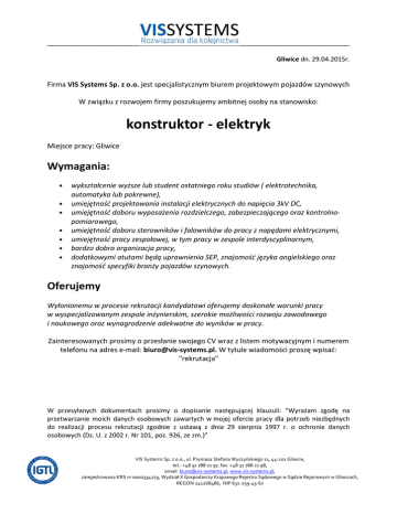 _________________________ ______________________________ Gliwice dn. 29.04.2015r. Firma VIS Systems Sp. z o.o. jest specjalistycznym biurem projektowym pojazdów szynowych W związku z rozwojem firmy poszukujemy ambitnej osoby na stanowisko: konstruktor - elektryk Miejsce pracy: Gliwice Wymagania: • • • • • • • wykształcenie wyższe lub student ostatniego roku studiów ( elektrotechnika, automatyka lub pokrewne), umiejętność projektowania instalacji elektrycznych do napięcia 3kV DC, umiejętność doboru wyposażenia rozdzielczego, zabezpieczającego oraz kontrolnopomiarowego, umiejętność doboru sterowników i falowników do pracy z napędami elektrycznymi, umiejętność pracy zespołowej, w tym pracy w zespole interdyscyplinarnym, bardzo dobra organizacja pracy, dodatkowymi atutami będą uprawnienia SEP, znajomość języka angielskiego oraz znajomość specyfiki branży pojazdów szynowych. Oferujemy Wyłonionemu w procesie rekrutacji kandydatowi oferujemy doskonałe warunki pracy w wyspecjalizowanym zespole inżynierskim, szerokie możliwości rozwoju zawodowego i naukowego oraz wynagrodzenie adekwatne do wyników w pracy. Zainteresowanych prosimy o przesłanie swojego CV wraz z listem motywacyjnym i numerem telefonu na adres e-mail: [email protected]. W tytule wiadomości proszę wpisać: "rekrutacja" W przesyłanych dokumentach prosimy o dopisanie następującej klauzuli: "Wyrażam zgodę na przetwarzanie moich danych osobowych zawartych w mojej ofercie pracy dla potrzeb niezbędnych do realizacji procesu rekrutacji zgodnie z ustawą z dnia 29 sierpnia 1997 r. o ochronie danych osobowych (Dz. U. z 2002 r. Nr 101, poz. 926, ze zm.)" VIS Systems Sp. z o.o., ul. Prymasa Stefana Wyszyńskiego 11, 44-101 Gliwice, tel.: +48 32 788 21 97, fax: +48 32 788 21 98, email: [email protected], www.vis-systems.pl, zarejestrowana KRS nr 0000334279, Wydział X Gospodarczy Krajowego Rejestru Sądowego w Sądzie Rejonowym w Gliwicach, REGON 241268486, NIP 631-259-45-67