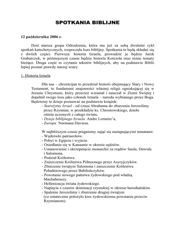SPOTKANIA BIBLIJNE 12 października 2006 r. Dziś starsza grupa Odrodzenia, która ma już za sobą dwuletni cykl spotkań katechetycznych, rozpoczęła kurs biblijny. Spotkania te będą składać się z dwóch części. Pierwsza: historia Izraela, prowadzić je będzie Jurek Grabarczyk, w późniejszym czasie będzie historia Kościoła oraz różne tematy bieżące. Druga część to czytanie tekstów biblijnych, aby na podstawie Biblii lepiej poznać prawdy naszej wiary. 1. Historia Izraela Dla nas – chrześcijan to przedział historii obejmujący Stary i Nowy Testament, to fundament znajomości własnej religii ogniskującej się w Jezusie Chrystusie, który przecież wzrastał i nauczał w Ziemi Świętej i dopełnił swego losu jako członek Izraela – narodu wybranego przez Boga. Będziemy te dzieje poznawać na podstawie książek: - Starożytny Izrael - od czasu Abrahama do zburzenia Jerozolimy przez Rzymian, w przekładzie ks. Chrostowskiego, dzieło ośmiu uczonych z całego świata, - Dzieje biblijnego Izraela Andre Lemaire’a, - Europa Normana Daviesa. W najbliższym czasie pragniemy zająć się następującymi tematami: - Wędrówki patriarchów. - Pobyt w Egipcie i wyjście. - Osiedlanie się w Kanaanie w okresie sędziów. - Ustanowienie i okrzepnięcie monarchii za rządów Saula, Dawida i Salomona. - Podział Królestwa. - Zniszczenie Królestwa Północnego przez Asyryjczyków. - Zburzenie świątyni Salomona i zniszczenie Królestwa Południowego przez Babilończyków. - Powstanie nowego państwa żydowskiego pod władzą Machabeuszy. - Hellenizacja świata żydowskiego. - Napięcia z czasów dominacji rzymskiej w okresie herodiańskim. - Spalenie Jerozolimy i zburzenie drugiej świątyni (co ostatecznie położyło kres żydowskiemu powstaniu przeciw Rzymianom). Dziś mówiliśmy o początkach Izraela, o kształtowaniu się społeczeństwa, o pierwszych patriarchach: Abrahamie, Izaaku, Jakubie (Izraelu) i Józefie. Witaj Abrahamie – daleka droga za Tobą. Daleka też droga przed nami, którzy chcą poznać dzieje Twojego narodu. Witaj Józefie – pierwszy synu Izraela, który właśnie wybierasz się do Egiptu. Idziemy z Tobą! 2. Czytanie tekstów biblijnych – pragnienie Boga - Pragnienie Boga jest w nas wpisane (Dz 17, 26-28; Rdz 1, 27) - Boga można poznać ze stworzenia (Rz 1, 19-20; Mdr 13, 1-9; Dz 14, 15-17) - Ale pragnienie to można też zagłuszyć (Rdz 3, 8-10; Jon 1, 3; Mt 13, 22) - Na koniec czytaliśmy psalmy (42, 2-12; 63, 2-9; 73, 23-28, 105, 3; 137, 1-6), które wyrażały wdzięczność i radość z szukania i obcowania z Panem Bogiem. Lekturą podstawową w spotkaniach biblijnych - oprócz Pisma świętego - jest Słownik teologii biblijnej pod redakcją Xaviera Leon-Dufoura. 19 października 2006 r. 1. Historia Izraela – pobyt w Egipcie i wyjście z niego - Dzieje kariery Józefa w Egipcie. - Pobyt w Egipcie i wyjście. - Mojżesz, płonący krzew, spotkanie z Bogiem, rozczarowania, upadki, Manna i przepiórki, góra Synaj i Przymierze, Dziesięcioro przykazań… Tak daleko dzisiaj zaszliśmy. Na następnym spotkaniu pójdziemy dalej z Mojżeszem do Kadesz-Barnea, gdzie przebywał przez trzydzieści osiem lat, aby w końcu dojść do skraju Kanaanu i umrzeć na górze Nebo, skąd rozciągał się widok na Ziemię Obiecaną. Dalej pójdziemy już nie z Mojżeszem lecz z Jozuem – zdobywać Kanaan. Witaj, Ziemio Obiecana. 2. Czytanie tekstów biblijnych – Objawienie; Stary Testament. W jaki sposób dokonuje się objawienie? - Tak zwane archaiczne techniki objawienia (Kpł 19, 26; Pwt 18, 10; 1 Sm 15, 23; 1 Sm 28, 3) - Urim i Tummim (Lb 27, 12-23; Pwt 33, 1-8) - Znaczenie snów (Rdz 28, 10-15; Rdz 37, 5-10) - Odróżniać prawdziwych proroków od fałszywych wróżbitów (Pwt 13, 1-4; Pwt 18, 20-22) - Tych ostatnich należy stanowczo zwalczać (Jr 23, 25-32) - Symboliczne wizje (Am 7, 1-9; Jr 1, 11-13) - Potrzeba wyjaśniającego słowa (Jr 1, 14; Dn 7, 13-18) - Czasami prorocy nie wiedzą, jak słowo do nich dociera ( Jr 1, 4-12) - Znaczenie refleksji mądrościowych (Prz 2, 1-5) - Mądrość jest również darem Bożym (Prz 2, 6) - Cały świat głosi mądrość Bożą (Ps 19, 2-15) - Mądrość, podobnie jak Duch Święty, udziela światła do poznania nadprzyrodzonego (Mdr 7, 25-30; Mdr 8, 4-8) 26 października 2006 r. 1. Historia Izraela – osiedlenie się w Kanaanie i okres sędziów - Jozue podbija Kanaan. Podbijają: Jerycho, Aj, Sychem, Gibeon, Chasor. Zwycięstwa idą za Izraelem i z ich bohaterami: Gedeonem i Samsonem. - Po wędrówce i walce – osiedlenie się w ziemi Kanaan. - Sędziowie – reprezentantami i przywódcami narodu. - Prorok Samuel przepowiada króla dla Izraela. 2. Spotkanie towarzyskie. 9 listopada 2006 r. 1. Historia Izraela – Saul i początki monarchii (1030-1009 r. p.Chr.) - Saul – pierwszy król jednoczący plemiona w walce Madianitami, Ammonitami i Moabitami. Staje do nierównej walki z Filistynami. - Dawid – giermek u Saula. Walczy u Saula z Filistynami i zabija Goliata. 2. Czytanie tekstów biblijnych – Objawienie. Stary Testament. Przedmiot Objawienia - Boga można poznać ze stworzenia (Prz 8, 22-31) - Jest naszym stwórcą (Rdz 1, 1; 2, 7-8) - Objawia się w historii jako zazdrosny, karzący, prowadzący walki, ale też pocieszający (Iz 40, 1-3; Rdz 16, 6-10; 21, 14-19; Wj 3, 6; 33, 9-11; 33,18-20; Iz 6,1-4) - Plany, jakie Bóg ma względem człowieka, a więc pouczenia dotyczące naszego postępowania (Wj 2,1-9; Pwt 29, 28) - Instytucje społeczne, polityczne i kultyczne (Lb 11, 16-17; 1 Sm 9, 15-19; Wj 25, 2-11) - Przyszłość pokolenia Dawidowego (2 Sm 7, 4-14), chwały Jerozolimy i świątyni (Iz 2, 1-4; 60, 1-5) oraz roli Sługi Jahwe (Iz 52, 13-53. 12). 16 listopada 2006 r. 1. Historia Izraela – Dawid i zjednoczone królestwo - Dawid: - Żarliwy wyznawca i krzewiciel kultu Jahwe, twórca wielkiego Izraela, zjednoczonego i zwycięskiego państwa, - złoty wiek Izraela, - pokonu
