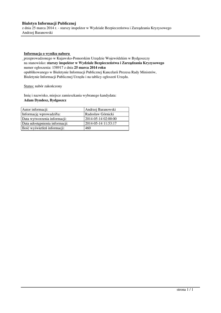 Biuletyn Informacji Publicznej z dnia 25 marca 2014 r. - starszy inspektor w Wydziale Bezpieczeństwa i Zarządzania Kryzysowego Andrzej Baranowski Informacja o wyniku naboru przeprowadzonego w Kujawsko-Pomorskim Urzędzie Wojewódzkim w Bydgoszczy na stanowisko: starszy inspektor w Wydziale Bezpieczeństwa i Zarządzania Kryzysowego numer ogłoszenia: 158917 z dnia 25 marca 2014 roku opublikowanego w Biuletynie Informacji Publicznej Kancelarii Prezesa Rady Ministrów, Biuletynie Informacji Publicznej Urzędu i na tablicy ogłoszeń Urzędu. Status: nabór zakończony Imię i nazwisko, miejsce zamieszkania wybranego kandydata: Adam Dyndesz, Bydgoszcz Autor informacji: Informację wprowadził\a: Data wytworzenia informacji: Data udostępnienia informacji: Ilość wyświetleń informacji: Andrzej Baranowski Radosław Górnicki 2014-05-14 02:00:00 2014-05-14 11:53:17 460 strona 1 / 1