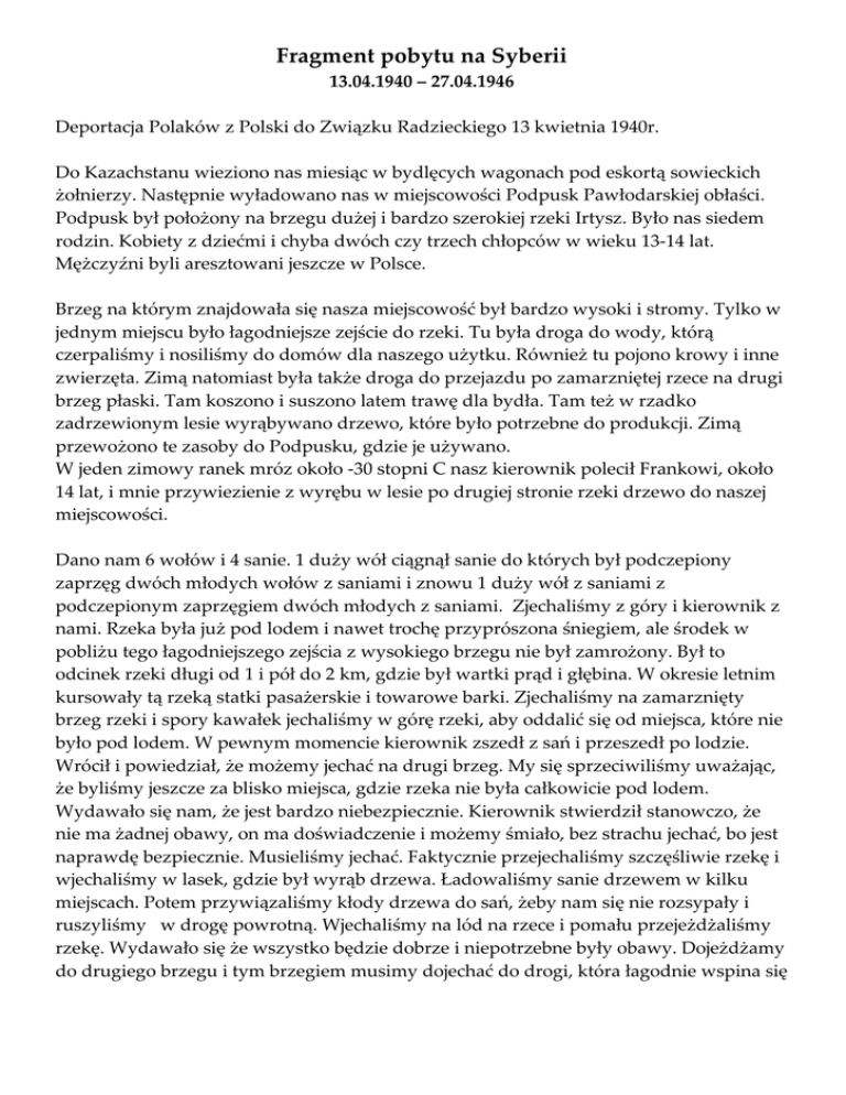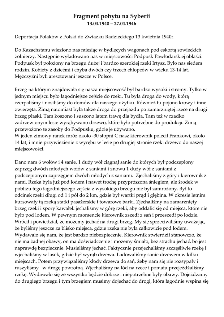 Fragment pobytu na Syberii 13.04.1940 – 27.04.1946 Deportacja Polaków z Polski do Związku Radzieckiego 13 kwietnia 1940r. Do Kazachstanu wieziono nas miesiąc w bydlęcych wagonach pod eskortą sowieckich żołnierzy. Następnie wyładowano nas w miejscowości Podpusk Pawłodarskiej obłaści. Podpusk był położony na brzegu dużej i bardzo szerokiej rzeki Irtysz. Było nas siedem rodzin. Kobiety z dziećmi i chyba dwóch czy trzech chłopców w wieku 13-14 lat. Mężczyźni byli aresztowani jeszcze w Polsce. Brzeg na którym znajdowała się nasza miejscowość był bardzo wysoki i stromy. Tylko w jednym miejscu było łagodniejsze zejście do rzeki. Tu była droga do wody, którą czerpaliśmy i nosiliśmy do domów dla naszego użytku. Również tu pojono krowy i inne zwierzęta. Zimą natomiast była także droga do przejazdu po zamarzniętej rzece na drugi brzeg płaski. Tam koszono i suszono latem trawę dla bydła. Tam też w rzadko zadrzewionym lesie wyrąbywano drzewo, które było potrzebne do produkcji. Zimą przewożono te zasoby do Podpusku, gdzie je używano. W jeden zimowy ranek mróz około -30 stopni C nasz kierownik polecił Frankowi, około 14 lat, i mnie przywiezienie z wyrębu w lesie po drugiej stronie rzeki drzewo do naszej miejscowości. Dano nam 6 wołów i 4 sanie. 1 duży wół ciągnął sanie do których był podczepiony zaprzęg dwóch młodych wołów z saniami i znowu 1 duży wół z saniami z podczepionym zaprzęgiem dwóch młodych z saniami. Zjechaliśmy z góry i kierownik z nami. Rzeka była już pod lodem i nawet trochę przyprószona śniegiem, ale środek w pobliżu tego łagodniejszego zejścia z wysokiego brzegu nie był zamrożony. Był to odcinek rzeki długi od 1 i pół do 2 km, gdzie był wartki prąd i głębina. W okresie letnim kursowały tą rzeką statki pasażerskie i towarowe barki. Zjechaliśmy na zamarznięty brzeg rzeki i spory kawałek jechaliśmy w górę rzeki, aby oddalić się od miejsca, które nie było pod lodem. W pewnym momencie kierownik zszedł z sań i przeszedł po lodzie. Wrócił i powiedział, że możemy jechać na drugi brzeg. My się sprzeciwiliśmy uważając, że byliśmy jeszcze za blisko miejsca, gdzie rzeka nie była całkowicie pod lodem. Wydawało się nam, że jest bardzo niebezpiecznie. Kierownik stwierdził stanowczo, że nie ma żadnej obawy, on ma doświadczenie i możemy śmiało, bez strachu jechać, bo jest naprawdę bezpiecznie. Musieliśmy jechać. Faktycznie przejechaliśmy szczęśliwie rzekę i wjechaliśmy w lasek, gdzie był wyrąb drzewa. Ładowaliśmy sanie drzewem w kilku miejscach. Potem przywiązaliśmy kłody drzewa do sań, żeby nam się nie rozsypały i ruszyliśmy w drogę powrotną. Wjechaliśmy na lód na rzece i pomału przejeżdżaliśmy rzekę. Wydawało się że wszystko będzie dobrze i niepotrzebne były obawy. Dojeżdżamy do drugiego brzegu i tym brzegiem musimy dojechać do drogi, która łagodnie wspina się na wysoki brzeg. Lecz tu następuje krach. Lód zaczyna pękać i łamie się. Franek chwycił za wodze pierwszą parę młodych wołów próbując wykierować na brzeg, ależ gdzież tam. Sanie toną i ciągną wstecz. Franek nie traci panowania. Woła do mnie, bo byłam jeszcze kawałek w tyle przy drugim zaprzęgu. Szybko wyprzęgaj woły bo toniemy. Widzę, że jesteśmy w bardzo niebezpiecznej sytuacji, bo i do mnie już dosięga pękanie lodu. Szybko biegnę i wyprzęgam pierwszego dużego woła, bo kra na której stoi on i ja, przechyla się i wół już w wodzie, ale wyprzężony. Zdążyłam jeszcze w ostatnim momencie przeskoczyć z tej kry lodu na drugą, gdzie był drugi duży wół. Muszę szybko też uwolnić go z jarzma, bo kra już tonie, a wół w wodzie. W ostatniej sekundzie przeskoczyłam do młodych wołów bo i ta kra na której stoję zalewa woda. Skaczę do wody, która sięga mi powyżej kostek i udaje mi się, że uwalniam je z zaprzęgu, ale kra już tonie. Prędko muszę wyskoczyć na ląd. Z pomocą anioła stróża jestem na twardym gruncie. Biegnę teraz do Franka. Próbujemy teraz ratować tą parę, ale na próżno. Mokre kopyta zsuwają się z twardej ściany skalnej. I te woły musimy wyprzęgać, bo nie mamy siły, aby wyciągnąć je na brzeg. Wszystkie woły unosi silny prąd wody. Miejsce na rzece nie pokrytej lodem przesunęło się, aż poza nasze topielisko. Na nasze wołanie o pomoc zbiegli się już ludzie. Ktoś pobiegł po łodzie, by ratować woły, które płynęły z prądem rzeki. Sanie załadowane drzewem utonęły, żeby chociaż wyłowiono woły. Przybiegły również nasze matki i zabierają nas do domu, aby ogrzać i osuszyć, bo ubrania przemoczone, a nogi to lody. No i muszą nas nakarmić, bo cały dzień nic nie jedliśmy. Moja siostra miała funkcję opiekunki zwierząt w naszym miejscu pracy. Jak nam później opowiedziała, to pobiegła prędko do obory, gdzie nasłała dużo siana i pozamykała okienka. Kiedy przywieziono woły miały już tam ciepło. Najbardziej ucierpiał stary wół. Nie miał on siły oprzeć się wartkiemu prądowi rzecznemu i woda zniosła go na odległość jednego kilometra. Mężczyźni jednak go wyłowili i przywieźli na miejsce. Ponieważ był on bardzo długo w zimnej wodzie musiała go jakoś ogrzać. Nagrzała budynek tzw. łaźni, usłała sianem i tam ratownicy go przywieźli i położyli. Siostra silnie nacierała nogi i grzbiet sianem. Na drugi dzień gdy poszła zobaczyć wół stał na nogach. Zdawało się, że na tym skończyła się nasza niebezpieczna przygoda, ale nie. Wieczorem tego fatalnego dnia przyszedł do nas kierownik, żeby powiedzieć, że jeśli choć jeden wół zginie, nie będą sądzić jego tylko Franka i mnie. Zdziwiło nas to ogromnie. Nie byliśmy przecież winni, że spotkał nas taki wypadek w którym mogliśmy stracić życie, a przecież ratowaliśmy jak mogliśmy woły. Na szczęście wszystkie zostały uratowane. Pan Bóg czuwał