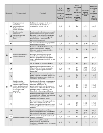 Kategoria A1 Wykorzystanie Przykłady Część przestrzeni strychowej nad jętkami, nad belkowaniem stropu poddasza. Poddasze nie nadające się do celów mieszkalnych, ale dostępne do wysokości w świetle 1,80 m. Pomieszczenia mieszkalne i przeznaczone do przebywania ludzi. Klasa Minimalna wytrzymał qk wytrzymał Ωk ości ość kN/m2 na Minimalna kN na rozciągani grubość rozciągani (obciążeni e podkładu (obciążeni e e przy [mm] e przy powierzch skupione) zginaniu zginaniu niowe) wg PN-EN [N/mm2] 13813 1,0 1,0 F4 ≥ 35 ≥ 4,0 Pomieszczania o dostatecznym podziale poprzecznym obciążeń, pomieszczenia i korytarze w budynkach mieszkalnych, sale pacjentów w szpitalach, pokoje hotelowe wraz z przynależnymi kuchniami i łazienkami. 1,5 - F4 ≥ 35 ≥ 4,0 A3 Jak A2, ale bez dostatecznego podziału poprzecznego obciążeń. 2,0 1,0 F4 ≥ 50 ≥ 4,0 B1 Korytarze w budynkach biurowych, powierzchnie biurowe, gabinety lekarskie, pomieszczenia oddziałów wraz z korytarzami, 2,0 2,0 F4 ≥ 50 ≥ 4,0 Korytarze w szpitalach, hotelach, domach starców, internatach, itp., kuchnie i pomieszczenia zabiegowe wraz z salami operacyjnymi bez sprzętu ciężkiego. 3,0 3,0 F4 ≥ 60 ≥ 4,0 B3 Jak B2, jednak ze sprzętem ciężkim. 5,0 4,0 F5 ≥ 55 ≥ 5,0 C1 Powierzchnie zastawione stołami, np. izby szkolne, kawiarnie, restauracje, jadalnie, czytelnie, pomieszczenia recepcyjne. 3,0 4,0 F4 F5 ≥ 65 ≥ 55 ≥ 4,0 ≥ 5,0 C2 Pomieszczenia z widownią (stałą), np. powierzchnie w kościołach, teatrach lub kinach, sale kongresowe, wykładowe, sale zebrań, poczekalnie. 4,0 4,0 F4 F5 ≥ 65 ≥ 55 ≥ 4,0 ≥ 5,0 Pomieszczenia dostępne bez ograniczeń dla odwiedzających, np. powierzchnie muzealne, wystawowe itp., powierzchnie wejściowe do budynków użyteczności publicznej i hoteli, stropy podpiwniczonych dziedzińców, po których nie odbywa się ruch kołowy. 5,0 4,0 F5 F4 ≥ 55 ≥ 65 ≥ 5,0 ≥ 4,0 C4 Powierzchnie przeznaczone na zajęcia sportowe i rozgrywki, np. sale taneczne, hale sportowe, pomieszczenia gimnastyczne i siłownie, sceny. 5,0 7,0 F7 2) ≥ 7,0 C5 Powierzchnie na większe zgromadzenia ludzi, np. w budynkach, jak sale koncertowe, tarasy i powierzchnie przy wejściach, jak również trybuny o stałej widowni. 5,0 4,0 F7 F5 ≥ 50 ≥ 55 ≥ 7,0 ≥ 5,0 D1 Powierzchnie handlowe do 50 m2 powierzchni podstawowej w budynkach mieszkalnych, biurowych i podobnych. 2,0 2,0 F4 F5 ≥ 50 ≥ 45 ≥ 4,0 ≥ 5,0 D D2 D3 Powierzchnie w sklepach detalicznych i Pomieszczenia handlowe domach towarowych. 5,0 4,0 F5 ≥ 55 ≥ 5,0 Powierzchnie jak D2, jednak o podwyższonych obciążeniach skupionych wskutek regałów wysokiego składowania. 6,0 7,0 F7 2) ≥ 7,0 A A2 B B2 C C3 Powierzchnie biurowe, robocze, korytarze. Pomieszczenia, sale konferencyjne i powierzchnie, mogące służyć spotkaniom osób (z wyjątkiem kategorii wymienionych w punktach A, B, D i E).