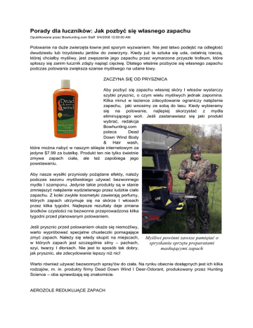 Porady dla łuczników: Jak pozbyć się własnego zapachu Opublikowane przez Bowhunting.com Staff 9/4/2008 12:00:00 AM Polowanie na duże zwierzęta łowne jest sporym wyzwaniem. Nie jest łatwo podejść na odległość dwudziestu lub trzydziestu jardów do zwierzyny. Kiedy już ta sztuka się uda, ostatnią rzeczą, której chciałby myśliwy, jest zwęszenie jego zapachu przez wymarzone przyszłe trofeum, które spłoszy się zanim łucznik zdąży napiąć cięciwę. Dlatego właśnie pozbycie się własnego zapachu podczas polowania zwiększa szanse myśliwego na udane łowy. ZACZYNA SIĘ OD PRYSZNICA Aby pozbyć się zapachu własnej skóry I włosów wystarczy szybki prysznic, o czym wielu myśliwych jednak zapomina. Kilka minut w łazience zdecydowanie ograniczy natężenie zapachu, jaki wnosimy ze sobą do lasu. Kiedy wybieramy się na polowanie, najlepiej skorzystać z mydła eliminującego woń. Jeśli zastanawiasz się jaki produkt wybrać, redakcja Bowhunting.com poleca Dead Down Wind Body & Hair wash, które można nabyć w naszym sklepie internetowym za jedyne $7.99 za butelkę. Produkt ten nie tylko świetnie zmywa zapach ciała, ale też zapobiega jego powstawaniu. Aby nasze wysiłki przyniosły pożądane efekty, należy podczas sezonu myśliwskiego używać bezwonnego mydła I szamponu. Jedynie takie produkty są w stanie zmniejszyć natężenie wydzielanego przez ludzkie ciało zapachu. Z kolei zwykłe kosmetyki zawierają perfumy, których zapach utrzymuje się na skórze I włosach przez kilka tygodni. Najlepsze rezultaty daje zmiana środków czystości na bezwonne przeprowadzona kilka tygodni przed planowanym polowaniem. Jeśli prysznic przed polowaniem okaże się niemożliwy, warto wypróbować specjalne chusteczki pomagające zmyć zapach. Należy się wtedy skupić na miejscach, w których zapach jest szczególnie silny – pachach, szyi, twarzy I dłoniach. Nie jest to sposób tak dobry, jak prysznic, ale zdecydowanie lepszy niż nic! Myśliwi powinni zawsze pamiętać o spryskaniu sprzętu preparatami maskującymi zapach Warto również używać bezwonnych spray'ów do ciała. Na rynku obecnie dostępnych jest ich kilka rodzajów, m. in. produkty firmy Dead Down Wind I Deer-Odorant, produkowany przez Hunting Science – oba sprawdzają się znakomicie. AEROZOLE REDUKUJĄCE ZAPACH Kolejnym ważnym elementem przy próbie ograniczenia zapachu są aerozole go eliminujące. Należy upewnić się, że wszystkie ubrania i sprzęt myśliwski są wolne od zapachu przed I po każdym polowaniu. Aby zachować je w takim stanie przyda się spray usuwający zapach, którym powinno się spryskać całą odzież przed wyruszeniem na łowy, co pozwoli uniknąć pozostawienia swojej woni, którą mogłoby wyczuć zwierzę. Nie należy też zapominać o spryskaniu wszystkich akcesoriów, jak również łuku, plecaka I właściwie wszystkiego, co będzie nam potrzebne podczas polowania. Preparat Evolve Field Spray od Dead Down Wind jest świetnym wyborem, jeśli zależy nam na wyeliminowaniu zapachu. Jest dostępny w różnych rozmiarach opakowań, w tym mieszczącej osiem uncji butelce, która doskonale zmieści się do plecaka. ODZIEŻ WĘGLOWA Jedną z najpopularniejszych metod oszukania nosa jelenia, lub jakiejkolwiek innej zwierzyny, jest założenie na siebie odzieży z węglową podszewką. Co prawda spora grupa łuczników skarży się na jej niezbyt wysoką skuteczność, ale może to wynikać z niewiedzy w zakresie jej użytkowania. Aby ubrania podszyte włóknami węglowymi były skuteczne, należy najpierw je aktywować w suszarce (40 minut po około 40 godzinach użytkowania). Kiedy węgiel jest już aktywowany, należy umieścić go w wolnym od zapachów pojemniku aż do momentu, kiedy myśliwy dotrze na polowanie. Częstym błędem jest pozostawienie aktywowanej odzieży w samochodzie lub w szafie, gdzie przyciąga on zewnętrzne zapachy, jak choćby zapach płaszcza wiszącego obok. Nie należy się też dziwić jeśli nasz strój czuć benzyną, kiedy zostawimy go w samochodzie podczas tankowania. Jeśli już wysupłamy pieniądze na taki ekwipunek, musimy zawsze zakładać wszystkie elementy stroju – należy pamiętać zwłaszcza o nakryciu głowy. Testy wykazują, że nawet jedna trzecia zapachu, wydzielanego przez ludzkie ciało pochodzi z ust i czubka głowy. Myśliwy bez nakrycia głowy jest łatwo wyczuwalny. Przechodząc do tematu zapachu z ust, są na rynku dwa świetne produkty, które rozwiązują ten problem I przynoszą ulgę zaniepokojonym łucznikom. Pierwszym środkiem jest Gum-O-Flage produkcji Hunting Science. Jest to guma do żucia zawierająca chlorofil I środki zapobiegające rozprzestrzenianiu się bakterii w jamie ustnej, co pomaga pozbyć się nieprzyjemnego zapachu. Biorąc pod uwagę, że kosztuje jedynie kilka dolarów za paczkę, warto zastanowić się nad zakupem. Zwłaszcza, kiedy pomyślimy, ile zapachu wydziela się przez usta I nos. Drugim z wymienionych produktów jest Smootchie – jednorazowa maseczka na usta oraz nos, zawierająca dużą ilość aktywowanego węgla, który pochłania zapach wydostający się z ust oraz nosa. Smootche stanowi ciekawą alternatywę dla tradycyjnych masek węglowych, które należy ponownie aktywować po kilkukrotnym użyciu. Kiedy już uporamy się z kapturem I rękawicami, warto upewnić się, że stopy są również wolne od zapachu. Wyniki badań wskazują, że jeleń jest w stanie zwęszyć człowieka na podstawie zapachu w śladach butów nawet kilka dni po tym, gdy myśliwy opuści miejsce polowania. Buty myśliwskie należy przechowywać w bezwonnym pojemniku, kiedy z nich nie korzystamy. Zdecydowanie odradzamy polowanie poprzedzone choćby spacerem do sklepu w tych samych butach. Kolejnym sposobem na pozbycie się zapachu, jest używanie skarpet, które go pochłaniają. Przed założeniem butów należy spryskać je środkiem usuwającym woń. To samo robimy ze stopami I skarpetami
