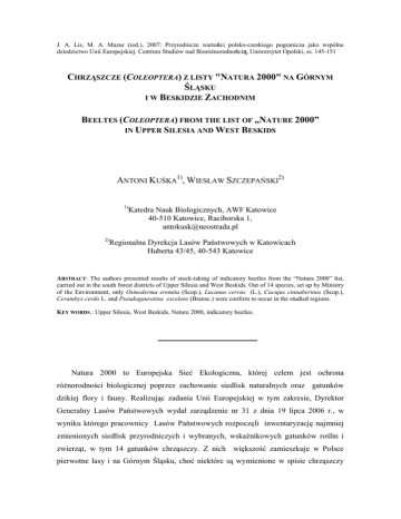 J. A. Lis, M. A. Mazur (red.), 2007: Przyrodnicze wartości polsko-czeskiego pogranicza jako wspólne dziedzictwo Unii Europejskiej. Centrum Studiów nad BioróŜnorodnością, Uniwersytet Opolski, ss. 145-151 CHRZĄSZCZE (COLEOPTERA) Z LISTY "NATURA 2000" NA GÓRNYM ŚLĄSKU I W BESKIDZIE ZACHODNIM BEELTES (COLEOPTERA) FROM THE LIST OF „NATURE 2000” IN UPPER SILESIA AND WEST BESKIDS ANTONI KUŚKA1), WIESŁAW SZCZEPAŃSKI2) 1) 2) Katedra Nauk Biologicznych, AWF Katowice 40-510 Katowice, Raciborska 1, [email protected] Regionalna Dyrekcja Lasów Państwowych w Katowicach Huberta 43/45, 40-543 Katowice ABSTRACT: The authors presented results of stock-taking of indicatory beetles from the “Natura 2000” list, carried out in the south forest districts of Upper Silesia and West Beskids. Out of 14 species, set up by Ministry of the Environment, only Osmoderma eremita (Scop.), Lucanus cervus (L.), Cucujus cinnaberinus (Scop.), Cerambyx cerdo L. and Pseudogaurotina excelens (Bransc.) were confirm to occur in the studied regions. KEY WORDS.: Upper Silesia, West Beskids, Nature 2000, indicatory beetles. Natura 2000 to Europejska Sieć Ekologiczna, której celem jest ochrona róŜnorodności biologicznej poprzez zachowanie siedlisk naturalnych oraz gatunków dzikiej flory i fauny. Realizując zadania Unii Europejskiej w tym zakresie, Dyrektor Generalny Lasów Państwowych wydał zarządzenie nr 31 z dnia 19 lipca 2006 r., w wyniku którego pracownicy Lasów Państwowych rozpoczęli inwentaryzację najmniej zmienionych siedlisk przyrodniczych i wybranych, wskaźnikowych gatunków roślin i zwierząt, w tym 14 gatunków chrząszczy. Z nich większość zamieszkuje w Polsce pierwotne lasy i na Górnym Śląsku, choć niektóre są wymienione w spisie chrząszczy śląskich J. Rogera (1856) i Gerhardta (1910), obecnie nie występują. Autorzy uwzględnili dane dotyczące występowania chrząszczy z listy Natura 2000 w północnych Czechach i na Morawach. W niniejszym doniesieniu uwzględniono informacje z nadleśnictw połoŜonych w południowej części Regionalnej Dyrekcji Lasów Państwowych w Katowicach, które są połoŜone po północnej stronie Bramy Morawskiej. Pierwszy z autorów przeprowadził inwentaryzację w nadleśnictwach Rybnik, Kobiór, Rudy Raciborskie i Rudziniec. Stanowiska w Czeskiej Republice dodatkowo określono numerami kodu, polskie stanowiska numeracją kodu UTM. Przegląd systematyczny Carabidae Carabus variolosus Fabricius, 1787 – biegacz urozmaicony W Czeskiej Republice, kod, 6378; Ostry koło Trzyńca, w Śląsko-Morawskich Beskidach, 20 VIII 1994 r. leg. A. Kuśka. 6576 Čeladná, Podolánky 660 m, 1 ex., coll. Muzea Beskid (Petřik, Roháčová 1997). 6478 Hrčava, Gírová, 1 ex, 8.07.94, coll. Muzea Beskid (Roháčová, Židková, 2002). CA62 Ndl. Bielsko, leśn. Wielka Łąka, oddz. 132, 1 ok. 19 VII 2007, leg. A. Herczek; Ndl. Jeleśnia, CV79 Sopotnia Górna, oddz. 179c, VI 2007, 3 ok. obs. A. Bosak, leśn. Kiełbasów, oddz. 186j, 1 ok. obs. W. Szczepański; Ndl. CV69 Węgierska Górka, śabnica, 43b,1 ok. det. Szafraniec, Prusów oddz. 121b 1 ok., det. G. Jarosiewicz. Ndl. Sucha, CA90 Lachowice, oddz. 251c, V 2007, obs. H. Cieślar, Mosorne, oddz. 423a, g, pojedyncze okazy, obs. S. Szafraniec. Z Górnego Śląska znany z nielicznych, sprzed wielu lat podawanych stanowisk: CA46 Krasiejów (osada włączona do Jankowic Rudzkich) (Kelch 1846), CA66 Murcki (dzielnica Katowic) (Nowotny 1931). Scarabaeidae Osmoderma eremita (Scopoli, 1763) – pachnica dębowa W Muzeum w Frydku Mistku, w Czeskiej Republice, znajdują się okazy z następujących miejscowości: 6175 Ostrava, Třebovice, Stonava, Paskov, Havířov, Terlico, Dolní Lomná. W trakcie inwentaryzacji stwierdzono kilkanaście stanowisk pachnicy: Ndl. Sucha, CA91 Mucharz, oddz. 121a, 1 ok. VII 2007, leg. T. Biel. Nadl.Ustroń, leśn. CA41 Pierściec, kilka okazów wyhodował z próchnowisk olszy czarnej W. Ziebura. W Ndl. Rudy Raciborskie, w parku przypałacowym w CA16 Rudach złowiono imago 22 V 2007 r. leg. A. Kuśka. Larwy tego gatunku odkryto w próchnie dębowym w Rudach w ośrodku wypoczynkowym Buk. Występuje teŜ, stwierdzono larwy ostatniego stadium w dwóch dębach, w rezerwacie ŁęŜczok w miejscowości CA05 Markowice. W Ndl. Rybnik pachnicę stwierdzono w parku przypałacowym i otaczających lasach w CA34 śory Baranowice, jeden okaz dowodowy z tego stanowiska w zbiorze pierwszego z autorów, z datą 30 VII 1974 r. Obecna inwentaryzacja wykazała obecność larw w starym dębie w lesie w pobliŜu miejscowości CA15 śytna, wcześniej leśniczy obserwował tam imagines. W Ndl. Kobiór pachnicę stwierdzono w dziuplach na terenie rezerwatu hodowlanego Ŝubrów "śubrowisko" w CA54 Jankowice, oddz. 64b i 63f, i poza rezerwatem w oddz. 54f - 3 larwy w ostatnim stadium rozwojowym, 20 VII 2007. Z tego ostatniego miejsca zachowały się zdjęcia imago i larw sprzed trzech lat wykonane przez pracowników nadleśnictwa. CA53 Ćwiklice, w starych dębach nad rzeką Pszczynką, obs. z V. 2007 r. M. Matusiński. W Ndl. Rudziniec sprawdzono wcześniej zarejestrowane miejsca przez p. Z. Chrula, w którego kolekcji znajdują się liczne okazy dowodowe. Pachnica występuje na następujących stanowiskach: obręb CA17 Lachowice, oddz. 144b, 238b,d, 74b; obręb CA18 Pławniowice, oddz. 224 Kleszczów, rez. PłuŜnica oddz. 137a, CA22 Paczyna, oddz. 44, 240a, b, g, 243a, 242b, 239. Ndl. Kędzierzyn, leśn. BA97 Pokrzywnica, oddz. 284g, V. 2007, martwy okaz , det. W. Erd. Lucanidae Lucanus cervus (Linnaeus, 1758) – jelonek rogacz J. Roger (1856) w swoim spisie chrząszczy Górnego Śląska o jelonku pisze "wszędzie na dębach". Gerhard (1910) wymienia ten gatunek z następujących miejscowości: Cieszyn, Ostrawa Pasków, Opawa, Rudy, Racibórz po Nową Sól. Z okresu ostatniego półwiecza znane są okazy z Republiki Czeskiej znajdujące się w Muzeum w Frydku Mistku: 6177 Stonawa, 17.06.1967, i 6276 Haví