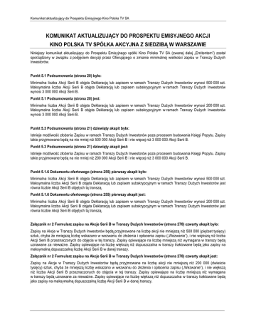 Komunikat aktualizujący do Prospektu Emisyjnego Kino Polska TV SA KOMUNIKAT AKTUALIZUJĄCY DO PROSPEKTU EMISYJNEGO AKCJI KINO POLSKA TV SPÓŁKA AKCYJNA Z SIEDZIBĄ W WARSZAWIE Niniejszy komunikat aktualizujący do Prospektu Emisyjnego spółki Kino Polska TV SA (zwanej dalej „Emitentem”) został sporządzony w związku z podjęciem decyzji przez Oferującego o zmianie minimalnej wielkości zapisu w Transzy DuŜych Inwestorów. Punkt 5.1 Podsumowania (strona 20) było: Minimalna liczba Akcji Serii B objęta Deklaracją lub zapisem w ramach Transzy DuŜych Inwestorów wynosi 500 000 szt. Maksymalna liczba Akcji Serii B objęta Deklaracją lub zapisem subskrypcyjnym w ramach Transzy DuŜych Inwestorów wynosi 3 000 000 Akcji Serii B. Punkt 5.1 Podsumowania (strona 20) jest: Minimalna liczba Akcji Serii B objęta Deklaracją lub zapisem w ramach Transzy DuŜych Inwestorów wynosi 200 000 szt. Maksymalna liczba Akcji Serii B objęta Deklaracją lub zapisem subskrypcyjnym w ramach Transzy DuŜych Inwestorów wynosi 3 000 000 Akcji Serii B. Punkt 5.3 Podsumowania (strona 21) dziewiąty akapit było: Istnieje moŜliwość złoŜenia Zapisu w ramach Transzy DuŜych Inwestorów poza procesem budowania Księgi Popytu. Zapisy takie przyjmowane będą na nie mniej niŜ 500 000 Akcji Serii B i nie więcej niŜ 3 000 000 Akcji Serii B. Punkt 5.3 Podsumowania (strona 21) dziewiąty akapit jest: Istnieje moŜliwość złoŜenia Zapisu w ramach Transzy DuŜych Inwestorów poza procesem budowania Księgi Popytu. Zapisy takie przyjmowane będą na nie mniej niŜ 200 000 Akcji Serii B i nie więcej niŜ 3 000 000 Akcji Serii B. Punkt 5.1.6 Dokumentu ofertowego (strona 255) pierwszy akapit było: Minimalna liczba Akcji Serii B objęta Deklaracją lub zapisem w ramach Transzy DuŜych Inwestorów wynosi 500 000 szt. Maksymalna liczba Akcji Serii B objęta Deklaracją lub zapisem subskrypcyjnym w ramach Transzy DuŜych Inwestorów jest równa liczbie Akcji Serii B objętych tą transzą. Punkt 5.1.6 Dokumentu ofertowego (strona 255) pierwszy akapit jest: Minimalna liczba Akcji Serii B objęta Deklaracją lub zapisem w ramach Transzy DuŜych Inwestorów wynosi 200 000 szt. Maksymalna liczba Akcji Serii B objęta Deklaracją lub zapisem subskrypcyjnym w ramach Transzy DuŜych Inwestorów jest równa liczbie Akcji Serii B objętych tą transzą. Załącznik nr 2 Formularz zapisu na Akcje Serii B w Transzy DuŜych Inwestorów (strona 270) czwarty akapit było: Zapisy na Akcje w Transzy DuŜych Inwestorów będą przyjmowane na liczbę akcji nie mniejszą niŜ 500 000 (pięćset tysięcy) sztuk, chyba Ŝe mniejszą liczbę wskazano w wezwaniu do złoŜenia i opłacenia zapisu („Wezwanie”), i nie większą niŜ liczba Akcji Serii B przeznaczonych do objęcia w tej transzy. Zapisy opiewające na liczbę mniejszą niŜ wymagana w transzy będą uznawane za niewaŜne. Zapisy opiewające na liczbę większą niŜ dopuszczalna w transzy traktowane będą jako zapisy na maksymalną dopuszczalną liczbę Akcji Serii B w danej transzy. Załącznik nr 2 Formularz zapisu na Akcje Serii B w Transzy DuŜych Inwestorów (strona 270) czwarty akapit jest: Zapisy na Akcje w Transzy DuŜych Inwestorów będą przyjmowane na liczbę akcji nie mniejszą niŜ 200 000 (dwieście tysięcy) sztuk, chyba Ŝe mniejszą liczbę wskazano w wezwaniu do złoŜenia i opłacenia zapisu („Wezwanie”), i nie większą niŜ liczba Akcji Serii B przeznaczonych do objęcia w tej transzy. Zapisy opiewające na liczbę mniejszą niŜ wymagana w transzy będą uznawane za niewaŜne. Zapisy opiewające na liczbę większą niŜ dopuszczalna w transzy traktowane będą jako zapisy na maksymalną dopuszczalną liczbę Akcji Serii B w danej transzy. Komunikat aktualizujący do Prospektu Emisyjnego Kino Polska TV SA Emitent – Kino Polska TV S.A. Piotr Reisch Bogusław Kisielewski Prezes Zarządu Członek Zarządu Komunikat aktualizujący do Prospektu Emisyjnego Kino Polska TV SA Oferujący – NOBLE Securities SA Dominik Ucieklak Norbert Kozioł I Wiceprezes Zarządu Wiceprezes Zarządu