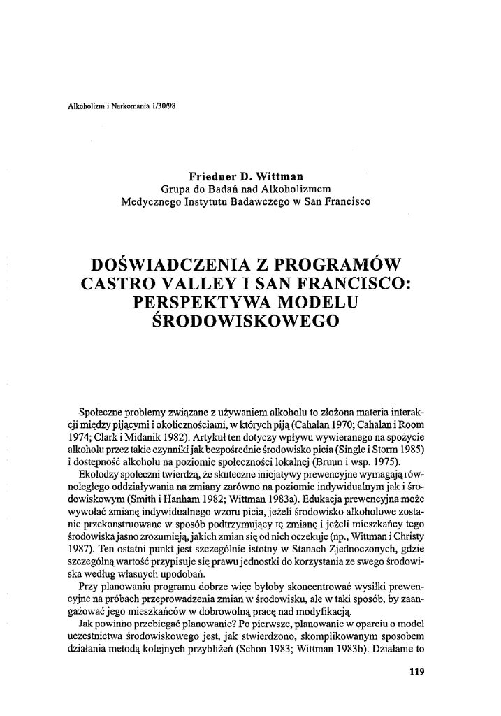 Etap wstępny (1982-1983). SFPP rozpoczął sięjako wspólny projekt dwóch miejskich agencji badawczych w San Francisco: Alcohol Research Group [Grupa badań
