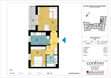 1. Przedpokój 2. Kuchnia 3. Pokój 4. Pokój 5. Łazienka 6