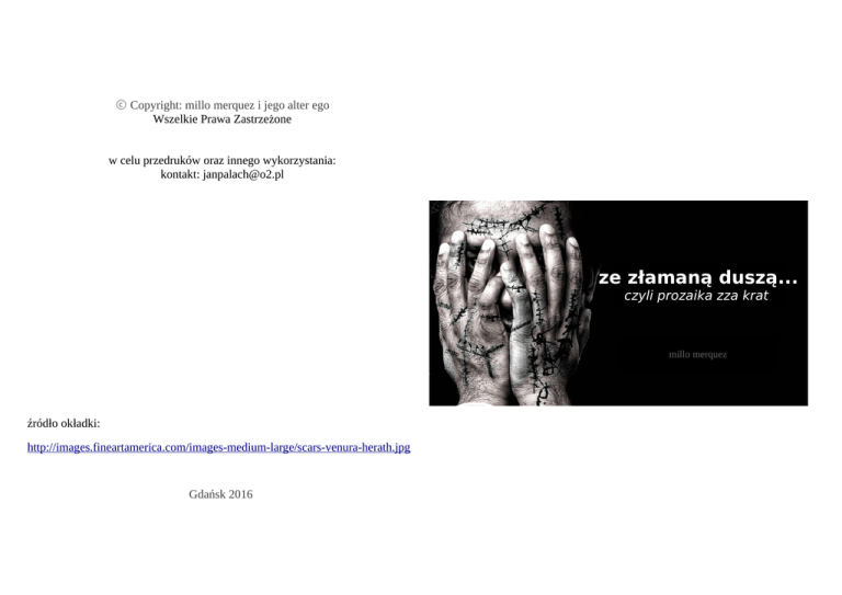 ⓒ Copyright: millo merquez i jego alter ego Wszelkie Prawa Zastrzeżone w celu przedruków oraz innego wykorzystania: kontakt: [email protected] ze złamaną duszą... czyli prozaika zza krat millo merquez źródło okładki: http://images.fineartamerica.com/images-medium-large/scars-venura-herath.jpg Gdańsk 2016 Rozdział 1 – Nóż w wodzie „Świat dzieli się na dwie połowy, z tym jednak, że w jednej z nich jest nie do życia, w drugiej nie do wytrzymania.” [M.Hłasko] Początki są trudne, jednak trudniejszy jest koniec. Wyglądał dość chojracko, pewnie miał w swoim życiu niejednego gnata. A w więzieniu i szpitalu wciąż czekał na andzię, czyli jakąś amnestię lub wolność nieważne jaką. W sumie nigdy nie mówił, ile ma do końca, pewnie w jego przypadku nie było końca... Kobiet miał wiele. Nawet za kratami ciągle dzwoniły do niego i godzinami snuł z nimi smęty3 – jednak tak to robił, że kobiety biegały4 z nim i przysyłały mu regularnie walizy 5 z żarciem, a w żarciu ukryty hajc6. Również szlugi7 miał zawsze przednie i nigdy nie widziałem, aby prosił lub brał jak inni częstowali. Miał zawsze swoje. Był człowiekiem poważnym, choć często się uśmiechał tubalnym głosem, często chodził w tą i z powrotem po korytarzu gwarząc z kimś równie charakternym jak on lub nawijał smutki8 z komórki z jakąś mamą9, która była niedawno na oddziale wyżej i depresyjnie się w nim zakochała. Później dzwonili do siebie i rozmawiali jak piękni dwudziestoletni narzeczeni w rozłące. Pierwszy raz, gdy go ujrzałem, wiedziałem, że to gość z Mokotowa 10 i ma bliznę na duszy z przeszłości, którą w wieczność, a na pewno do śmierci, będzie nosić. Później utwierdziłem się i sam nie wiem, jakie musiał mieć plecy, że był w szpitalu, a nie w więzieniu. Ktoś komuś coś, że kilka lat temu - jak sądzę - dostał się do psychuszki11, chociaż nie był z Swego czasu na oddziale pewnego szpitala psychiatrycznego był zatrzymany człowiek. W zasadzie mało mówił o sobie. Gdy przyszło mu odpowiadać, to mówił półsłówkami. Jednak wiadomo było, że był kryminalistą. Miał kropkę, a nawet dwie – z tego co pamiętam - tuż przy oczach. Nie będę teraz zgadywać, czy były to kropki wytatuowane przy lewym czy prawym oku. Może były to dwie kropki takie, że ten człowiek był kiedyś prawym, a później zszedł na drogę występku – lub było 2 obraźliwe pojęcie, degradujące określenie osoby zmuszanej w więzieniach do odbywania stosunków odwrotnie... A może uprawiał grypserę1 i nauczał, albo wręcz przeciwnie. seksualnych z innymi współwięźniami. opowieści Nie wyglądał na cwela2, ale na zbója pełną gębą. Może sprzedał kogoś na 34 nudne chodzić, być w związku 5 paczki wolności, a potem był wierny i charakterny. Sam nie wiem. 1 (z niem. – Grips – pot. rozum) – język środowiskowy środowisk przestępczych[1] na gruncie języka polskiego, szczególny przypadek argotu. Powstała najprawdopodobniej w XIX wieku na terenie zaboru rosyjskiego, jako miejsce jej powstania podawany jest Zakład Karny na „Gęsiówce” w Warszawie[2]. Początkowo pełniła funkcję głównie języka tajnego, gwary środowiskowej przestępców odsiadujących długoletnie wyroki. 2 6 pieniądze 7 papierosy 8 kłamać 9 kobieta 10 warszawski Areszt Śledczy (na Mokotowie) 11 sowieckie ośrodki, które łączyły funkcje szpitali i zwykłych więzień, w których we wspólnych celach przetrzymywano osoby rzeczywiście chore i skazane za morderstwa i gwałty ze zdrowymi osadzonymi na podstawie fałszywych ekspertyz lekarskich na zlecenie KGB. niego palmus12. Był jednym z bardziej zrównoważonych osób, jakie w kulturystyczna, w tatuażach, trzymająca niezdarnie karty w ręku i życiu spotkałem, a na pewno osób w psychiatrykach, jakie mi było poznać. spoglądająca na nie w okularach. Często grał w karty, w tysiąca i zazwyczaj ogrywał innych. Musiał być z dobrej parafii, czyli gang o nim musiał pamiętać. A jak wiadomo - na tym oddziale Ordynator często rozmawiał z papugami13, dlatego miał najnowszego SUVa marki BMW i uwierzcie, że pięknie się w nim prezentował, tak że niejeden zbój musiał się u niego leczyć. Ordynator był ludzki i zbójów14 nierokujących i zbyt pewnych siebie posyłał z powrotem za kratki. Oddział ten był swego rodzaju czyśćcem, w którym można było spędzić rok, dwa lata, lub kilka dni zaledwie. Ale również można było w nim sczeznąć nie ujrzawszy już światła dziennego bez krat. Raz młodzian, z którym się zakolegowałem, był się wyczyścić również. To była dziwna sprawa, jednak on trafił z powrotem do katorgi 15, pomimo że było wszystko „na dobrej drodze”. Przekombinował i trafił znowu do piekła odsiadki. Pamiętam jak dziś, że często do młodziaków mówił: „Ja więcej spędziłem czasu w transportach16 niż ty lat masz, szczeniaku”. Pewnie to utarty tekst przez braci17, aby ustawić świeżaka18. Był bardzo inteligentnym człowiekiem, tak samo jak i wysportowanym. Jego tatuaże, prawie na cały korpusie – z przodu, jak i z tyłu na plecach - były majstersztykiem, a wręcz profesurą w działaniu19. Pamiętam jak dziś, że tematem przewodnim był jasper, czyli błazen. Złowrogi, ale i roześmiany szyderczo jak w talii kart joker. Ironicznie wygląda postać ogolona, 12 więzień specjalizujący się w udawaniu zaburzeń psychicznych 13 adwokat 14 przestępców 15 w carskiej Rosji ciężkie przymusowe roboty (połączone z zesłaniem na odległe tereny Imperium - zwykle Syberię). 16 przeworzenie więźniów z jednego miejsca do drugiego, zwykle więzień 17 wspólnota grypsująca 18 Nowy więzieńw celi 19 W tatuowaniu 3 W młodości miał grać w pewnym klubie w piłkę nożną, jednak po kontuzji kolana klub nie chciał opłacić operacji... I tak stał się liderem pseudokibiców i widocznie na jednej z us