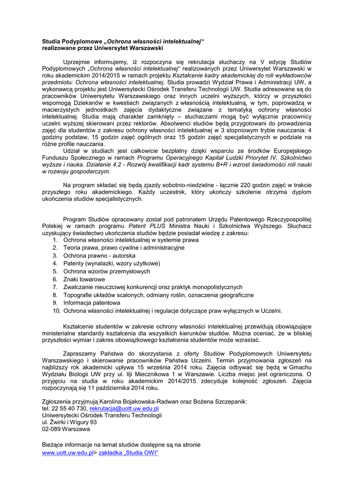 Studia Podyplomowe „Ochrona własności intelektualnej“ realizowane przez Uniwersytet Warszawski Uprzejmie informujemy, iż rozpoczyna się rekrutacja słuchaczy na V edycję Studiów Podyplomowych „Ochrona własności intelektualnej“ realizowanych przez Uniwersytet Warszawski w roku akademickim 2014/2015 w ramach projektu Kształcenie kadry akademickiej do roli wykładowców przedmiotu: Ochrona własności intelektualnej. Studia prowadzi Wydział Prawa i Administracji UW, a wykonawcą projektu jest Uniwersytecki Ośrodek Transferu Technologii UW. Studia adresowane są do pracowników Uniwersytetu Warszawskiego oraz innych uczelni wyższych, którzy w przyszłości wspomogą Dziekanów w kwestiach związanych z własnością intelektualną, w tym, poprowadzą w macierzystych jednostkach zajęcia dydaktyczne związane z tematyką ochrony własności intelektualnej. Studia mają charakter zamknięty – słuchaczami mogą być wyłącznie pracownicy uczelni wyższej skierowani przez rektorów. Absolwenci studiów będą przygotowani do prowadzenia zajęć dla studentów z zakresu ochrony własności intelektualnej w 3 stopniowym trybie nauczania: 4 godziny podstaw, 15 godzin zajęć ogólnych oraz 15 godzin zajęć specjalistycznych w podziale na różne profile nauczania. Udział w studiach jest całkowicie bezpłatny dzięki wsparciu ze środków Europejskiego Funduszu Społecznego w ramach Programu Operacyjnego Kapitał Ludzki Priorytet IV, Szkolnictwo wyższe i nauka. Działanie 4.2 - Rozwój kwalifikacji kadr systemu B+R i wzrost świadomości roli nauki w rozwoju gospodarczym. Na program składać się będą zjazdy sobotnio-niedzielne - łącznie 220 godzin zajęć w trakcie przyszłego roku akademickiego. Każdy uczestnik, który ukończy szkolenie otrzyma dyplom ukończenia studiów specjalistycznych. Program Studiów opracowany został pod patronatem Urzędu Patentowego Rzeczypospolitej Polskiej w ramach programu Patent PLUS Ministra Nauki i Szkolnictwa Wyższego. Słuchacz uzyskujący świadectwo ukończenia studiów będzie posiadał wiedzę z zakresu: 1. Ochrona własności intelektualnej w systemie prawa 2. Teoria prawa, prawo cywilne i administracyjne 3. Ochrona prawno - autorska 4. Patenty (wynalazki, wzory użytkowe) 5. Ochrona wzorów przemysłowych 6. Znaki towarowe 7. Zwalczanie nieuczciwej konkurencji oraz praktyk monopolistycznych 8. Topografie układów scalonych, odmiany roślin, oznaczenia geograficzne 9. Informacja patentowa 10. Ochrona własności intelektualnej i regulacje dotyczące praw wyłącznych w Uczelni. Kształcenie studentów w zakresie ochrony własności intelektualnej przewidują obowiązujące ministerialne standardy kształcenia dla wszystkich kierunków studiów. Można oceniać, że w bliskiej przyszłości wymiar i zakres obowiązkowego kształcenia studentów może wzrastać. Zapraszamy Państwa do skorzystania z oferty Studiów Podyplomowych Uniwersytetu Warszawskiego i skierowanie pracowników Państwa Uczelni. Termin przyjmowania zgłoszeń na najbliższy rok akademicki upływa 15 września 2014 roku. Zajęcia odbywać się będą w Gmachu Wydziału Biologii UW przy ul. Ilji Miecznikowa 1 w Warszawie. Liczba miejsc jest ograniczona. O przyjęciu na studia w roku akademickim 2014/2015 zdecyduje kolejność zgłoszeń. Zajęcia rozpoczynają się 11 października 2014 roku. Zgłoszenia przyjmują Karolina Bojakowska-Radwan oraz Bożena Szczepanik: tel. 22 55 40 730, [email protected] Uniwersytecki Ośrodek Transferu Technologii ul. Żwirki i Wigury 93 02-089 Warszawa Bieżące informacje na temat studiów dostępne są na stronie www.uott.uw.edu.pl> zakładka „Studia OWI”
