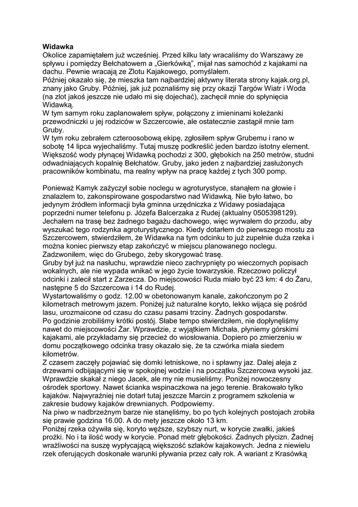 Widawka Okolice zapamiętałem juŜ wcześniej. Przed kilku laty wracaliśmy do Warszawy ze spływu i pomiędzy Bełchatowem a „Gierkówką”, mijał nas samochód z kajakami na dachu. Pewnie wracają ze Zlotu Kajakowego, pomyślałem. Później okazało się, Ŝe mieszka tam najbardziej aktywny literata strony kajak.org.pl, znany jako Gruby. Później, jak juŜ poznaliśmy się przy okazji Targów Wiatr i Woda (na zlot jakoś jeszcze nie udało mi się dojechać), zachęcił mnie do spłynięcia Widawką. W tym samym roku zaplanowałem spływ, połączony z imieninami koleŜanki przewodniczki u jej rodziców w Szczercowie, ale ostatecznie zastąpił mnie tam Gruby. W tym roku zebrałem czteroosobową ekipę, zgłosiłem spływ Grubemu i rano w sobotę 14 lipca wyjechaliśmy. Tutaj muszę podkreślić jeden bardzo istotny element. Większość wody płynącej Widawką pochodzi z 300, głębokich na 250 metrów, studni odwadniających kopalnię Bełchatów. Gruby, jako jeden z najbardziej zasłuŜonych pracowników kombinatu, ma realny wpływ na pracę kaŜdej z tych 300 pomp. PoniewaŜ Kamyk zaŜyczył sobie noclegu w agroturystyce, stanąłem na głowie i znalazłem to, zakonspirowane gospodarstwo nad Widawką. Nie było łatwo, bo jedynym źródłem informacji była gminna urzędniczka z Widawy posiadająca poprzedni numer telefonu p. Józefa Balcerzaka z Rudej (aktualny 0505398129). Jechałem na trasę bez Ŝadnego bagaŜu dachowego, więc wyrwałem do przodu, aby wyszukać tego rodzynka agroturystycznego. Kiedy dotarłem do pierwszego mostu za Szczercowem, stwierdziłem, Ŝe Widawka na tym odcinku to juŜ zupełnie duŜa rzeka i moŜna koniec pierwszy etap zakończyć w miejscu planowanego noclegu. Zadzwoniłem, więc do Grubego, Ŝeby skorygować trasę. Gruby był juŜ na nasłuchu, wprawdzie nieco zachrypnięty po wieczornych popisach wokalnych, ale nie wypada wnikać w jego Ŝycie towarzyskie. Rzeczowo policzył odcinki i zalecił start z Zarzecza. Do miejscowości Ruda miało być 23 km: 4 do śaru, następne 5 do Szczercowa i 14 do Rudej. Wystartowaliśmy o godz. 12.00 w obetonowanym kanale, zakończonym po 2 kilometrach metrowym jazem. PoniŜej juŜ naturalne koryto, lekko wijąca się pośród lasu, urozmaicone od czasu do czasu pasami trzciny. śadnych gospodarstw. Po godzinie zrobiliśmy krótki postój. Słabe tempo stwierdziłem, nie dopłynęliśmy nawet do miejscowości śar. Wprawdzie, z wyjątkiem Michała, płyniemy górskimi kajakami, ale przykładamy się przecieŜ do wiosłowania. Dopiero po zmierzeniu w domu początkowego odcinka trasy okazało się, Ŝe ta czwórka miała siedem kilometrów. Z czasem zaczęły pojawiać się domki letniskowe, no i spławny jaz. Dalej aleja z drzewami odbijającymi się w spokojnej wodzie i na początku Szczercowa wysoki jaz. Wprawdzie skakał z niego Jacek, ale my nie musieliśmy. PoniŜej nowoczesny ośrodek sportowy. Nawet ścianka wspinaczkowa na jego terenie. Brakowało tylko kajaków. Najwyraźniej nie dotarł tutaj jeszcze Marcin z programem szkolenia w zakresie budowy kajaków drewnianych. Podpowiemy. Na piwo w nadbrzeŜnym barze nie stanęliśmy, bo po tych kolejnych postojach zrobiła się prawie godzina 16.00. A do mety jeszcze około 13 km. PoniŜej rzeka oŜywiła się, koryto węŜsze, szybszy nurt, w korycie zwałki, jakieś proŜki. No i ta ilość wody w korycie. Ponad metr głębokości. śadnych płycizn. śadnej wraŜliwości na suszę wypłycającą większość szlaków kajakowych. Jedna z niewielu rzek oferujących doskonałe warunki pływania przez cały rok. A wariant z Krasówką pewnie pływalny przy temperaturze znacznie poniŜej zera stopni Celsjusza. Gdzieś tam na kamienistym proŜku omijającym młyn spływamy wykonując gwałtowny zwrot pod katem prostym. Górale spływają gładko, tylko leniwy Michał, który nie załoŜył fartucha w Kalabrii, nabiera wody i musi spuścić zatopiony kajak. Dalej to juŜ ciągły wyścig na bardzo szybkim nurcie, często poprzegradzanym schodzącymi się łozami. Naprawdę trzeba płynąć uwaŜnie. Nie spodziewałem się, Ŝe ta Widawka będzie aŜ tak urozmaiconą rzeką. I Ŝadnych kajakarzy. No, moŜe jest trochę wymagającą rzeką, przynajmniej na tym odcinku. Fajnie, tylko ten czas coś się dłuŜy. Dochodzi godzina 19.00, a my jeszcze nie przepłynęliśmy tego dwugodzinnego odcinka. W końcu o godz. 19.30 docieramy do znajomej ławki, na planowanym polu biwakowym, gdzieś na 28 kilometrze internetowego opisu. Jak zliczyłem trasę, zrozumiałem przyczynę tego wolnego tempa. Te 23 km planowane na sobotę wydłuŜyły się do 35 km. Wszystko jasne. Nie wziąłem pod uwagę, Ŝe mam do czynienia z kawalarzem. Niech mu tam. Ma u mnie piwo. Za urodę rzeki oczywiście. Wieczorem dowiadujemy się, Ŝe właściciel gospodarstwa agroturystycznego gotów jest przygotować pole biwakowe, na zamówienie przygotować barana na ognisko, tylko z tymi kajakarzami coś sucho. Następnego dnia witają nas klimaty Kostrzynia (łozy), później klimaty Liwca, szeroki jaz i ciasny, zakrzaczony odcinek lewej odnogi na trzy kilometry przed ujściem do Warty. Spotkani poniŜej dwaj kajakarze w markowych polietylenach, opowiedzieli nam, Ŝe w prawej odnodze musieli płynąć wpław trzymając się rufy kajaka. Musiało być tam strasznie. Zgodnie z zaleceniami opisu szlaku, kończymy na plaŜy w Pstrokoniach. Dzisiejsze 20 kilometrów przepłynęliśmy sprawnie. Metę osiągnęliśmy o godz. 14.00. Wszystko dzięki Oli. Ciągle podkręcała tempo, a nam nie wypadało zostawać z tyłu. Przyjedziemy tutaj jeszcze. Gruby juŜ nas zaprosił na wiosnę. Wtedy moŜna płynąć Widawką z Kuźnicy. TeŜ, tylko 23 kilometry dziennie.