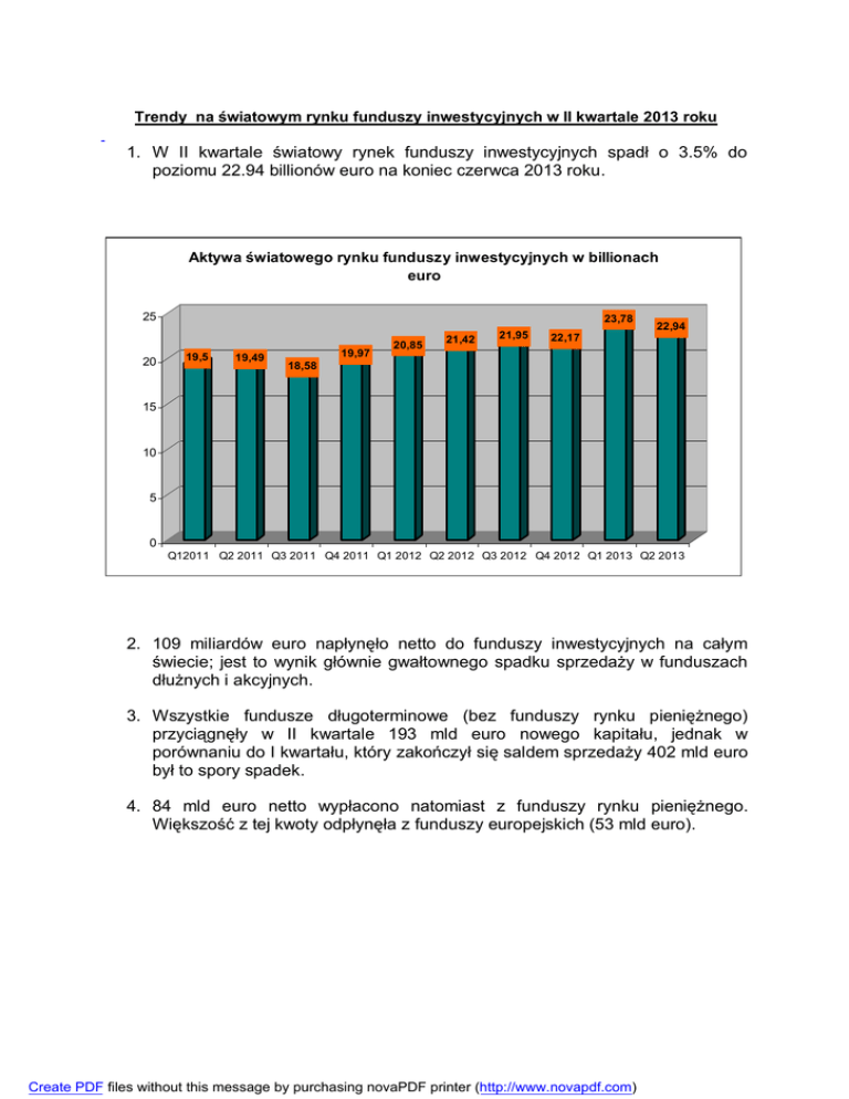 Trendy na światowym rynku funduszy inwestycyjnych w II kwartale 2013 roku 1. W II kwartale światowy rynek funduszy inwestycyjnych spadł o 3.5% do poziomu 22.94 billionów euro na koniec czerwca 2013 roku. Aktywa światowego rynku funduszy inwestycyjnych w billionach euro 25 20 23,78 19,5 19,49 19,97 20,85 21,42 21,95 22,94 22,17 18,58 15 10 5 0 Q12011 Q2 2011 Q3 2011 Q4 2011 Q1 2012 Q2 2012 Q3 2012 Q4 2012 Q1 2013 Q2 2013 2. 109 miliardów euro napłynęło netto do funduszy inwestycyjnych na całym świecie; jest to wynik głównie gwałtownego spadku sprzedaży w funduszach dłużnych i akcyjnych. 3. Wszystkie fundusze długoterminowe (bez funduszy rynku pieniężnego) przyciągnęły w II kwartale 193 mld euro nowego kapitału, jednak w porównaniu do I kwartału, który zakończył się saldem sprzedaży 402 mld euro był to spory spadek. 4. 84 mld euro netto wypłacono natomiast z funduszy rynku pieniężnego. Większość z tej kwoty odpłynęła z funduszy europejskich (53 mld euro). Create PDF files without this message by purchasing novaPDF printer (http://www.novapdf.com) Tabela 1. Sprzedaż netto funduszy inwestycyjnych na świecie (mld euro) Grupa funduszy III kwartał 2012 IV kwartał 2012 I kwartał 2013 II kwartał 2013 Akcji -43 14 109 28 Dłużne 146 163 143 31 Rynku pieniężnego -9 106 -82 -84 Mieszane/Zrównowa żone Inne 38 33 74 57 35 53 76 76 175 263 402 193 167 369 320 109 Fundusze długoterminowe SUMA 5. Aktywa funduszy akcyjnych stanowiły 38% a aktywa funduszy dłużnych 23% wszystkich aktywów funduszy na świecie na koniec II kwartału. Struktura światowego rynku funduszy inwestycyjnych według aktywów grup funduszy Akcyjne 13% 38% 15% Dłużne Mieszane/Zrównoważone Gotówkowe i rynku pieniężnego 11% 23% Pozostałe 6. Udział poszczególnych krajów/regionów sprzedaży funduszy: USA (50,2%), Europa (28.3%), Brazylia (5,3%), Australia (5,2%), Kanada (3,7%), Japonia (3,4%), Chiny (1,3%), Republika Korei (0,9%), Południowa Afryka (0,5%), Indie (0,4%). Create PDF files without this message by purchasing novaPDF printer (http://www.novapdf.com) Udział (% ) krajów/regionów w światowym rynku funduszy inwestycyjnych 0,5 0,9 1,3 5,2 USA Europa 3,7 3,4 Brazylia 5,3 Australia Kanada 50,2 28,3 Japonia Chiny Republika Korei Południowa Afryka Materiał przygotowano na podstawie danych EFAMY www.efama.org Create PDF files without this message by purchasing novaPDF printer (http://www.novapdf.com)